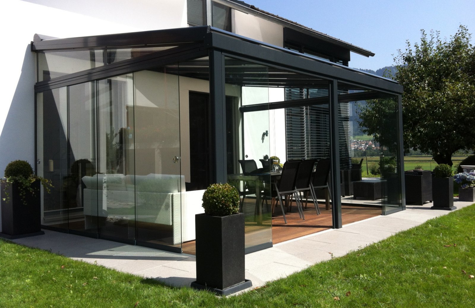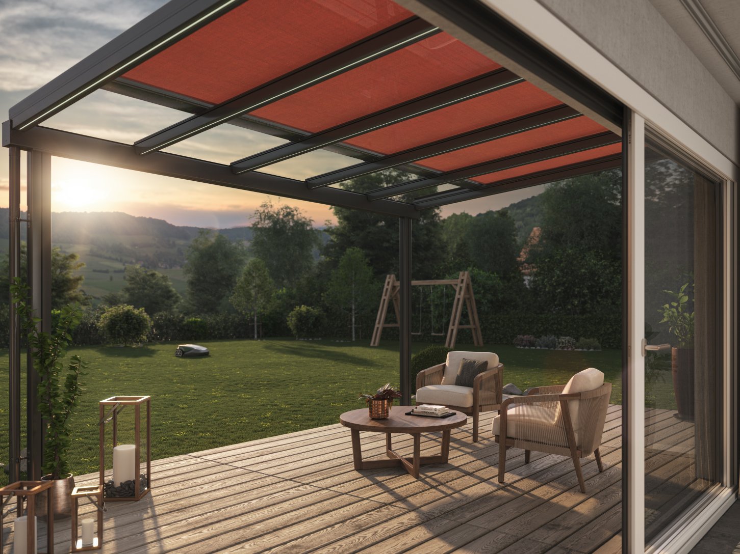 Unser Terrassendach ist als Glasdach beispielhaft. Das transparente Glasdach ist direkt an der Hauswand befestigt und ermöglicht die freie Sicht nach oben, ohne den Lichteinfall im Wohnraum zu unterbrechen. Es eignet sich hervorragend als permanenter Allwetterschutz, unter dem Möbel und Grill das ganze Jahr über aufbewahrt werden können. An heissen Sommertagen sorgt die Überdachmarkise für wirkungsvolle Abkühlung und Beschattung. Das filigrane und dennoch robuste Terrassendach fügt sich wunderbar in unterschiedlichste Architekturen ein. Damit eignet es sich ideal für kleine bis mittelgrosse Gartensitzplätze sowie für Dachterrassen und schafft mit dimmbarer LED-Beleuchtung und seitlichen Vertikalstoffstoren das perfekte Lounge-Gefühl.