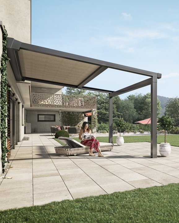 Eine Pergola ist in der Regel eine freistehende Terrassenüberdachung mit einem beweglichen Dach aus Stoff oder Aluminium. Ein Lamellendach beispielsweise sorgt für Schatten und dank beweglicher, stufenlos einstellbarer Lamellen für eine angenehme, natürliche Belüftung. Pergolen sind vor allem als Sonnen- und Regenschutz geeignet. Da bei Schneefall die Lamellen offenstehen sollten, ist eine Nutzung dann eher ungünstig. Die luftige Variante für Terrasse und Garten ist oft seitlich verglast und mit Sonnenstoren oder anderen Optionen verbunden.