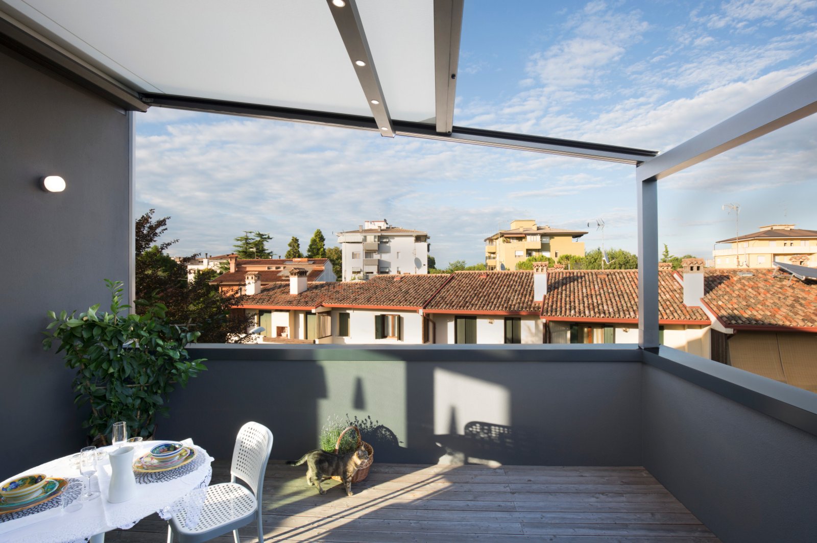 Das Terrassendach wird klassischerweise von Stützen getragen und ist an das Gebäude angebaut. Aus Glas lässt es das Licht in den Innenraum, ohne ihn zu verdunkeln. Mit einer Überdachmarkise ist auch der Sonnenschutz gewährleistet. Ähnlich wie eine Pergola ist auch eine überdachte Terrasse meist nicht rundum geschlossen, sondern teilweise oder ganz offen. Bei Bedarf schützen Seiten-/Glaswände vor Wind und unerwünschtem Einblick.