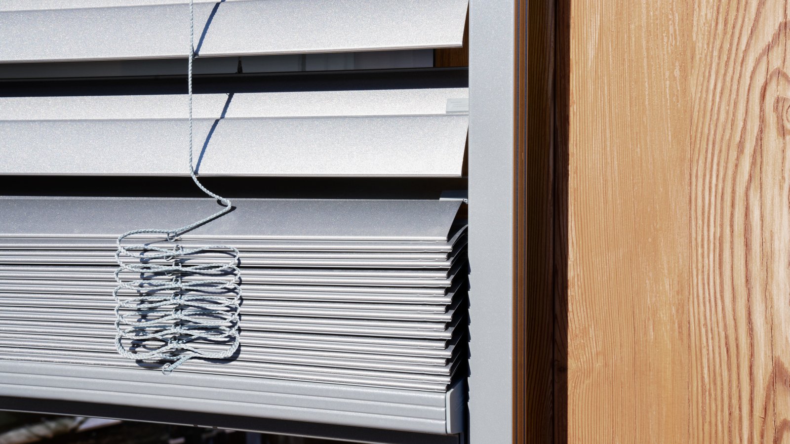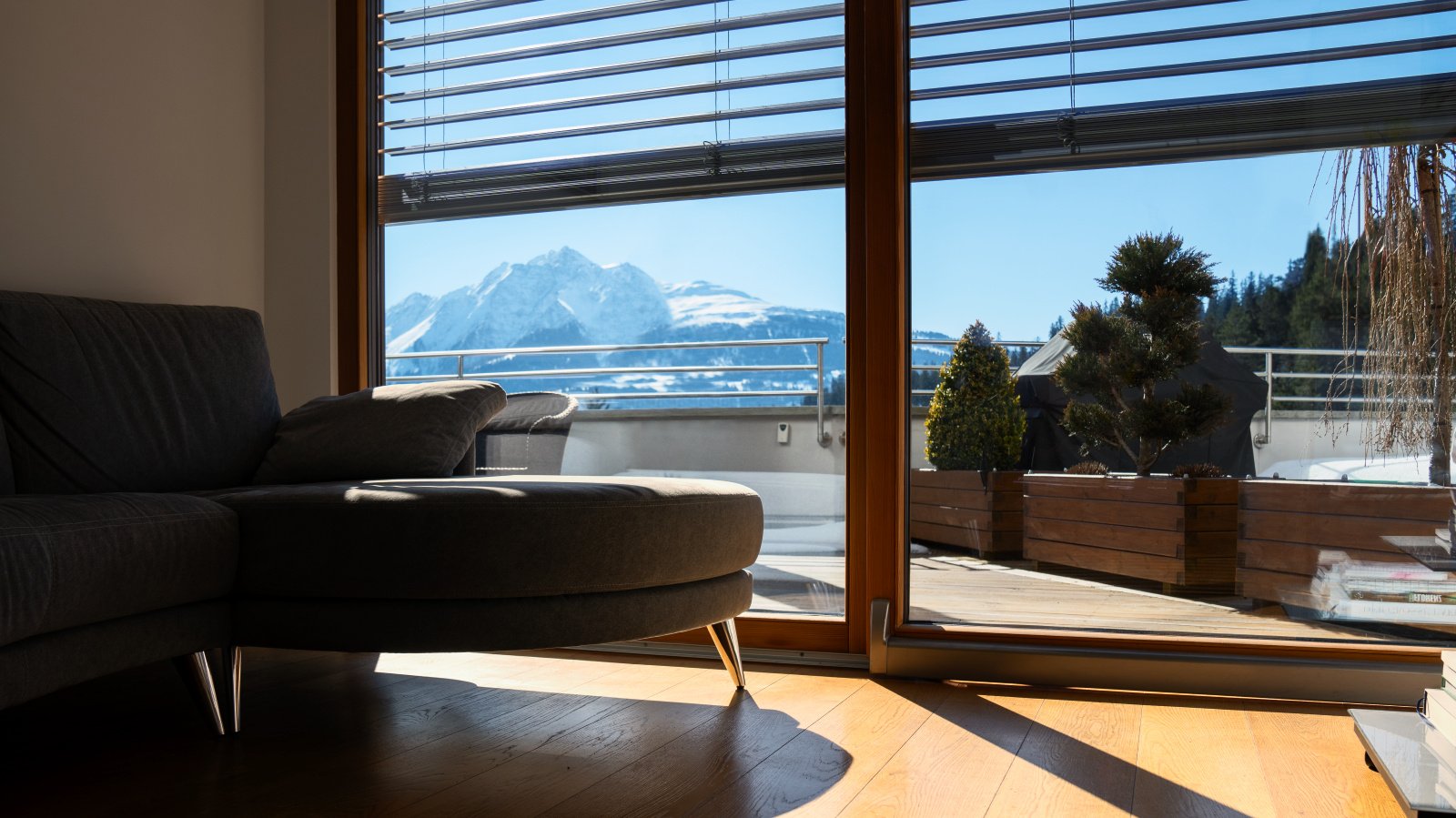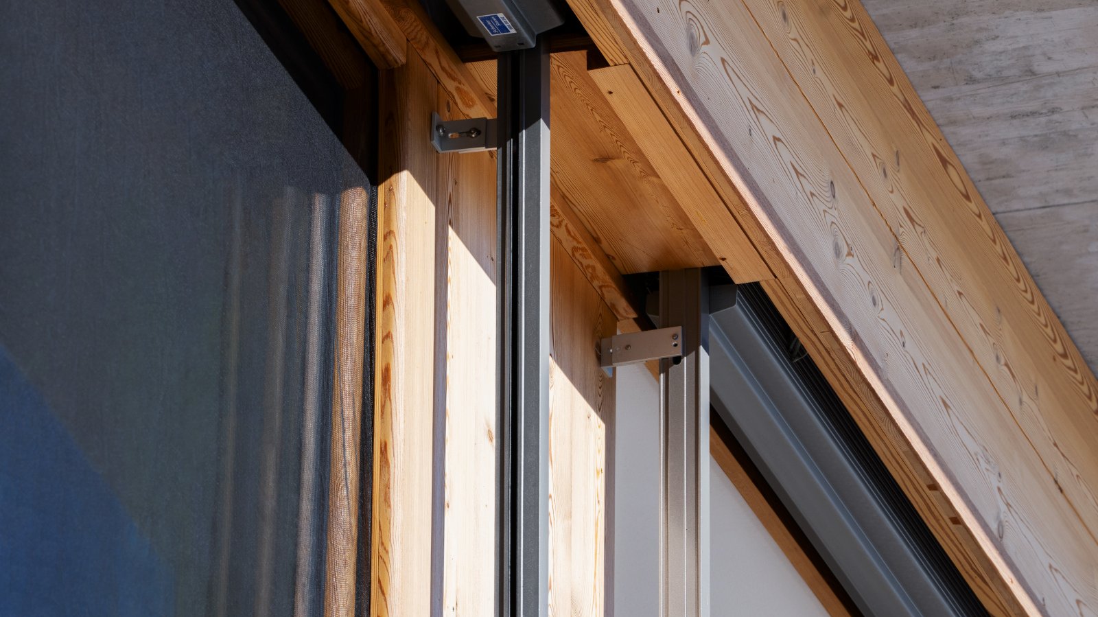 Passend zur luxuriösen Ausstrahlung der Residenz kommt hier die Metall-Verbundraffstore MV 90 zum Einsatz – ein raffiniertes Beschattungssystem für gehobene Ansprüche. Die hochwertige, wartungsarme Zahnriemenführung ist seitlich in den Führungen integriert. Da kein Aufzugsband durch die Lamellen geführt wird, erzielt sie eine maximale Abdunkelung und Wärmedämmung. Durch die spezielle Formgebung ihrer Lamellen ist mit der Metall-Verbundraffstore eine stufenlose und präzise Lichtsteuerung möglich. Das hier gewählte Grau Aluminium der Lamellen harmoniert mit der Fassade aus Naturstein und Holz. Die Lage der Residenz am Waldrand bietet viel Ruhe und Privatsphäre. Das ist ein grosser Standortvorteil. Da es sich um Ferienwohnungen handelt, wurde ein erhöhtes Augenmerk auf den Einschleichschutz gelegt. Auch deshalb ist die MV 90 eine ausgezeichnete Wahl. Sie ist dank einer Hochschiebesicherung in jeder Zwischenlage verriegelt. In Kombination mit einer speziellen Lamellenführung erfüllt sie dank ihrer aktiven Verriegelungstechnik erhöhte Sicherheitsanforderungen.