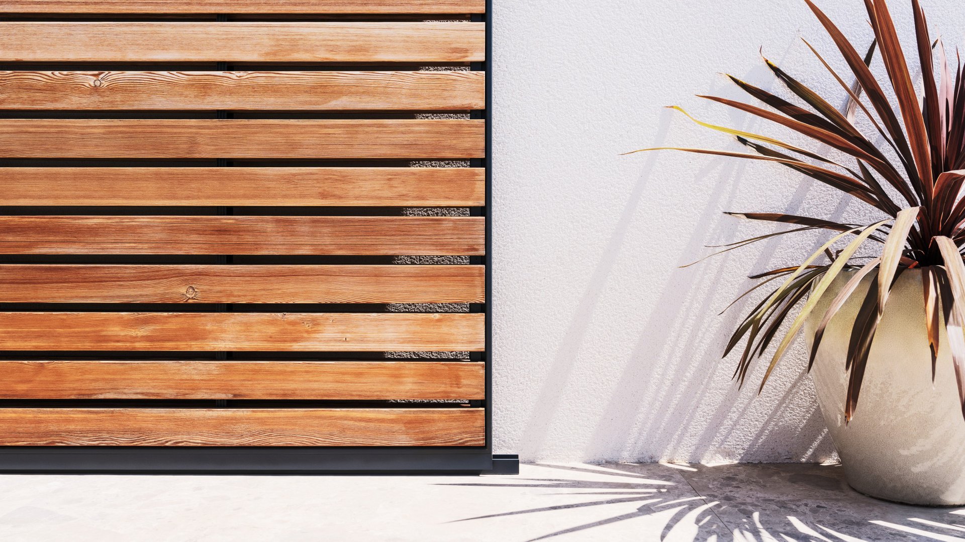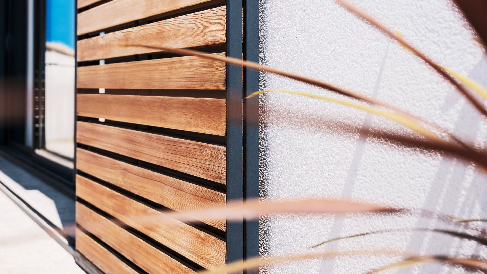 Das moderne Erscheinungsbild des Hauses wird durch die Schiebeläden zusätzlich geprägt. Die Läden fügen gemeinsam mit den sichtbar aufmontierten Führungsschienen harmonisch in das Fassadenbild ein und wirken als gestalterisches Element mit hoher Eigenständigkeit. Das Lärchenholz der Lamellen überzeugt dabei nicht nur optisch, sondern auch funktional: Es ist äusserst langlebig, weil formstabil und witterungsbeständig. Die solide Bauweise der gesamten Anlage macht Sicherungssysteme wie Windwächter überflüssig und ermöglicht selbst bei stärksten Winden eine exzellente Stabilität ohne jegliches Klappern.