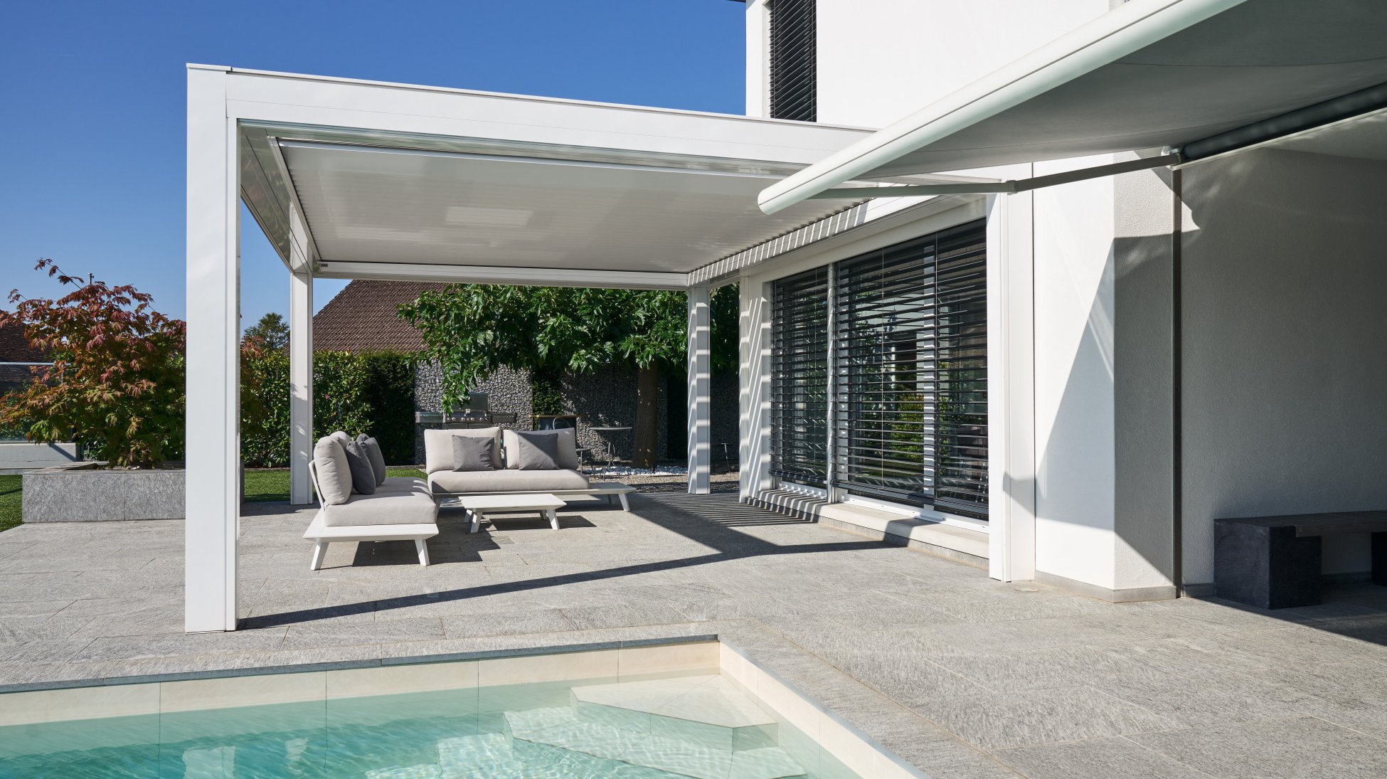 Die Outdoor-Lounge liegt an idealer Lage: zwei Schritte vom Pool entfernt und mit herrlicher Aussicht. Da sie sonnenexponiert ist, beschloss die Bauherrschaft, ein schattenspendendes Dach darüber zu setzen. Ein Dach, das auch bei Wetterunsicherheiten und abends schützt und bei Bedarf ganz offensteht. Mit diesem Wunsch wandten sich die Hausbewohner an Schenker Storen. Mit dem Unternehmen hatten sie bereits beim Bau des Wohnhauses vor 12 Jahren gute Erfahrungen gemacht. Damals versahen die Spezialisten für Wetterschutz die Fenster mit Metallverbundraffstoren und montierten eine Markise über der Verandatür. Die Wahl war rasch getroffen, denn eigentlich kam nur das Lamellendach des Typs LD 6 mit Skylife-Funktion in Frage.