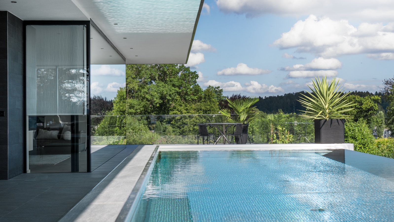 Das massgeschneiderte Beschattungskonzept wurde in enger Zusammenarbeit mit den Architekten erarbeitet. So erhielt beispielsweise die übers Eck laufende Ganzglasanlage im Wohnbereich ein in der Decke versenktes Rollosystem, welches allen Ansprüchen an technische Perfektion, Sicherheit und leichte Bedienmöglichkeiten entspricht. Für die sechs und eineinhalb Meter Länge wurden sechs Rollos nebeneinander montiert. Das Farbkonzept wurde ebenfalls perfekt auf die Inneneinrichtung abgestimmt. Ein leicht transparenter Rollostoff erlaubt auch tagsüber die Fernsicht und verdeckt nachts die schwarze Glasscheibe. In Kombination mit dem Beleuchtungskonzept entstand so ein besonders behagliches Ambiente. Alle Schlafzimmer sind mit Verbund-Raffstoren ausgestattet. Hochwertige Kassettenmarkisen auf der Südseite spenden Schatten für die ringsum laufenden Dachterrassen. Die gedeckten Terrassen im Parterre wiederum sind mit windstabilen Vertikalstoffstoren ausgestattet. Diese halten den Wind ab und bieten Blendschutz vor der tiefliegenden Abendsonne. Natürlich können sämtliche Beschattungselemente bequem mit dem Tablet und Mobile Phone über das Smart Home bedient werden. Verbunden mit der Wetterstation, fahren die Aussenbeschattungen automatisch hoch, sollten die Windgeschwindigkeiten zu stark werden.