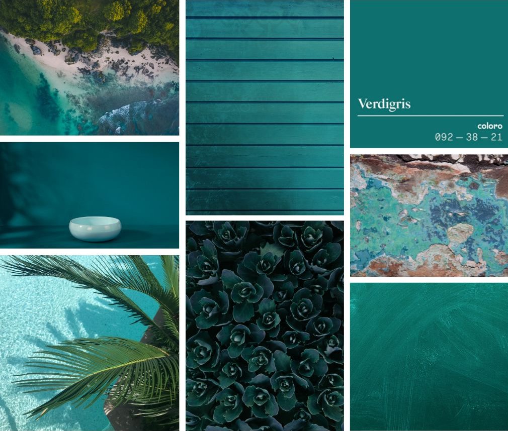 Die warme Farbe Verdigris hat ihren Namen einem grünlichen Pigment zu verdanken, das bei der Oxidation von Kupfer entsteht. Auf der Farbpalette liegt Verdigris zwischen Blau und Grün und erinnert an Sport- und Outdoorbekleidungen der 1980er-Jahre. Die Farbe weckt nostalgische Gefühle und steht für das Verlangen nach Rückkehr zur Natur, nach Unbeschwertheit und Unternehmungslust.