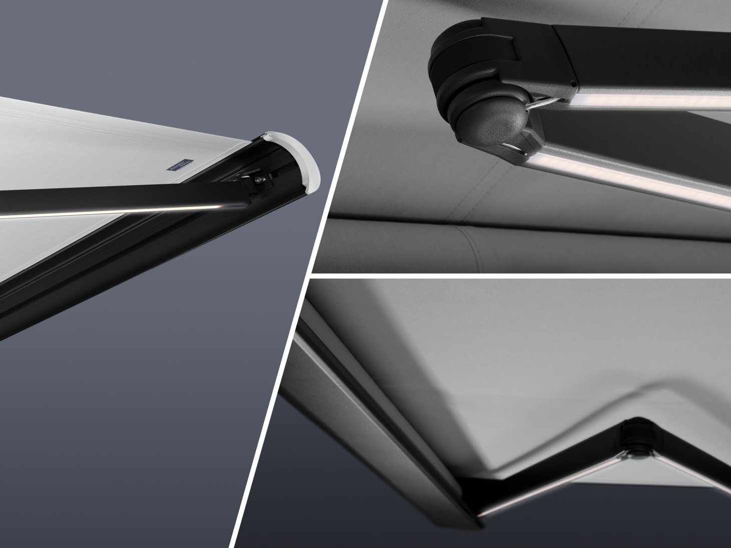 Simon Baumann: Auf den ersten Blick vermutet man es nicht, aber die LED-Beleuchtung besteht nicht nur aus Gelenkarmen mit den integrierten LEDs. Um die integrierte Beleuchtung zu ermöglichen, verbauen wir eine komplexe Komposition an Einzelteilen elegant in der Markise.