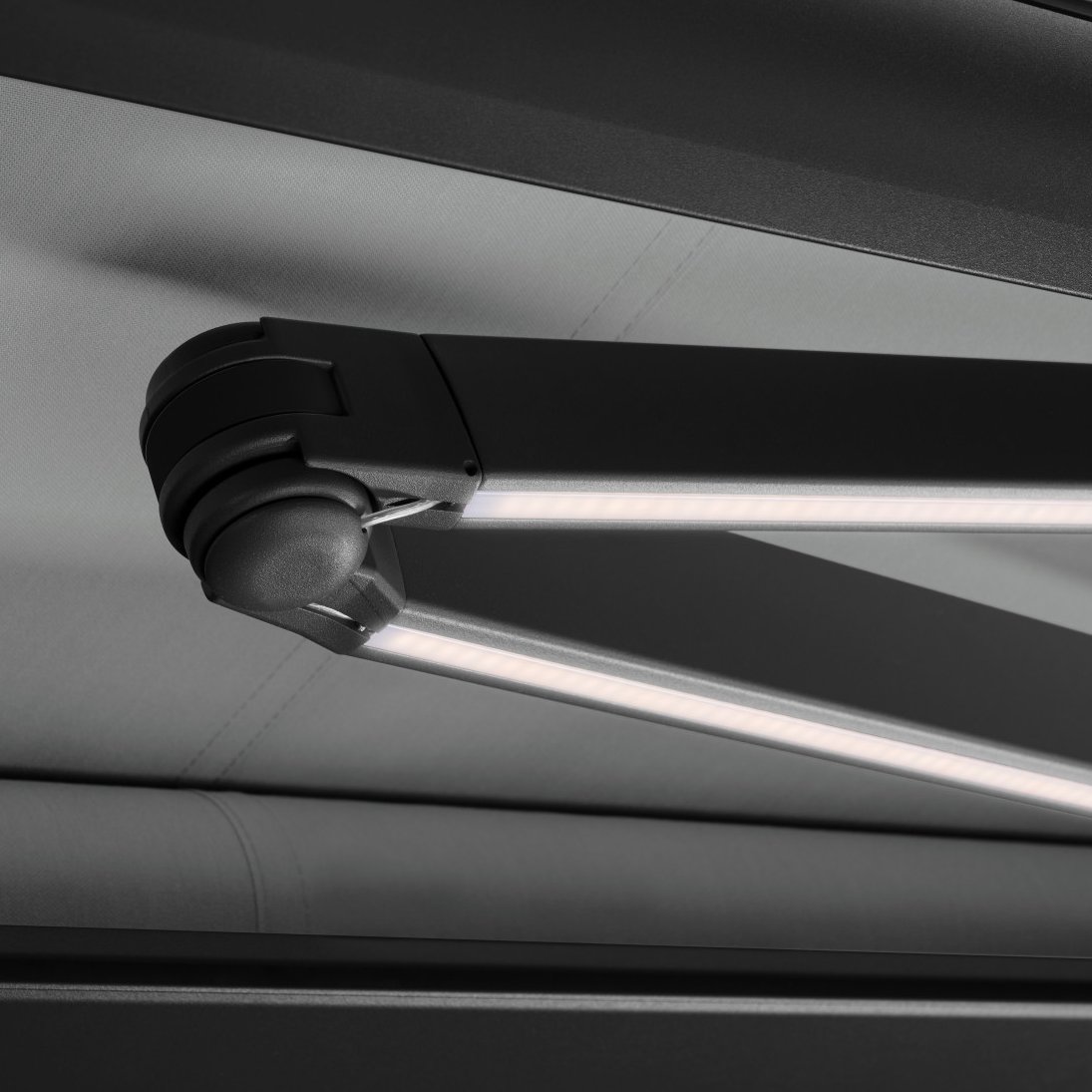 Simon Baumann: Einzelne Sonnenstoren haben die LED-Beleuchtung im Kastenprofil integriert. Ich fand schon immer eine Lösung in den Gelenkarmen sehr interessant, da man dadurch eine direkte Ausleuchtung von oben erreichen kann. Mit dem Projektstart für die neue Generation Gelenkarme haben wir die Chance wahrgenommen, für diese eine elegante LED-Beleuchtung zu entwickeln.