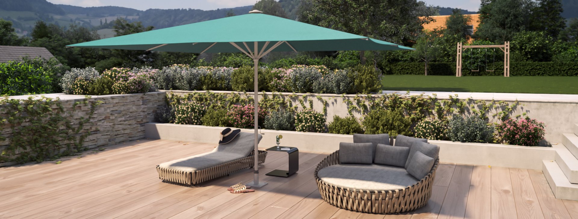 Unser Mittelmastschirm Filius macht auf Terrassen, Gärten und Balkonen eine hochwertige Beschattung spielerisch möglich. Dank seinem leichten Gewicht und seinem einfachen Handling eignet er sich zudem auch hervorragend für den Einsatz in Strassencafés, wo täglicher Auf- und Abbau sowie dekorativer Einsatz gefragt sind. Für Ihre persönlichen Wünsche bieten wir für Filius zahlreiche Ausführungen und verschiedene Abmessungen an. Er kann mit einer Vielzahl an hochwertigen Stoffen und Farben ausgestattet werden, besitzt ein leichtes Design und fügt sich ästhetisch und harmonisch in das Gesamtbild seiner Umgebung ein.