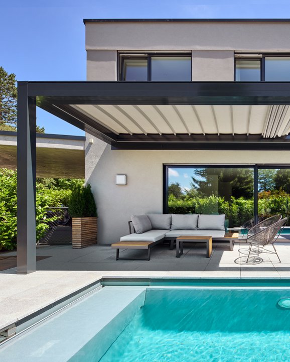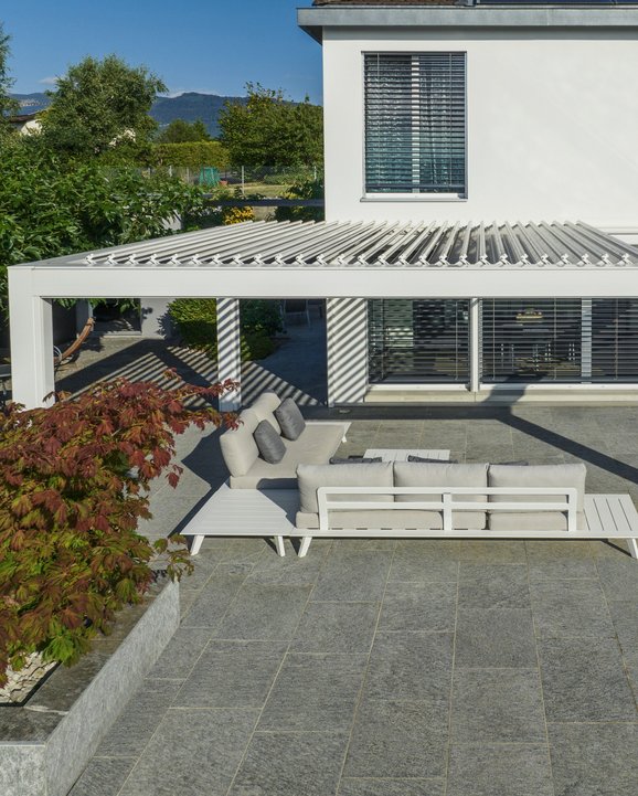 Das Terrassendach und die Pergola von Schenker Storen erzeugen wahre Outdoor-Living-Erlebnisse. Sie sind unsere Antwort, wenn es um die Erweiterung des Wohnraumes im Aussenbereich geht. Die Allwetterschutz-Lösungen spenden Schatten an sonnigen Tagen, leiten das Wasser sicher ab an regnerischen Tagen und fördern einen Luftaustausch für ein angenehmes Klima. Offensichtlich das geeignetste Produkt zur Verlängerung der Sommersaison. Die Terrassenüberdachungen (Pergola, Lamellendach, Terrassendach) können durch ihre flexiblen Abmessungen in Breite und Ausladung ganz nach Ihren persönlichen Bedürfnissen angepasst werden und bestechen durch ihr ästhetisches Design. Mit einer zusätzlichen LED-Beleuchtung und zahlreichen weiteren Komfort-Möglichkeiten ausgestattet, wird das Terrassendach und die Pergola zu Entspannungsoasen für jede Tages- und nahezu jede Jahreszeit.