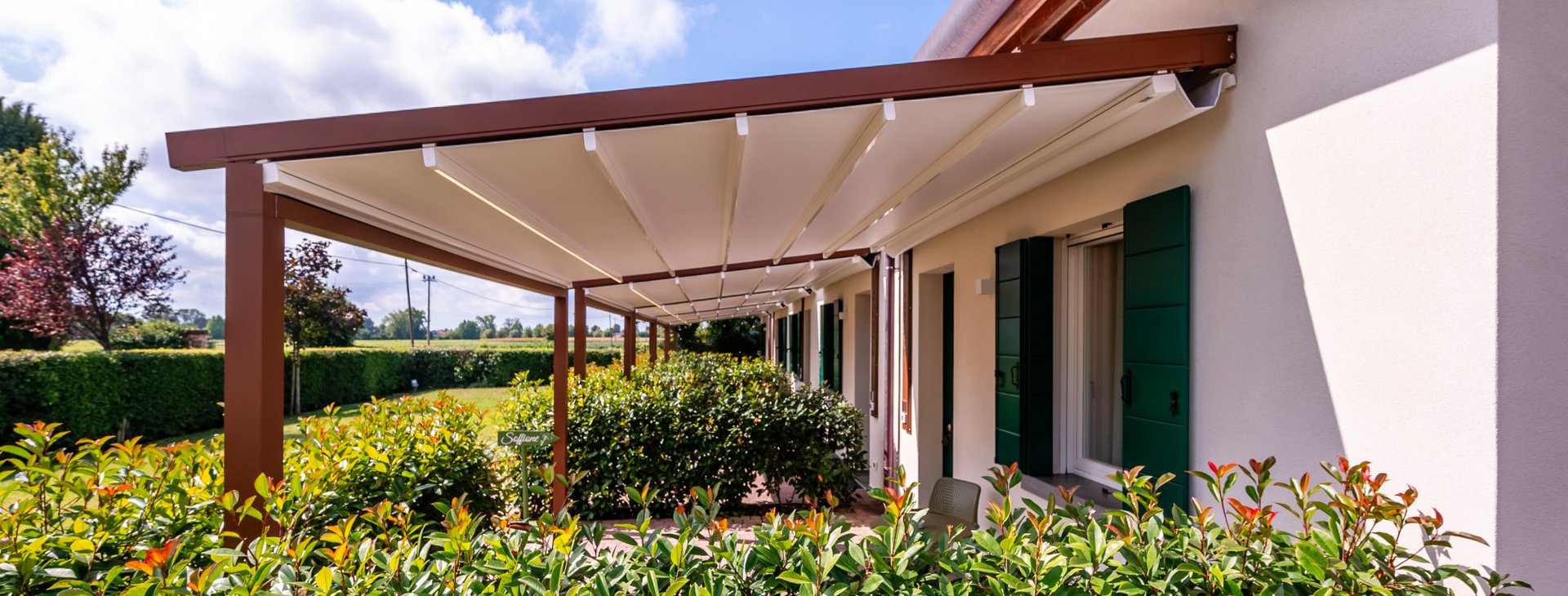 Die Faltpergola A100 Star überzeugt durch ihr elegant schräges Dach und wurde speziell für die Wandmontage entwickelt und eignet sich ideal für Terrassen jeglicher Art.