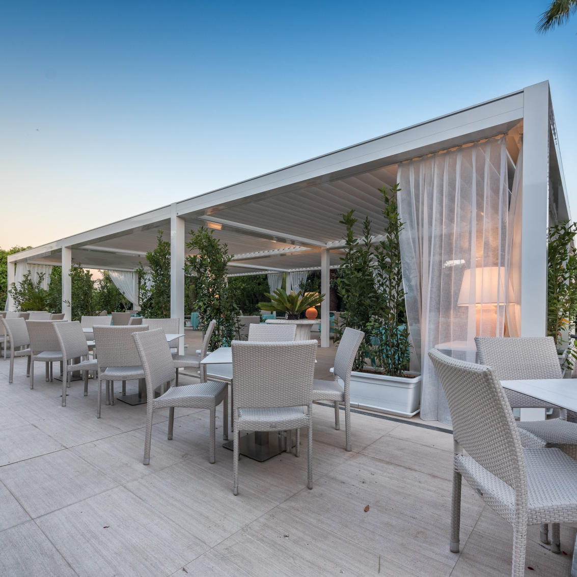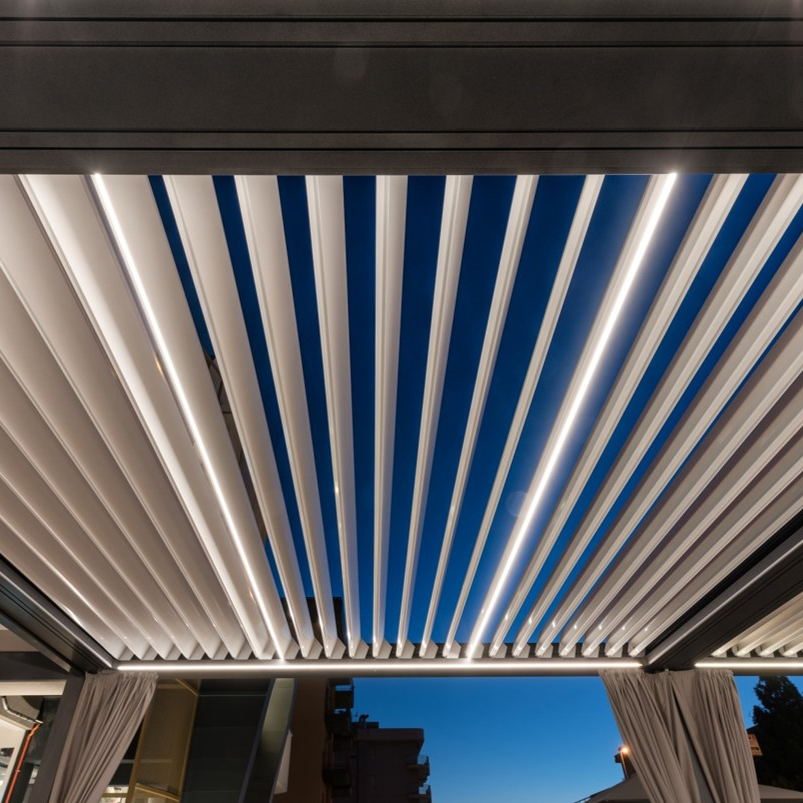 Unser bioklimatisches Lamellendach vereint Ästhetik und Raumklima mit einer raffinierten Technologie: Warmluft strömt nach oben durch die Lamellen ab, während kühlende Luft automatisch nach unten zu den Sitzplätzen gleitet. So sorgt unser Lamellendach stets für ideale Belüftungs- und Lichtverhältnisse und einen natürlichen Wärmeausgleich. Das Lamellendach ist die geeignete Allwetterschutz-Lösung für grossflächige Gärten und Terrassen und lässt sich mit vielen Komfort-Optionen wie integrierter LED-Beleuchtung und seitlichen Vertikalstoffstoren zur vollkommenen Oase erweitern. Es fügt sich optimal in jede Umgebung ein, ist wasserdicht und erzeugt mit seinen stufenlos rotierenden Lamellen stets und überall ein magisches Freilufterlebnis.