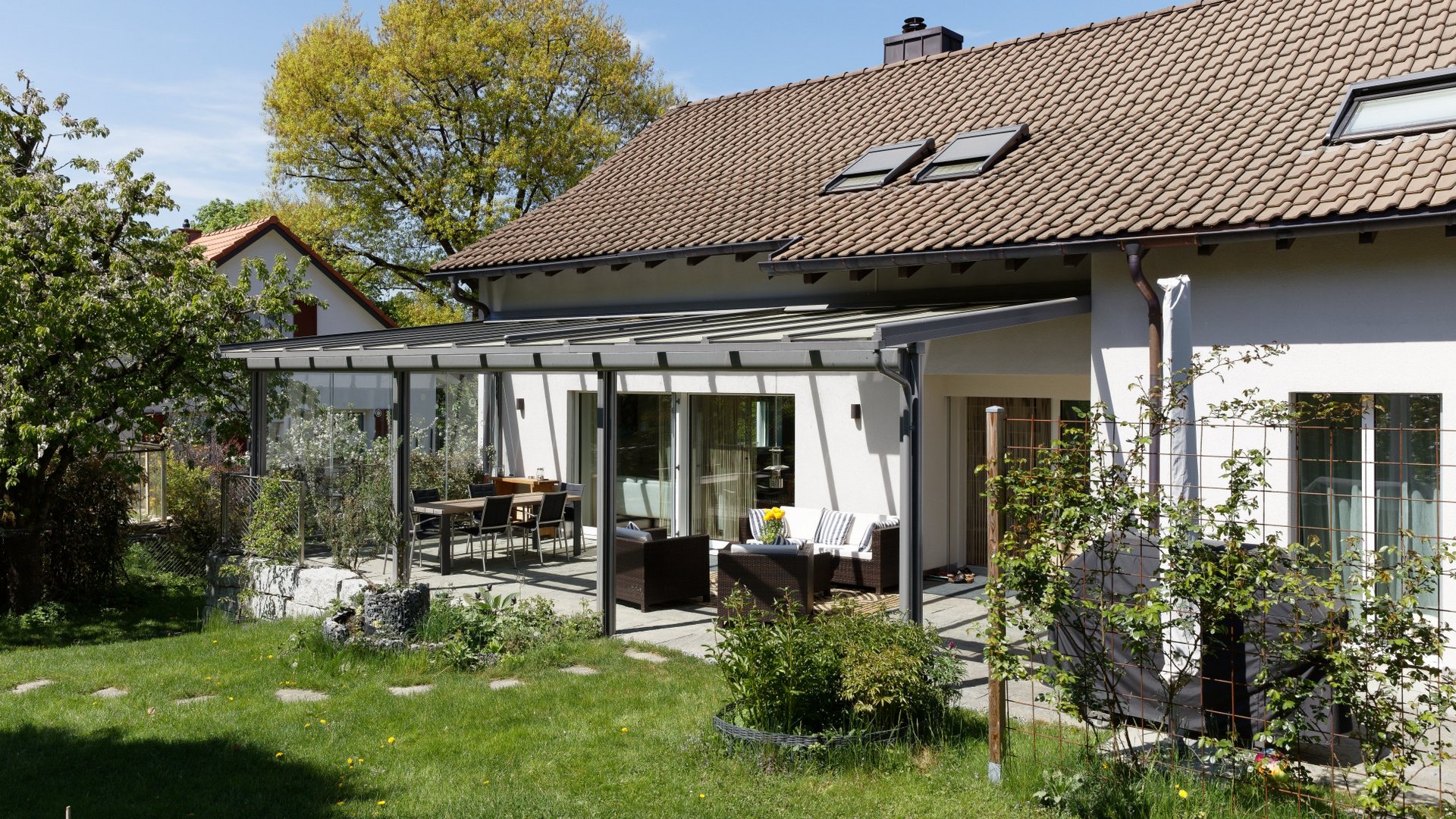 Unser Terrassendach ist als Glasdach beispielhaft. Das transparente Glasdach ist direkt an der Hauswand befestigt und ermöglicht die freie Sicht nach oben, ohne den Lichteinfall im Wohnraum zu unterbrechen. Es eignet sich hervorragend als permanenter Allwetterschutz, unter dem Möbel und Grill das ganze Jahr über aufbewahrt werden können. An heissen Sommertagen sorgt die Überdachmarkise für wirkungsvolle Abkühlung und Beschattung. Das filigrane und dennoch robuste Terrassendach fügt sich wunderbar in unterschiedlichste Architekturen ein. Damit eignet es sich ideal für kleine bis mittelgrosse Gartensitzplätze sowie für Dachterrassen und schafft mit dimmbarer LED-Beleuchtung und seitlichen Vertikalstoffstoren das perfekte Lounge-Gefühl.