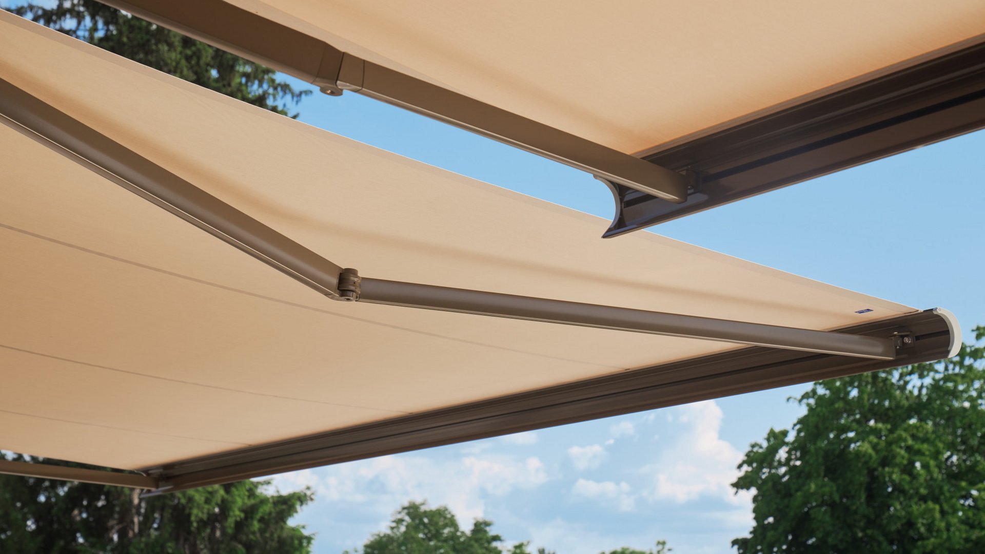 Die Kassettenmarkise 5 ist die kleine Schwester der KGM 6 und bietet mit ihrer maximalen Breite von 5 m und einer Ausladung bis zu 2,5 m insgesamt 12,5 m2 Beschattungsfläche an. Optisch identisch mit der KGM 6 unterscheidet sie sich lediglich in den leicht dezenteren Kassettenabmessungen. Im geschlossenen Zustand überzeugt sie mit ihrer flachen Bauweise von 13,6 cm und einer Tiefe von 26,4 cm inkl. Konsole. Diese Massangaben gelten bei Motorantrieb.
