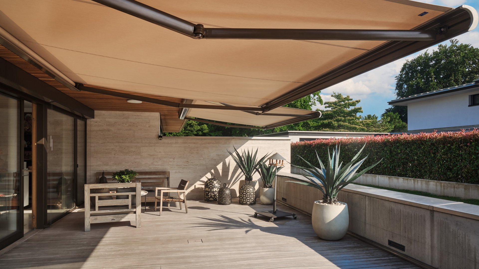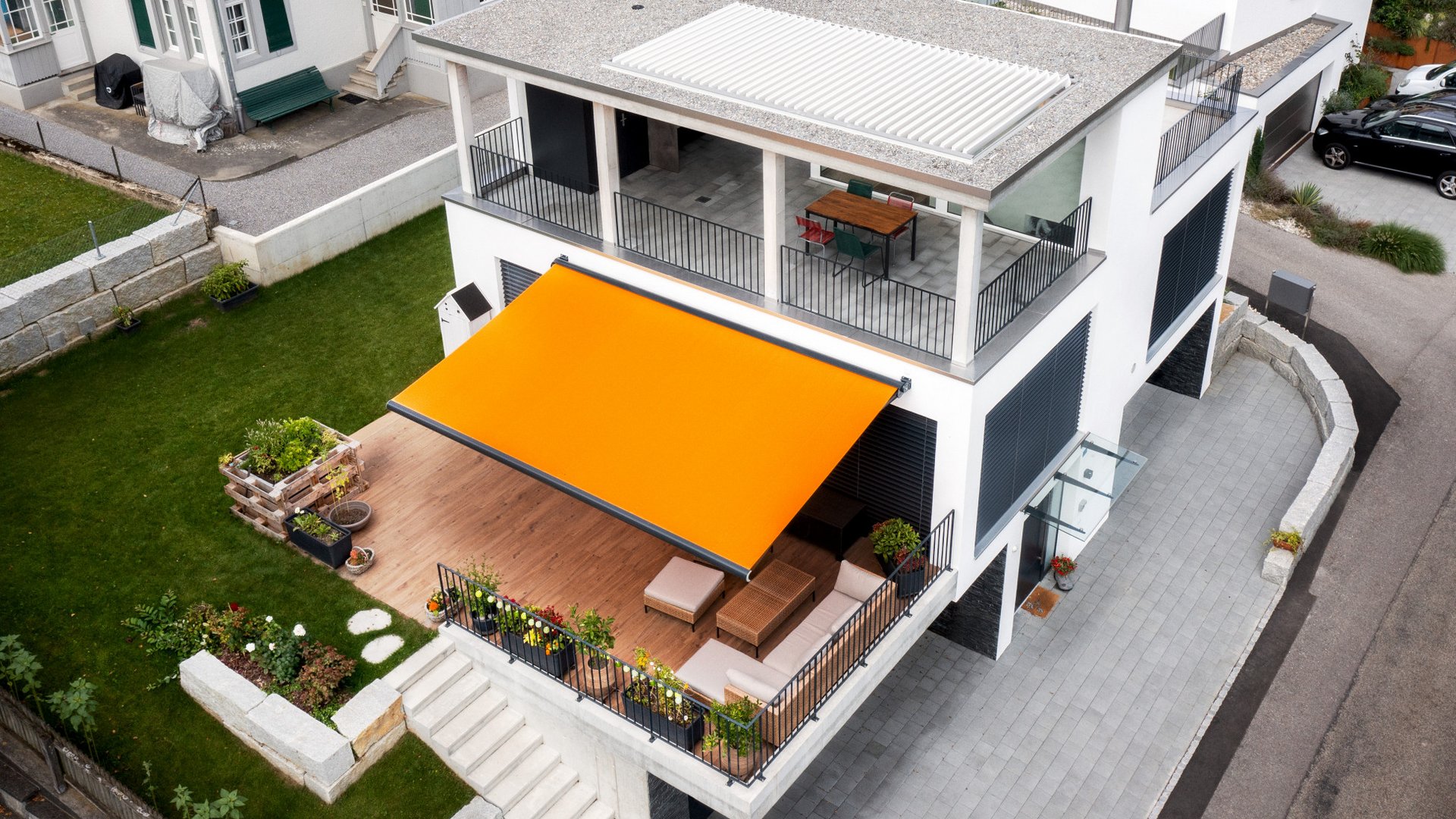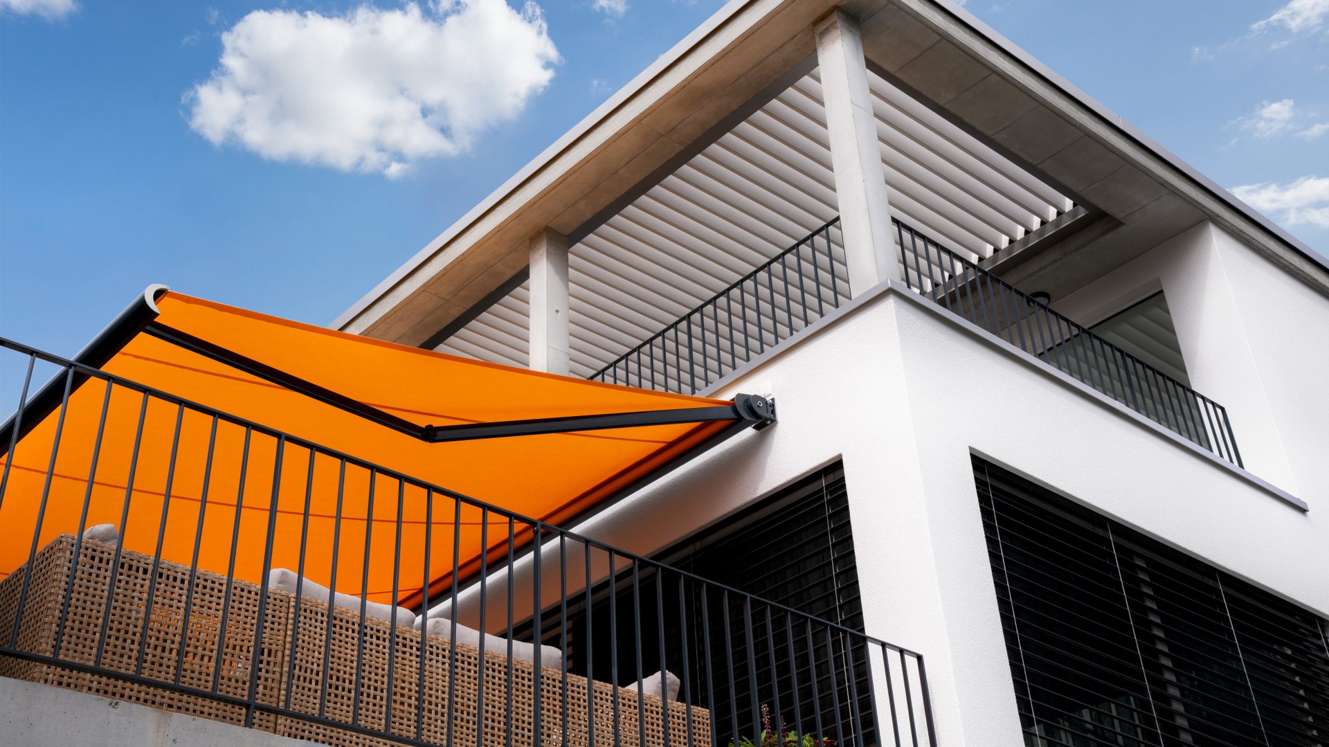 Die Kassettenmarkise ist unsere Antwort auf einen Rundumschutz von Tuch und Technik auf Terrasse und Balkon. Sie besitzt eine ellipsenförmige zeitlose Kassette, in der das Tuch im geschlossenen Zustand vollkommen vor Regen, Wind und Schmutz geschützt ist. Im geöffneten Zustand setzt sie das Tuch hervorragend in Szene und fügt sich durch die Zweipunktbefestigung mit einer dezenten Leichtigkeit ins Fassadenbild ein. Sie eignet sich ideal für kleine bis mittelgrosse Terrassen in Ein- und Mehrfamilienhäusern und kann farblich individuellen Wünschen angepasst werden.