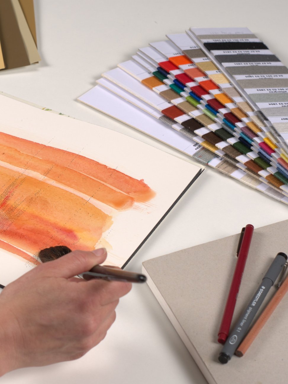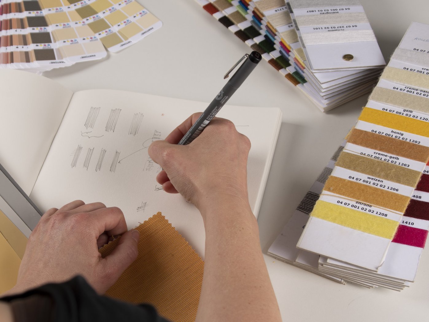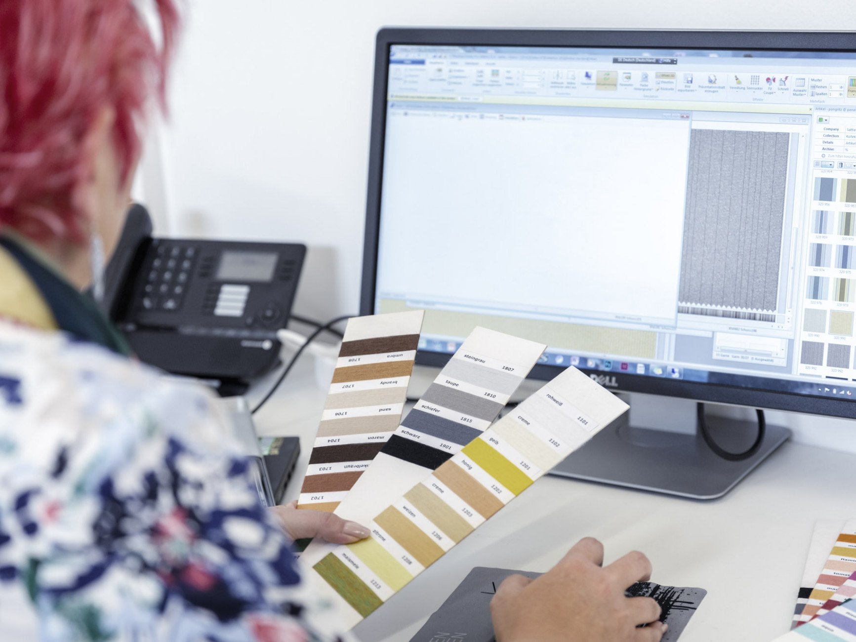 Mon travail a connu une évolution extrêmement passionnante, pour ainsi dire de l’analogique au numérique. La boîte de couleurs d’antan est maintenant le catalogue numérique de fils dans un programme de design spécialement conçu pour cela. Et les bandes de toile disposées et collées sur des bandes de carton sont maintenant des dessins CAO au caractère authentique. De nouveaux coloris sont à portée de clic.