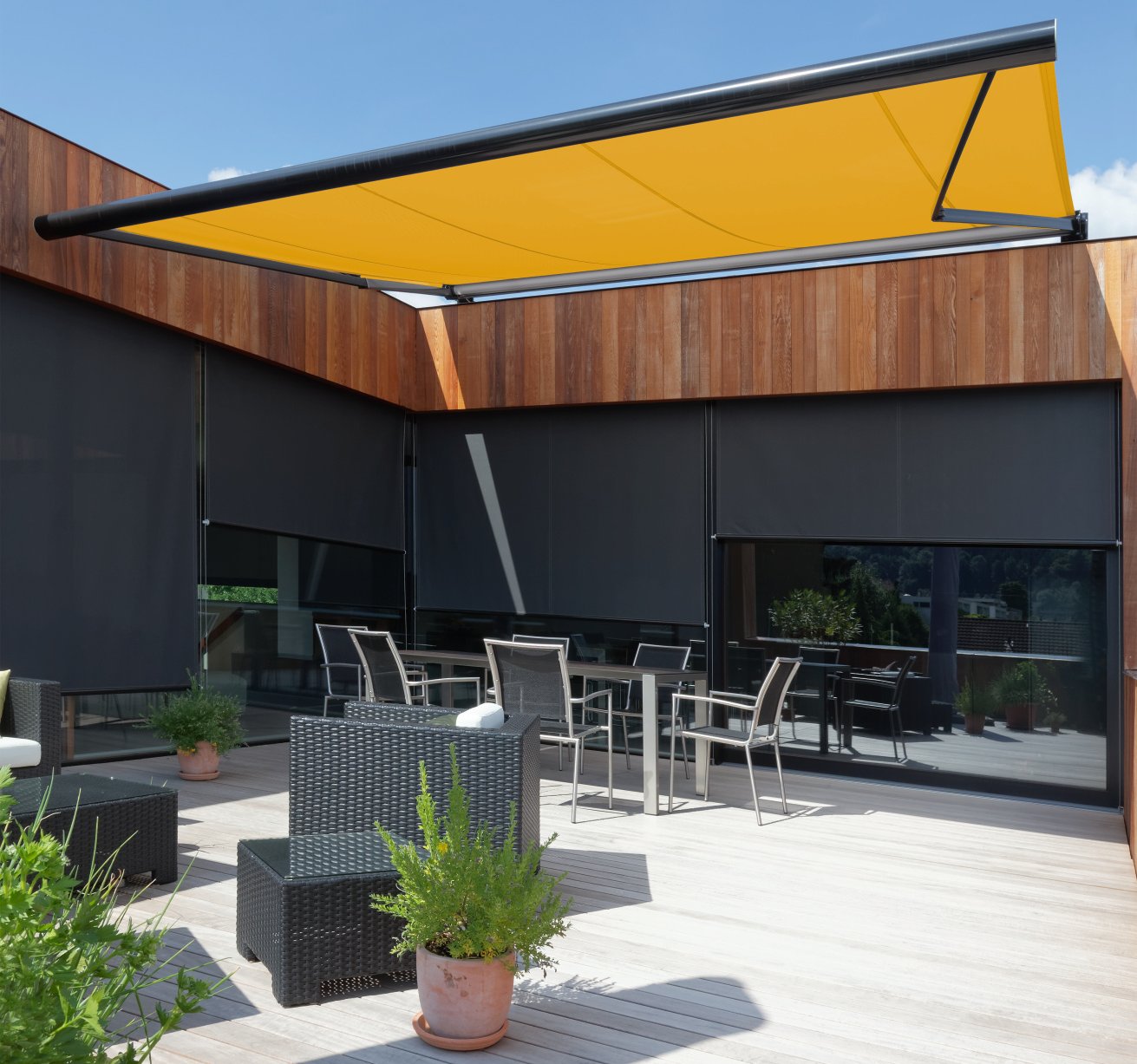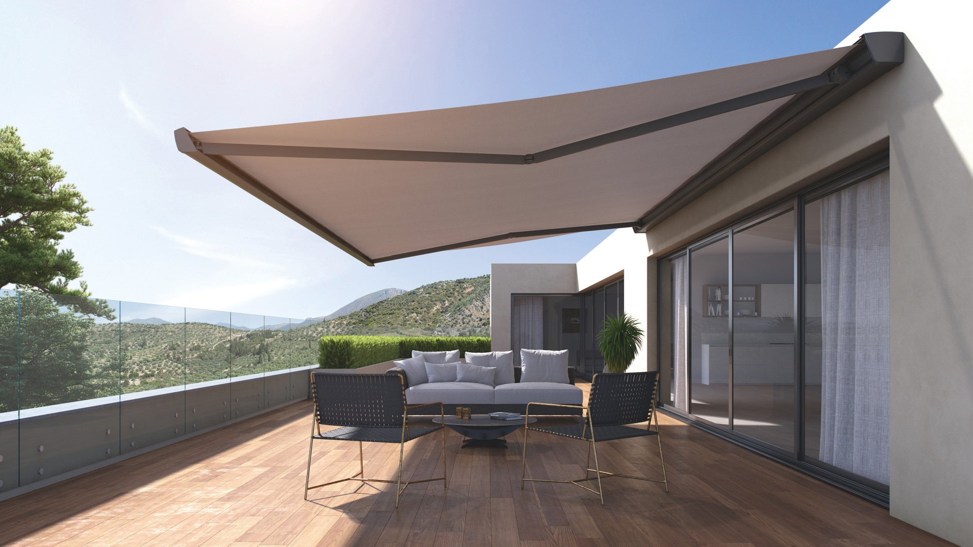 Sur les terrasses et les façades des exigences sont plus complexes et des portées supérieures sont requises. Une marquise à bras articulé offre une solution standard de qualité. Avec une largeur s’étendant jusqu’à 20 mètres, elle offre la meilleure protection contre le soleil. Selon sa largeur, deux à huit bras articulés assurent une stabilité élevée ainsi que la tension du tissu. Les marquises à bras articulé sont flexibles et idéales pour les terrasses, les terrasses couvertes et les locaux commerciaux. Elles sont également une solution parfaite pour les rénovations grâce à leurs points de fixation murale et à la toile relativement facile à choisir. Les protections contre les intempéries et autres offrent des solutions fermées à différentes catégories de prix. Sur le marché du haut de gamme et sur demande, de nombreux raffinements techniques ainsi que des variantes de design concernant le confort et l'esthétique peuvent être envisagés.