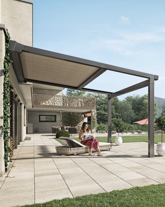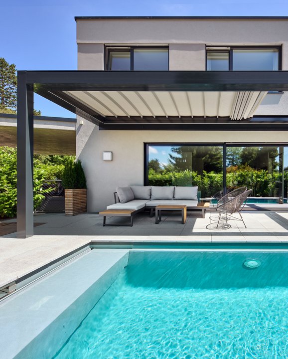 En règle générale, une pergola est une couverture de terrasse autonome dotée d’un toit mobile en tissu ou en aluminium. A titre d’exemple, un toit à lamelles crée de l’ombre et les lamelles mobiles à réglage progressif permettent d’assurer une ventilation naturelle agréable. Les pergolas conviennent essentiellement pour protéger leurs utilisateurs du soleil et de la pluie. Il est plutôt déconseillé de les utiliser en hiver, car les lamelles restent ouvertes en cas de chutes de neige. La variante aérée pour la terrasse et le jardin est souvent vitrée sur les côtés et reliée à l’aide de stores bannes ou d’autres options.