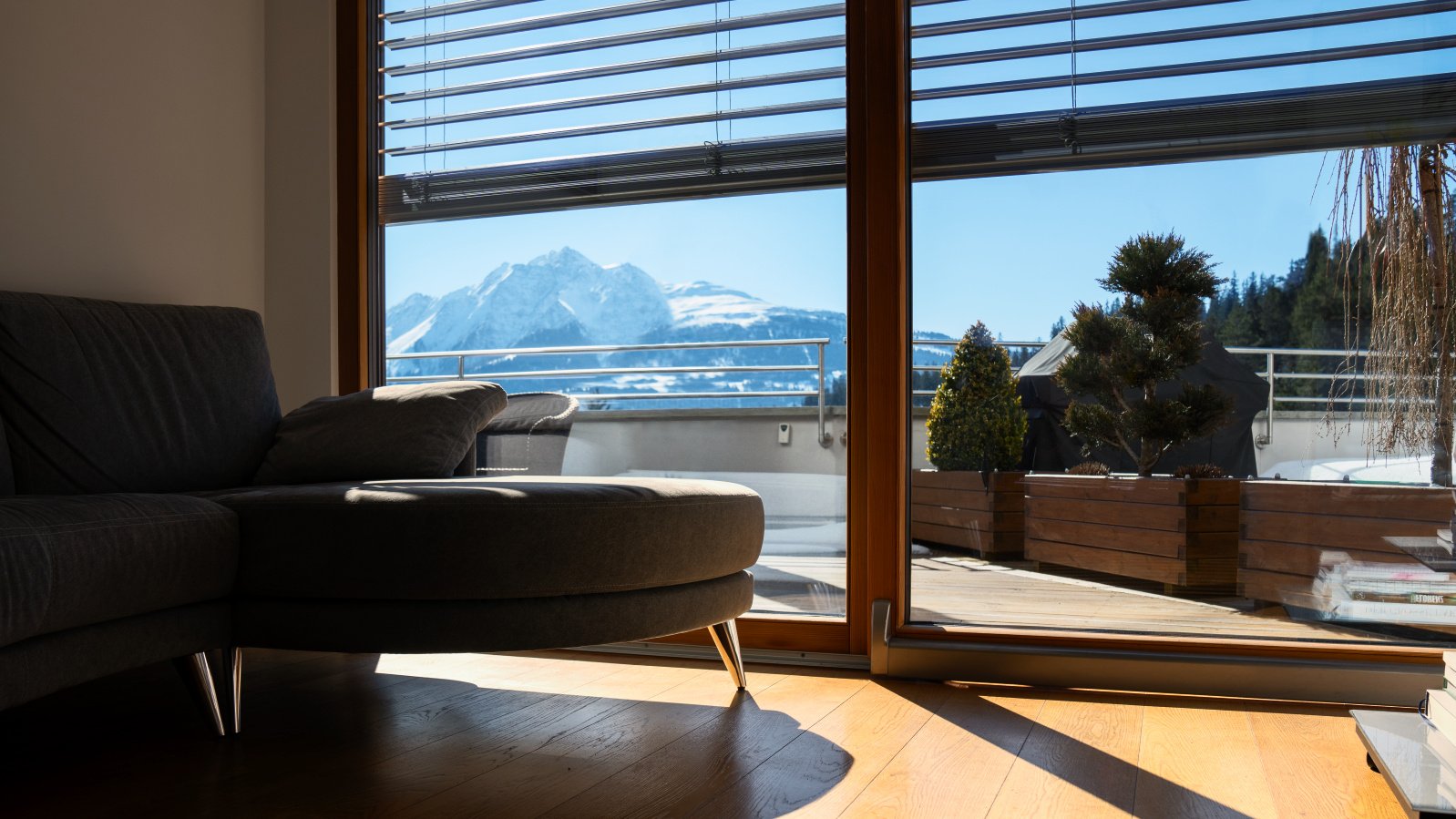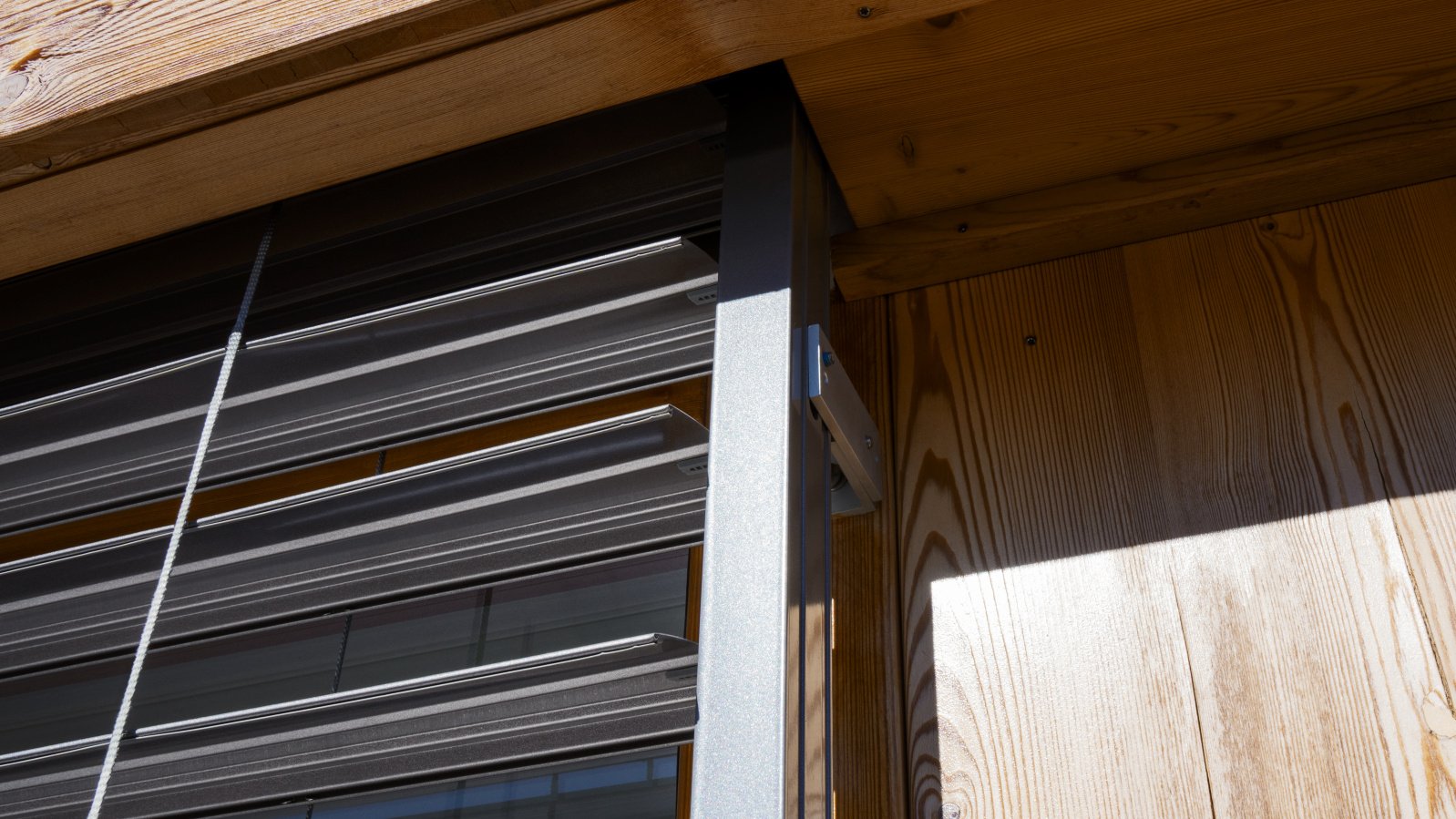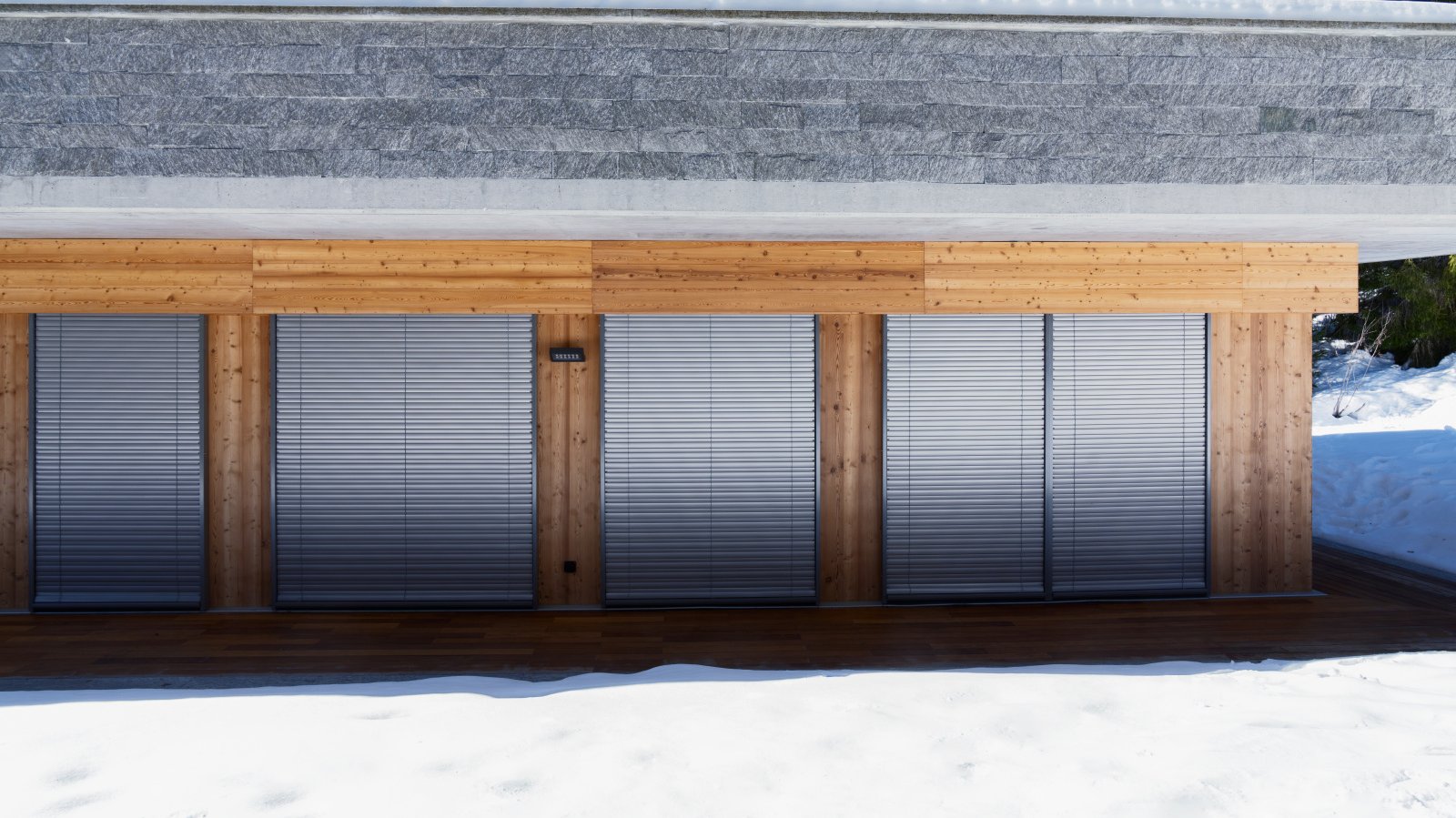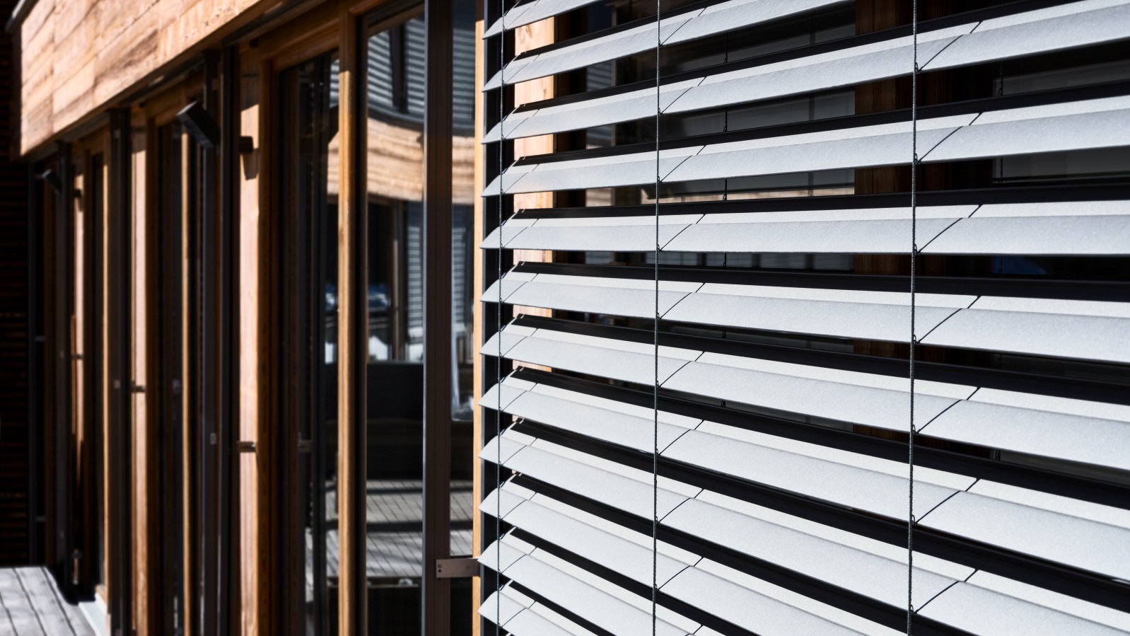 Le store métallique à lamelles reliées MV 90, un système d’ombrage raffiné et sophistiqué, est utilisé ici et s’harmonise avec l’apparence luxueuse de la résidence. Le guidage de courroie de qualité exigeant peu d’entretien est intégré latéralement aux coulisses. Comme aucune bande de relevage ne passe dans les lamelles, le store garantit un excellent obscurcissement et une isolation thermique maximale. La forme spéciale de ses lamelles permet de régler précisément et en continu la lumière passant au travers du store métallique à lamelles reliées. Le gris aluminium des lamelles choisi ici s’harmonise avec la façade en pierre naturelle et en bois. La situation de la résidence à l’orée de la forêt offre beaucoup de tranquillité et d’intimité, ce qui présente un grand avantage. Comme il s’agit de logements de vacances, une attention accrue a été accordée à la protection contre les intrusions. Le MV 90 est également un excellent choix pour cette raison. Il est verrouillé dans n’importe quelle position intermédiaire grâce à un système de verrouillage contre la remontée. Combiné à un guidage spécial des lamelles, il répond à des exigences de sécurité accrues grâce à sa technique de verrouillage active.