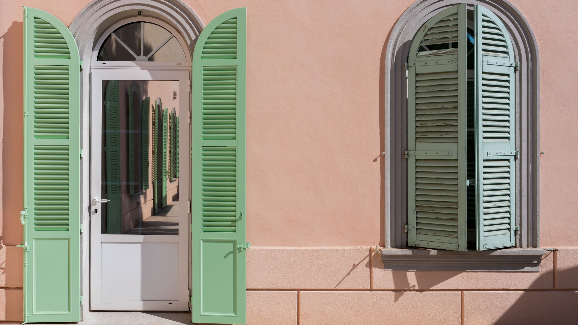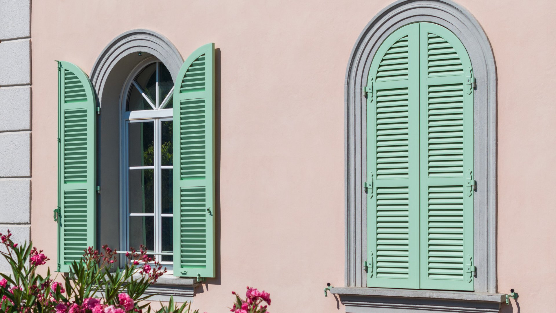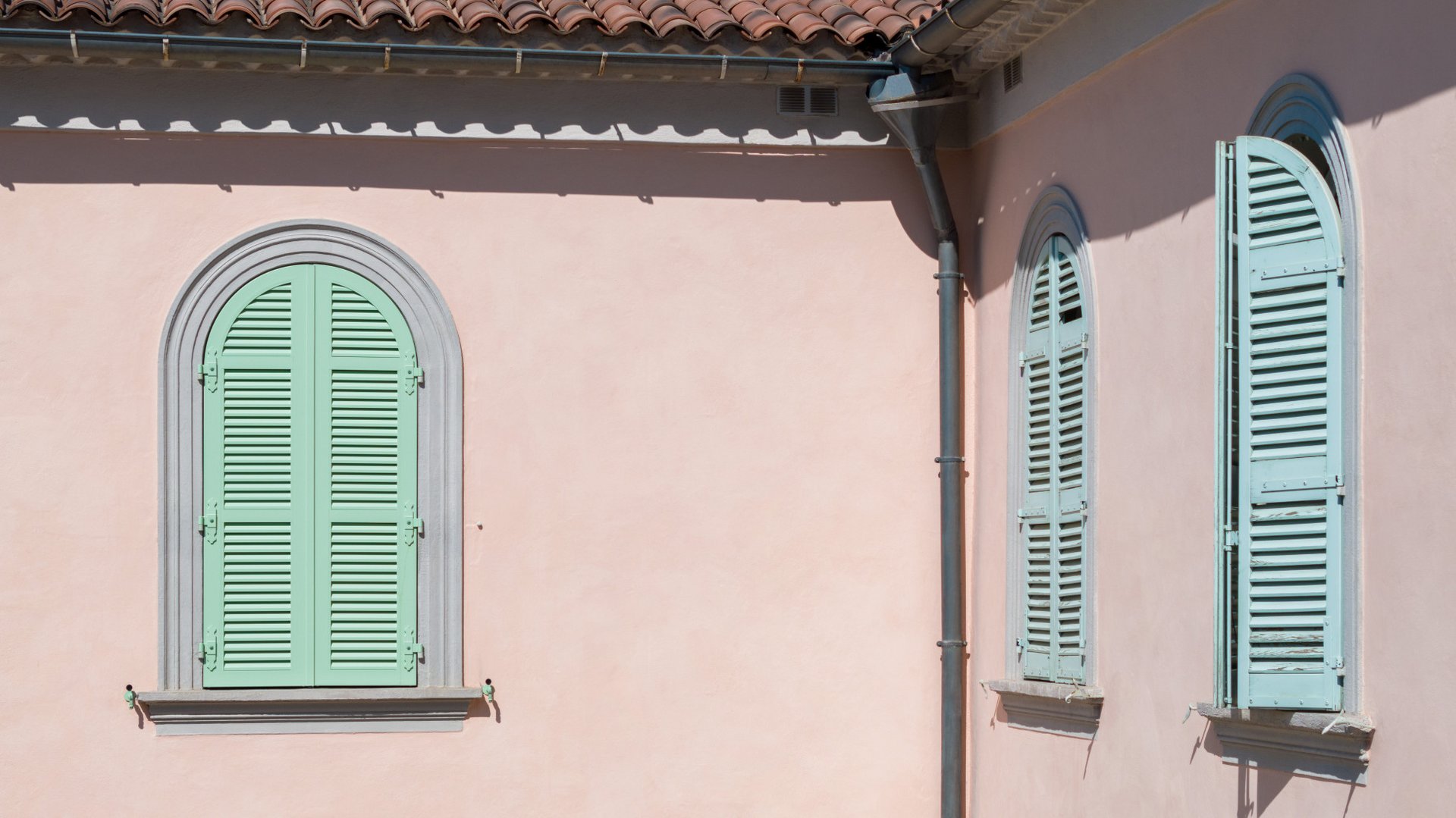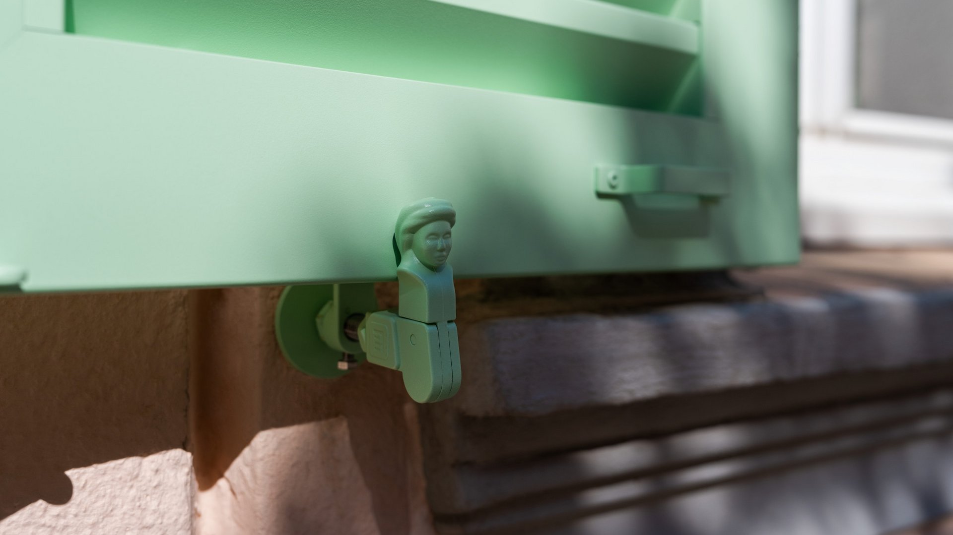 Il a été possible, grâce à une technique de fabrication spéciale, de réaliser même des volets pour les fenêtres en plein cintre et d’autres formats spéciaux. Chaque volet a ainsi pu être ajusté au millimètre près à l’ouverture respective avec ses pentures d’origine et les lamelles ont pu être recoupées pour épouser parfaitement les courbures respectives. La solution a été complétée de détails fonctionnels comme une ouverture à l’espagnolette pour ventiler les pièces et une poignée de manœuvre facilitant l’usage. La teinte RAL 6019 A été retenue pour tous les éléments, des volets aux pentures en passant par les ferrures.