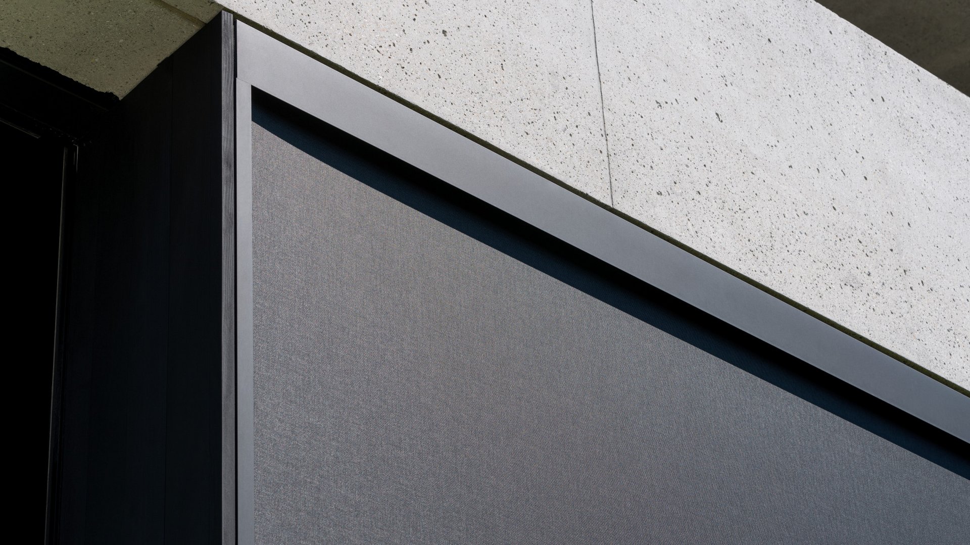 Les stores en toile verticaux sont un choix particulièrement populaire dans les maisons individuelles et les immeubles modernes au design exceptionnel parce que leurs nombreuses variantes permettent une grande flexibilité et qu’ils s’intègrent discrètement dans la façade. Des toiles noires assorties aux cadres des fenêtres et aux grandes surfaces de façade noires ont été choisies dans ce cas-ci. La particularité de la toile choisie est qu’elle est composée de fibres de verre obtenues à partir de verre en fusion étiré en filaments qui sont ensuite tissés.Ce procédé permet d’obtenir une légère transparence – avec les caractéristiques et les possibilités de jouer avec l’ombre et la lumière que cela entraîne.