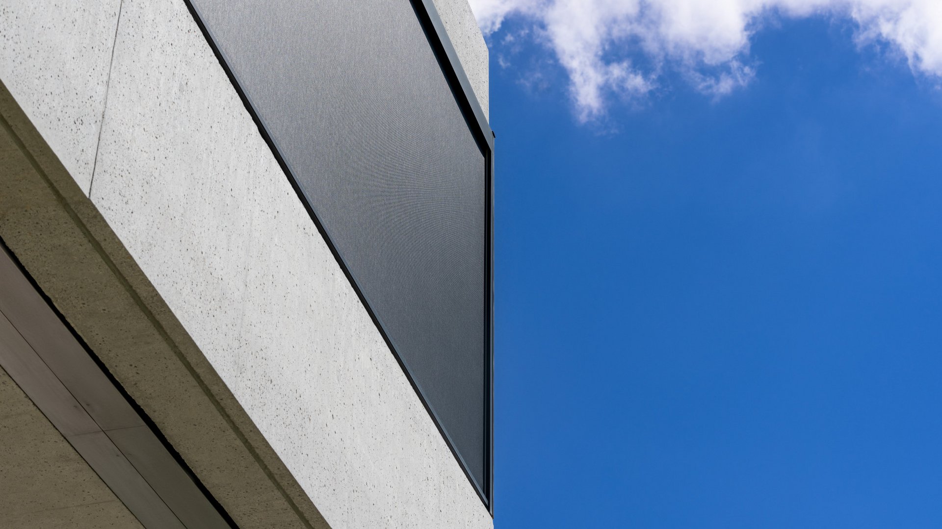 Pour des raisons esthétiques, le choix s'est porté sur une solution avec des stores en toile verticaux, à l’étage supérieur avec un guidage par câble filigrane et discret et aux étages inférieurs avec un rail résistant au vent. Une solution qui est, en fin de compte, non seulement esthétique mais assure aussi un bon accès pour le montage ou même pour les travaux d’entretien et de réparation ultérieurs a été peaufinée dans le cadre de différentes concertations avec les architectes et d’autres spécialistes comme les fabricants de fenêtres ou de façades. Et enfin, il fallait bien entendu aussi garantir l'effet d’ombrage souhaité pour les habitants.
