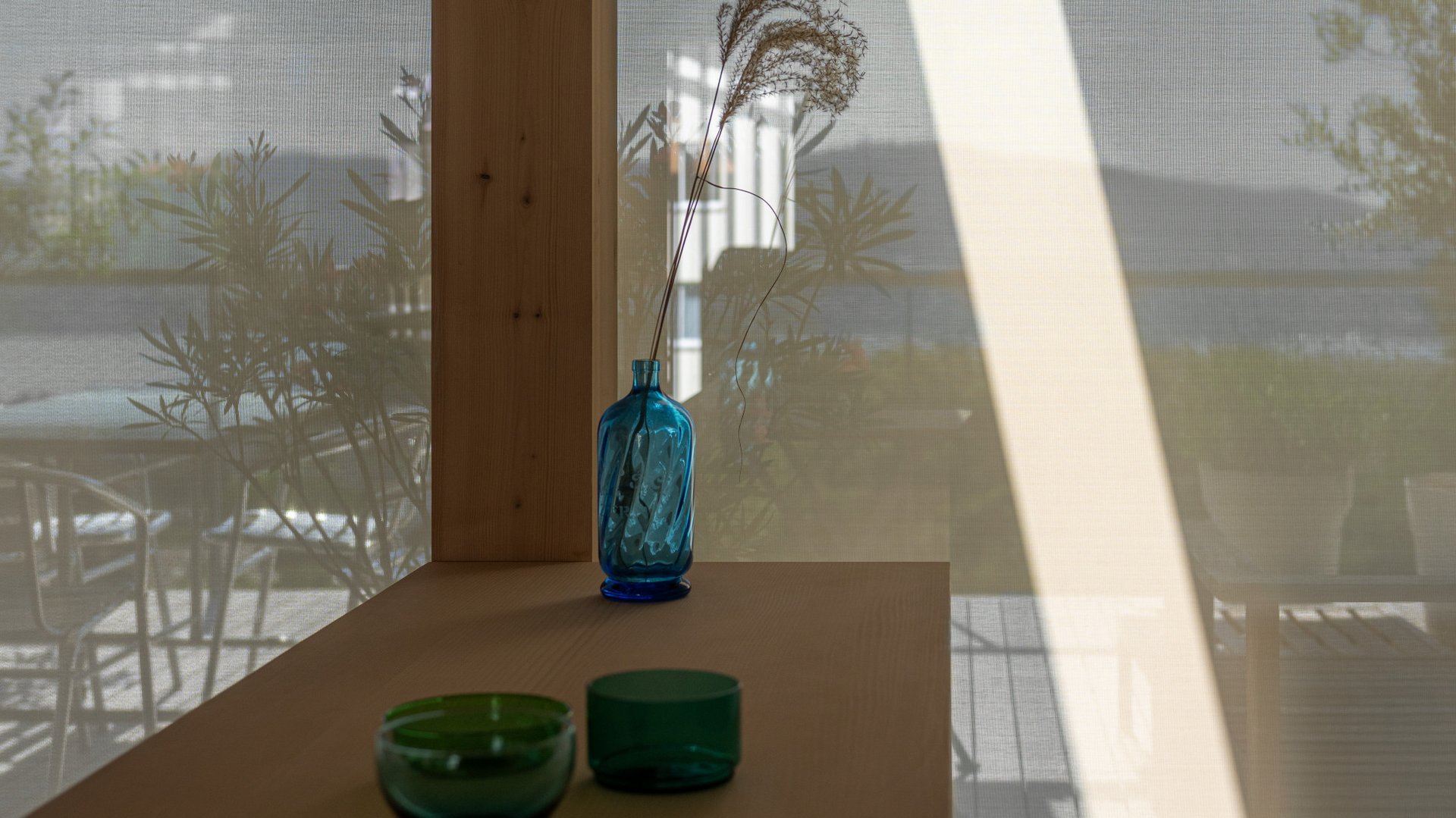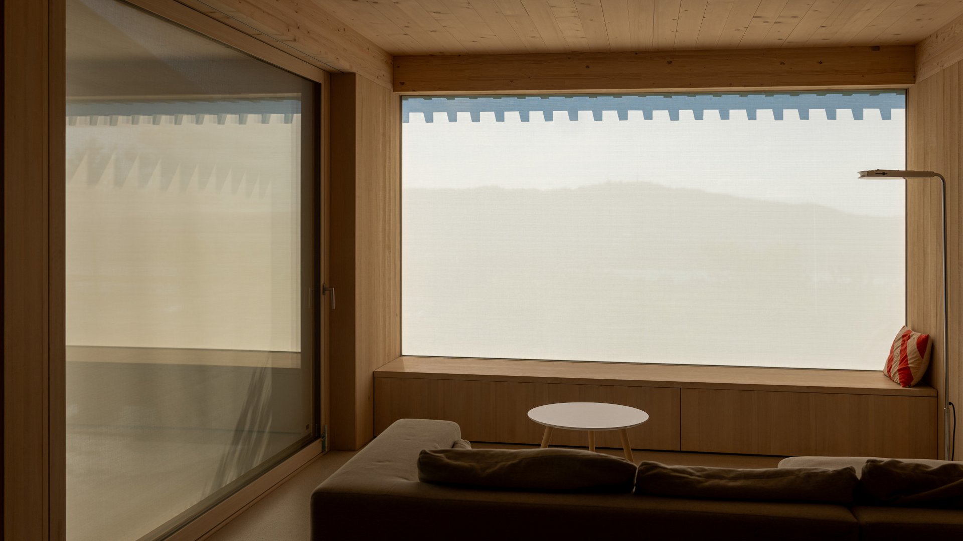 Les 3% restants des rayons lumineux suffisent pour atteindre une légère transparence – et inonder ainsi les espaces intérieurs d’une dose agréable de lumière naturelle sans obstruer la vue vers l'extérieur. Cet effet est rendu possible par l’utilisation de fibres de verre obtenues à partir de verre en fusion étiré en filaments qui sont ensuite tissés. Les toiles protègent ainsi contre l’éblouissement, les regards indiscrets et la chaleur, mais elles contribuent aussi à l’éclairage et donc à l’atmosphère de la pièce. La couleur brunâtre retenue pour les stores en toile est assortie à la teinte chaleureuse de l’édifice en bois non seulement à l’extérieur sur la façade mais aussi à l’intérieur où elle crée des effets lumineux.