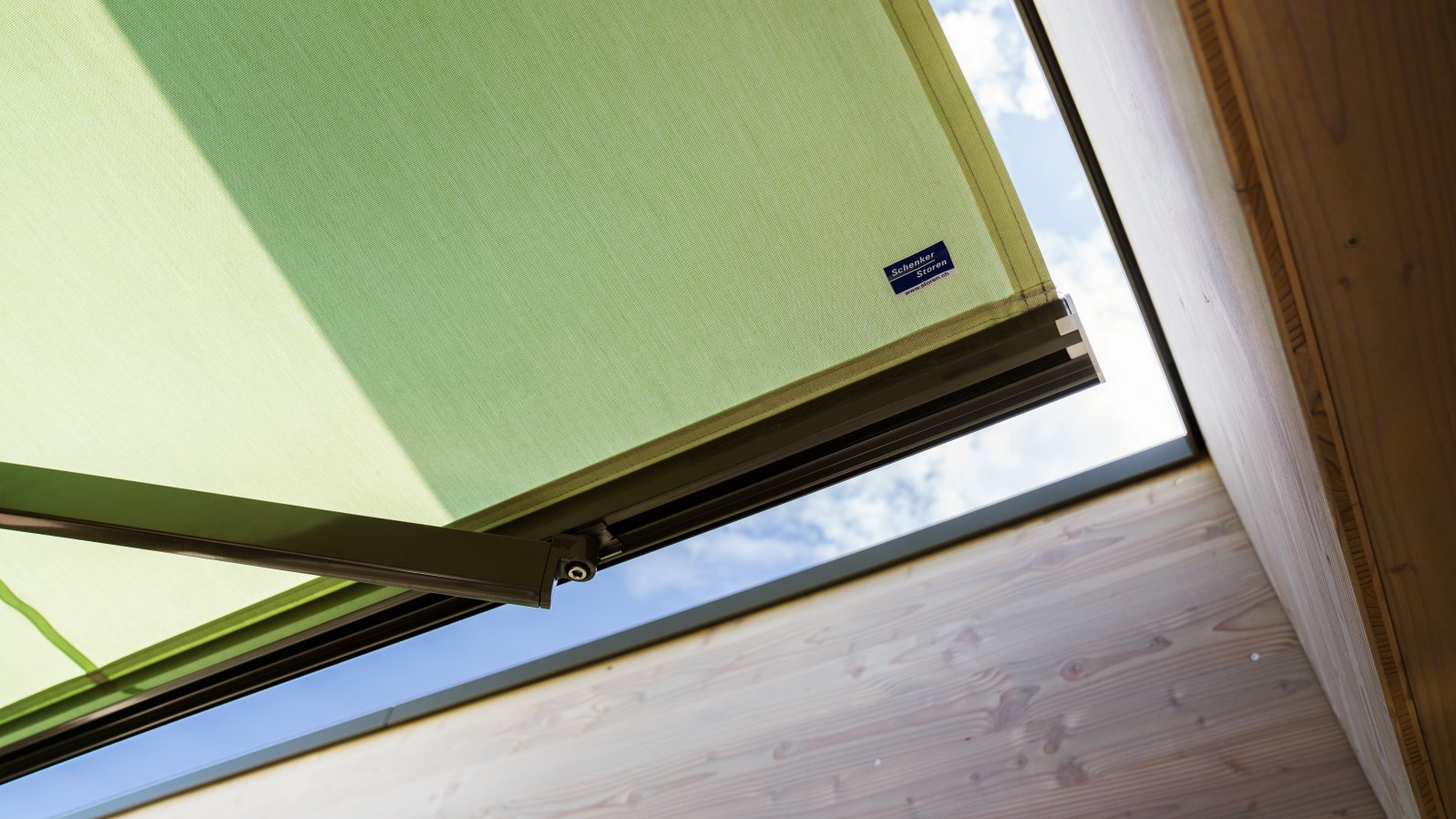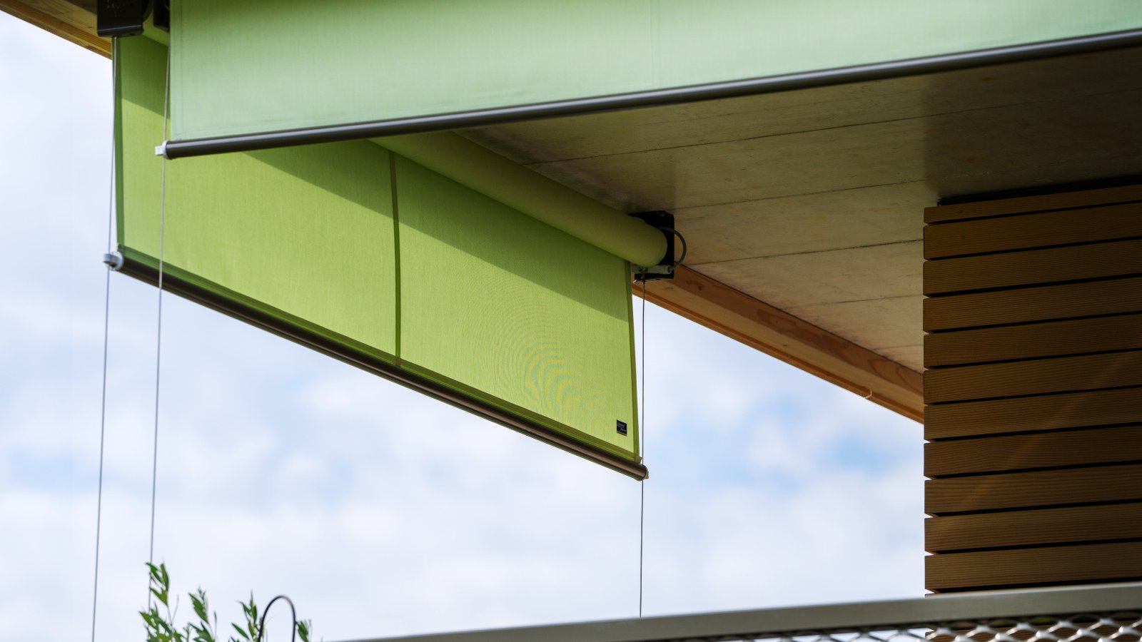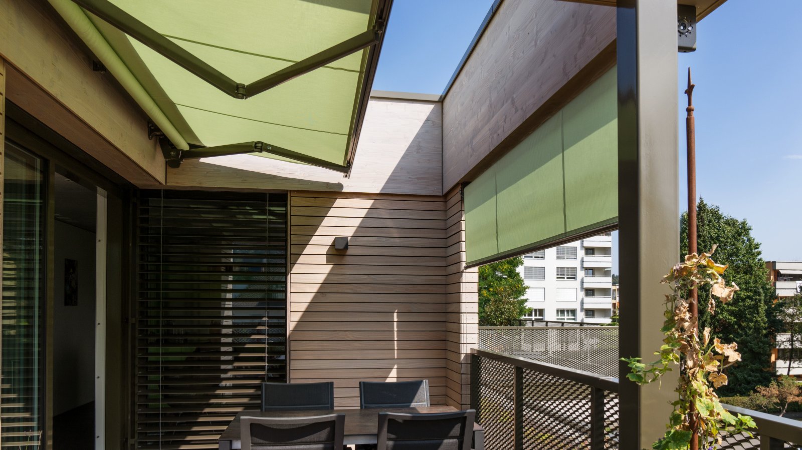 Des fenêtres qui s’étendent du sol au plafond transforment les pièces en véritables oasis de bien-être. Baignées de lumière, elles donnent l’impression d'une communion entre la nature et l’habitat. Les trois systèmes de protection contre le soleil différents participent à instaurer d'agréables conditions de luminosité, tant à l’intérieur qu’à l’extérieur. Les concepteurs ont délibérément choisi des couleurs terreuses, en harmonie avec les autres matériaux de construction, et comme un clin d'œil au jardin. L’apport de lumière du jour peut être commandé individuellement sur toutes les fenêtres, grâce à des stores à lamelles reliées (VR 90) réglables en fonction des besoins des résidents. Au niveau des places assises, les stores en toile verticaux VS 150 assurent une protection contre le soleil remarquable, tout en affichant une esthétique convaincante. Comme un montage standard n’était pas possible ici, des supports spéciaux ont été fabriqués sur mesure pour le guidage par câble. Ceux-ci sont fixés directement sur le périmètre de la balustrade. L'aménagement des combles a nécessité une étroite collaboration avec le fabricant de la façade et le constructeur métallique. Un cadre en bois a été spécialement construit pour le montage des marquises normalisées intemporelles NGM 20.