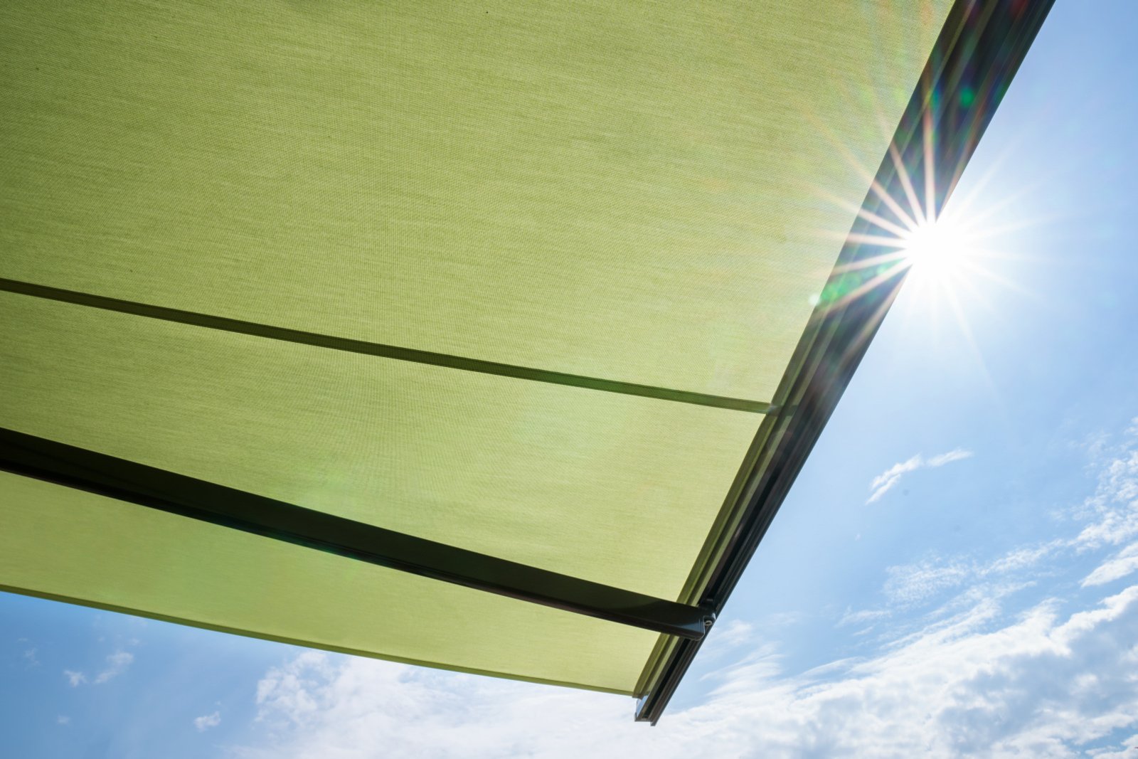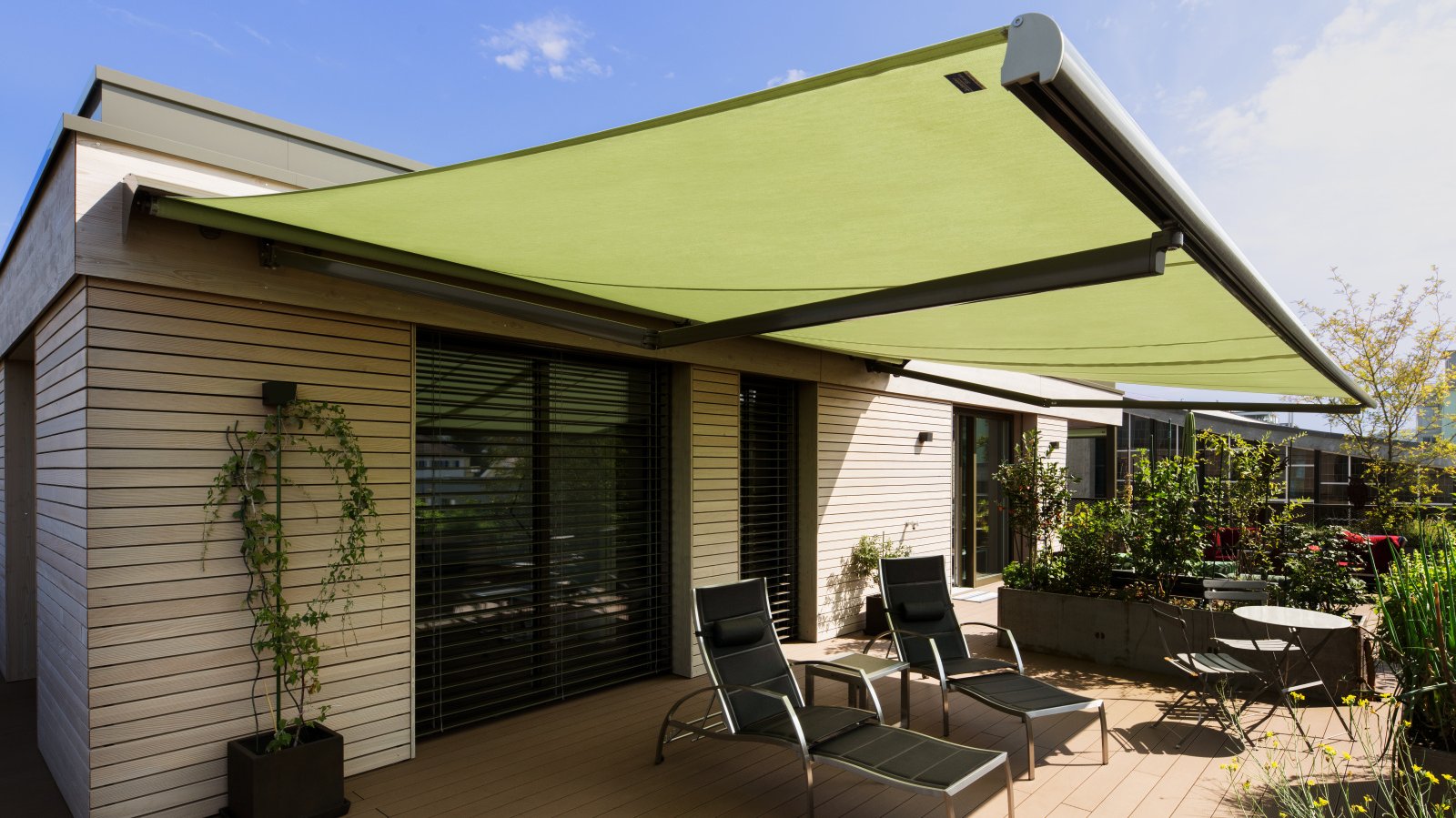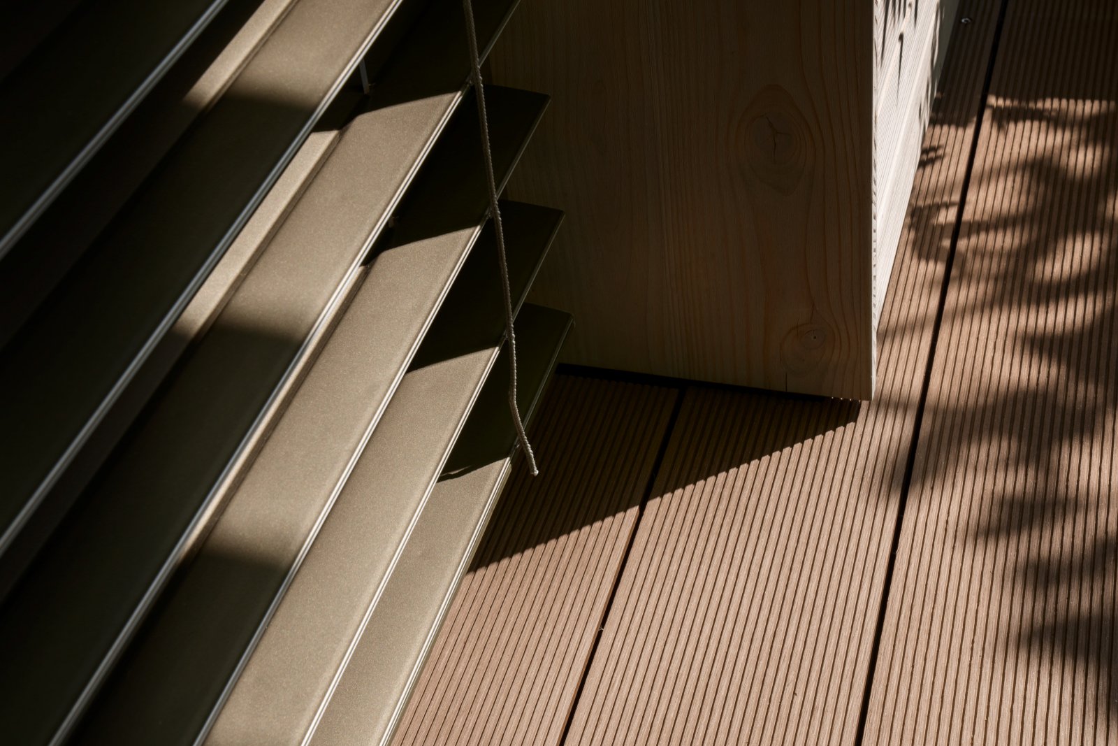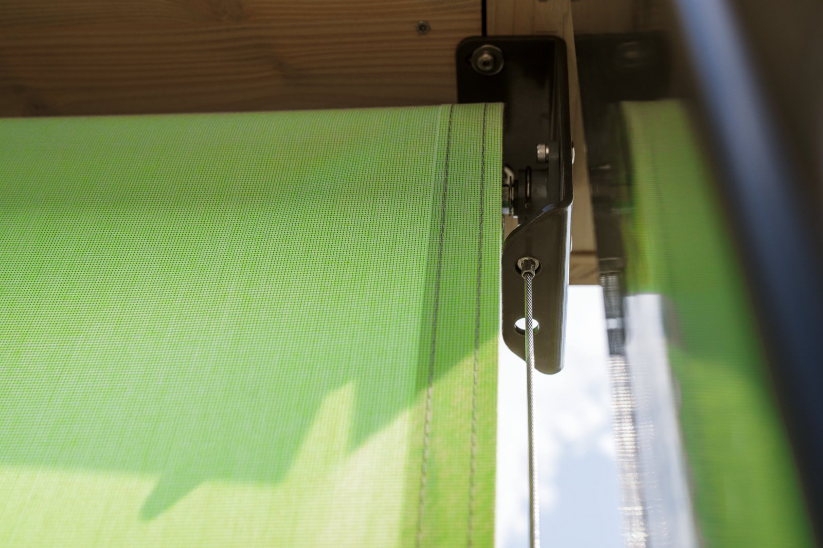 Des fenêtres qui s’étendent du sol au plafond transforment les pièces en véritables oasis de bien-être. Baignées de lumière, elles donnent l’impression d'une communion entre la nature et l’habitat. Les trois systèmes de protection contre le soleil différents participent à instaurer d'agréables conditions de luminosité, tant à l’intérieur qu’à l’extérieur. Les concepteurs ont délibérément choisi des couleurs terreuses, en harmonie avec les autres matériaux de construction, et comme un clin d'œil au jardin. L’apport de lumière du jour peut être commandé individuellement sur toutes les fenêtres, grâce à des stores à lamelles reliées (VR 90) réglables en fonction des besoins des résidents. Au niveau des places assises, les stores en toile verticaux VS 150 assurent une protection contre le soleil remarquable, tout en affichant une esthétique convaincante. Comme un montage standard n’était pas possible ici, des supports spéciaux ont été fabriqués sur mesure pour le guidage par câble. Ceux-ci sont fixés directement sur le périmètre de la balustrade. L'aménagement des combles a nécessité une étroite collaboration avec le fabricant de la façade et le constructeur métallique. Un cadre en bois a été spécialement construit pour le montage des marquises normalisées intemporelles NGM 20.