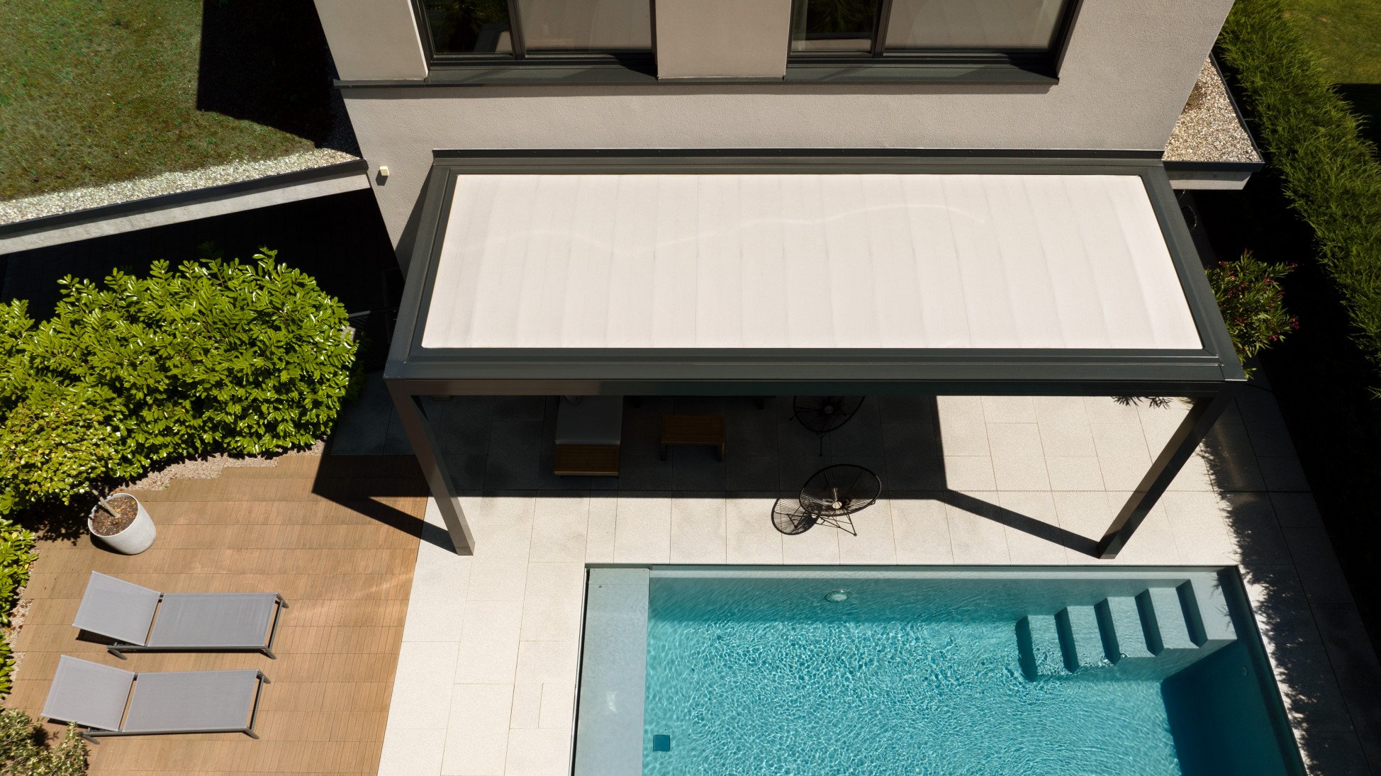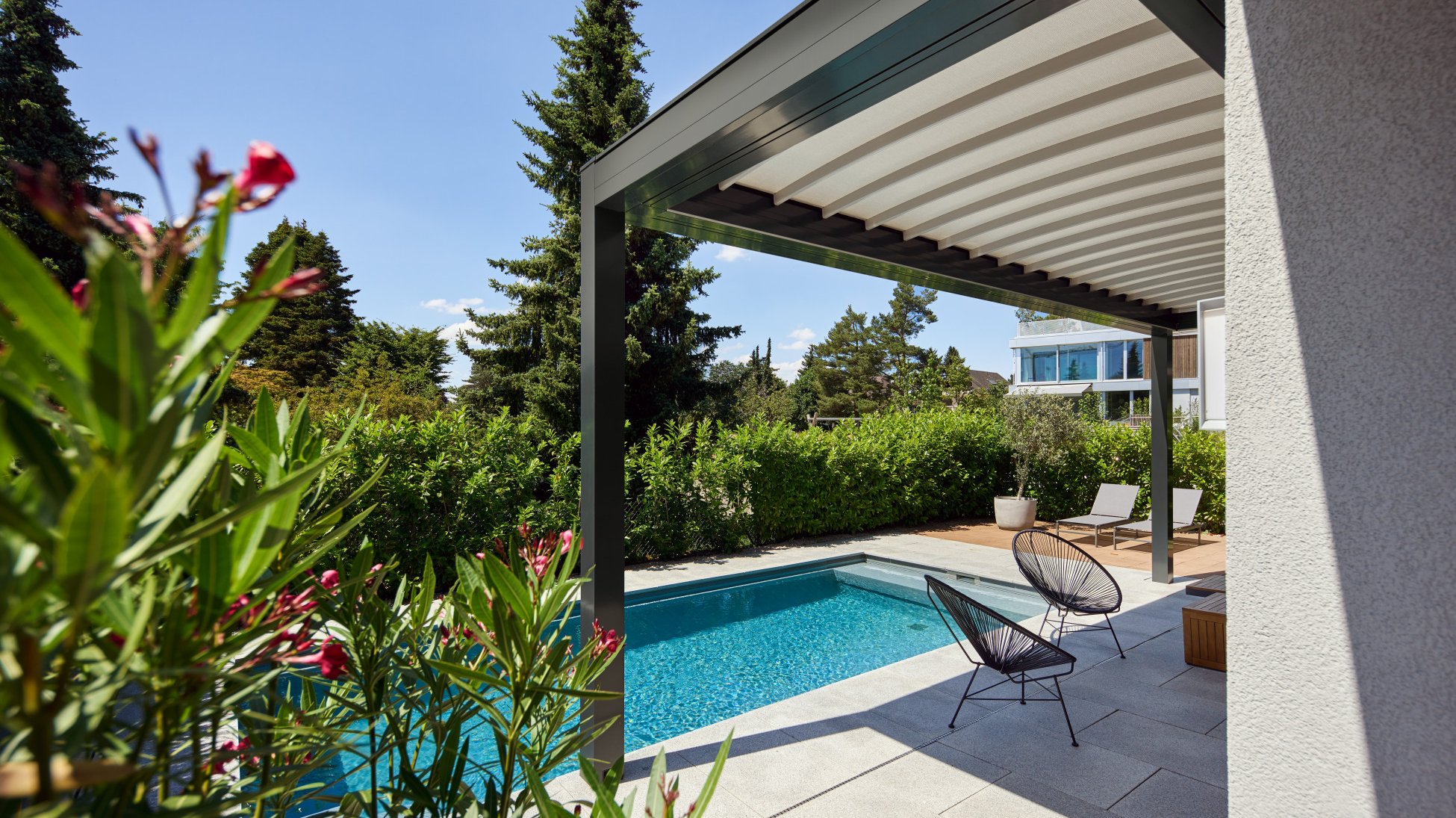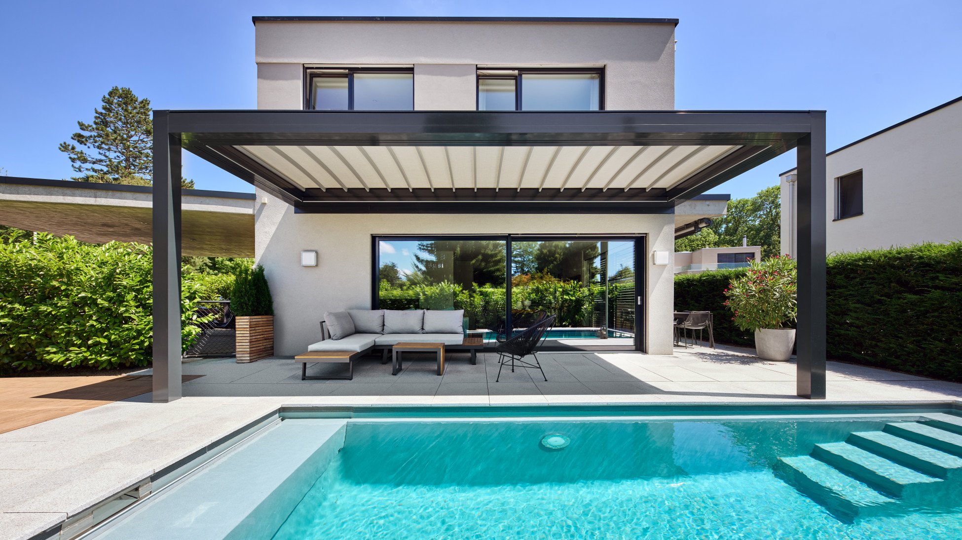 Les propriétaires ont aménagé sur le côté sud-ouest de leur maison individuelle moderne un confortable coin salon bénéficiant d’un bel ensoleillement. Le regard est directement attiré par l’eau de la piscine adjacente. Comme ils aiment passer beaucoup de temps dans le coin salon, les propriétaires souhaitaient un toit stable, installé à demeure qu’ils peuvent ouvrir et fermer à leur guise et laisser de temps en temps ouvert pendant de longues périodes.