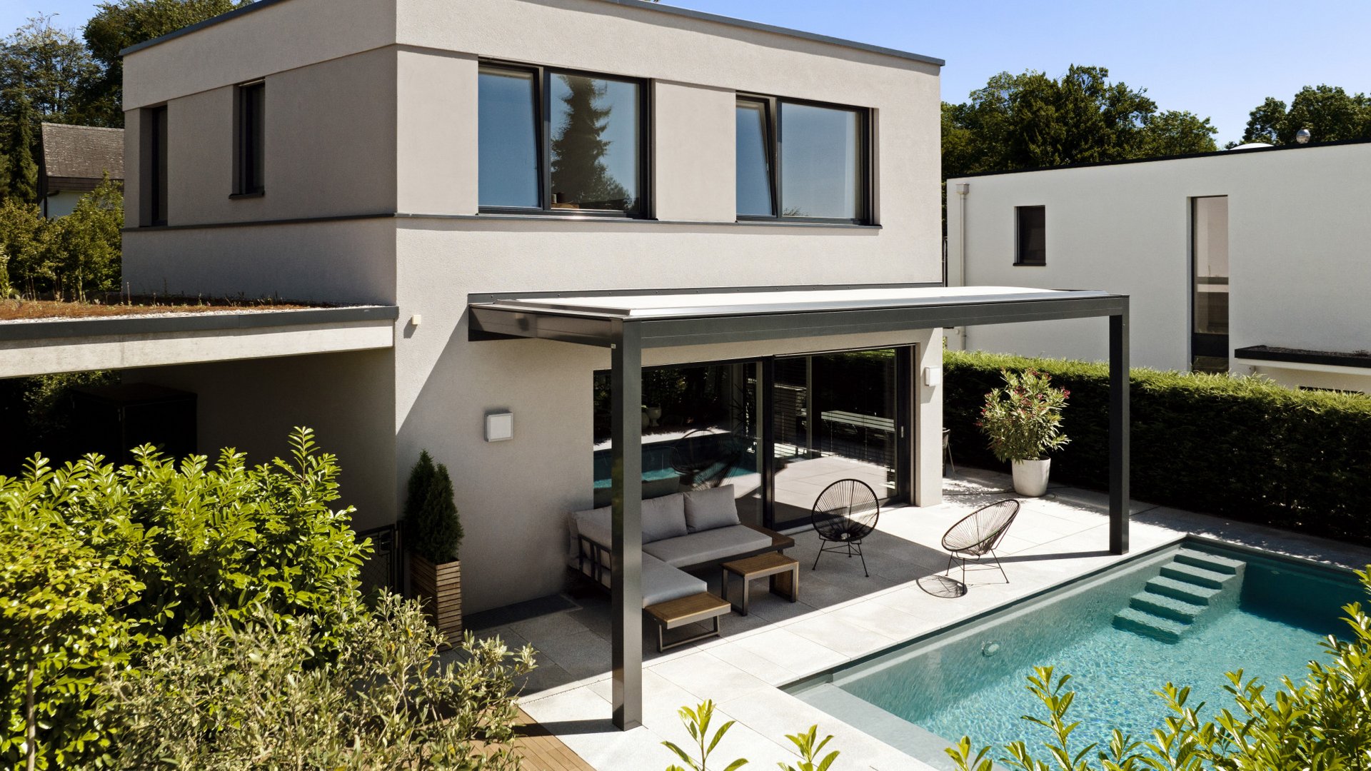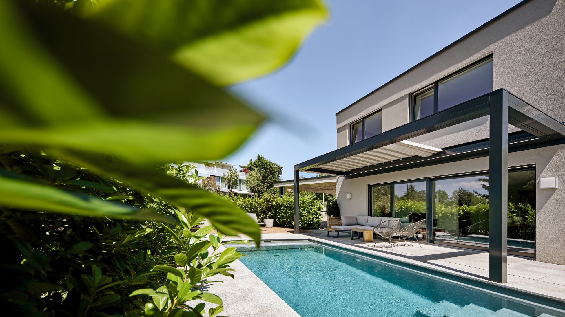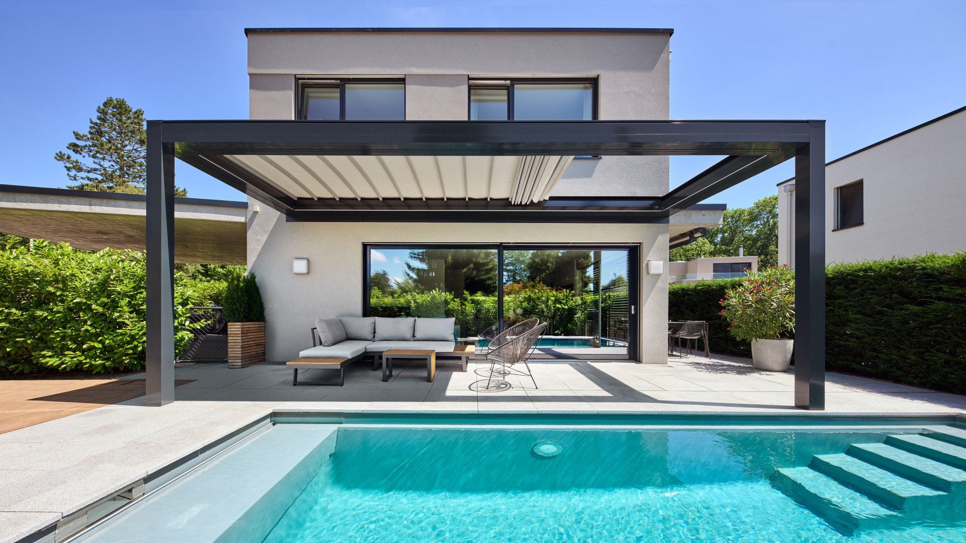 Les propriétaires ont aménagé sur le côté sud-ouest de leur maison individuelle moderne un confortable coin salon bénéficiant d’un bel ensoleillement. Le regard est directement attiré par l’eau de la piscine adjacente. Comme ils aiment passer beaucoup de temps dans le coin salon, les propriétaires souhaitaient un toit stable, installé à demeure qu’ils peuvent ouvrir et fermer à leur guise et laisser de temps en temps ouvert pendant de longues périodes.