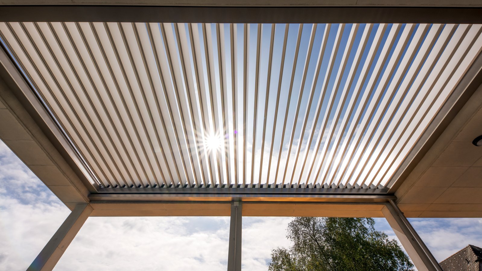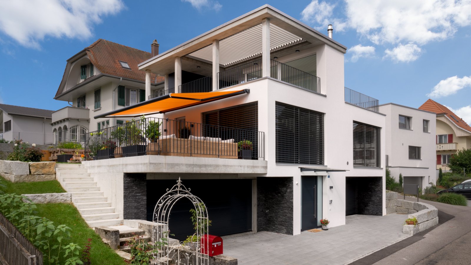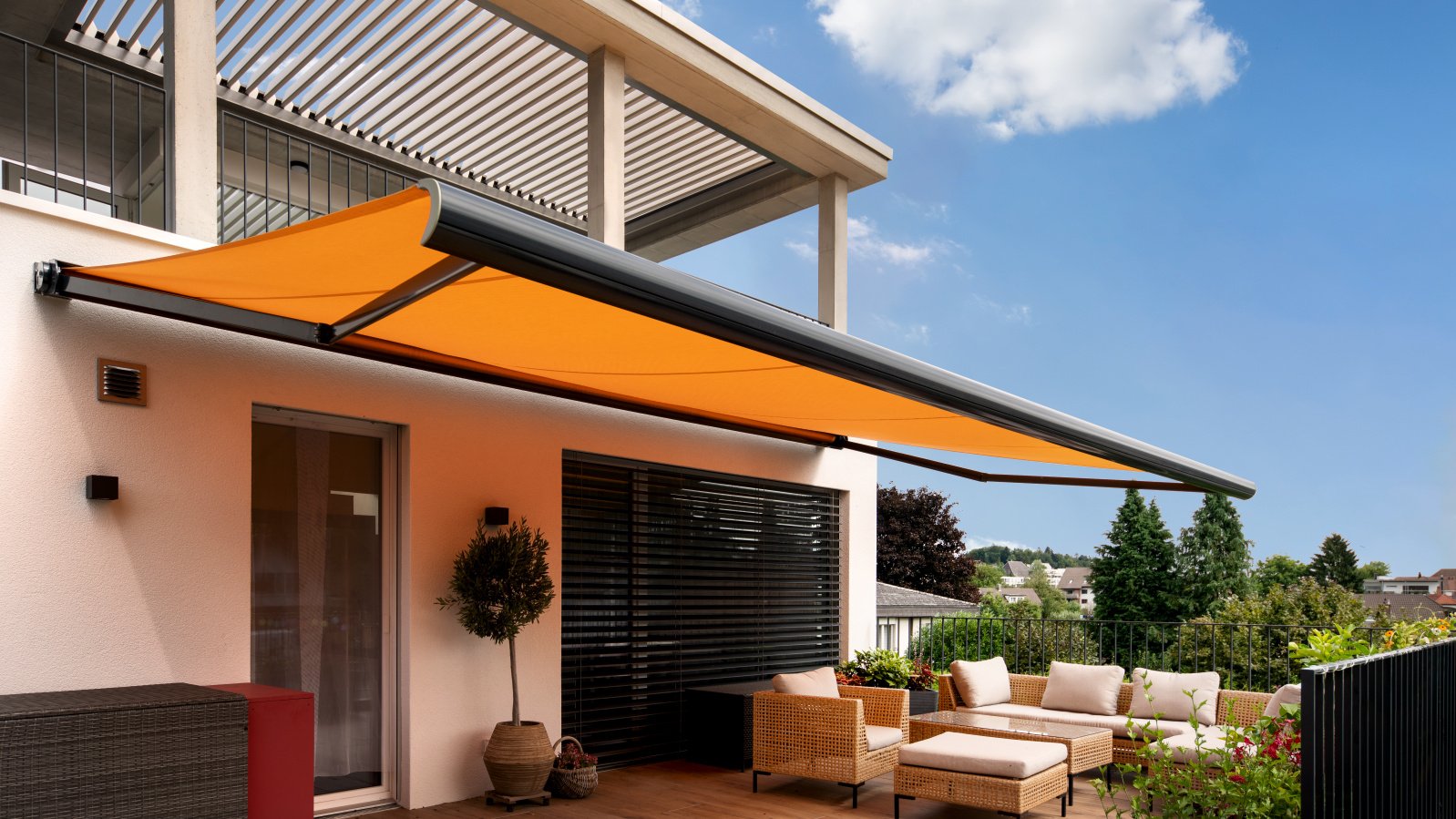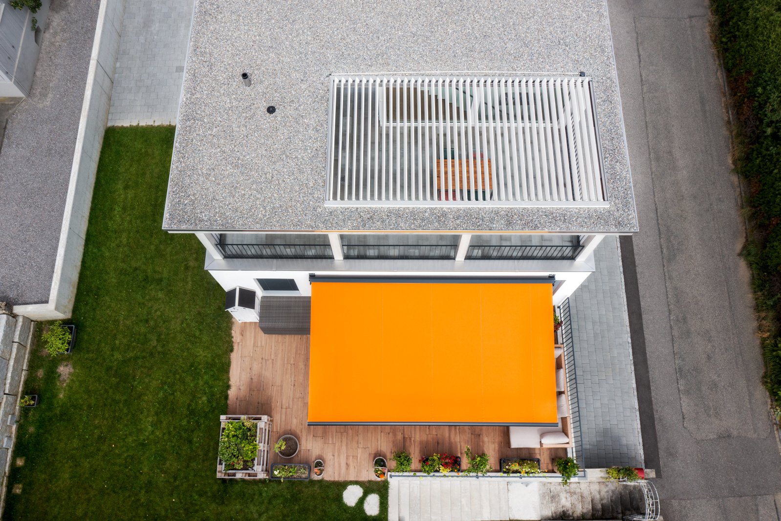 C’est ici qu’un système d’ombrage synonyme de plaisir de la vie en plein air prend toute sa signification. La terrasse de jardin est équipée d’une grande marquise à cassette et la partie couverte de la terrasse de toit est ornée d’un élégant toit à lamelles. Ce dernier permet aux résidents de laisser pénétrer les rayons du soleil pour se réchauffer s’ils le souhaitent ou de créer de l’ombre et de se protéger contre les intempéries lorsqu’il est fermé. Ils peuvent ainsi profiter d’innombrables moment agréables dans cet espace extérieur supplémentaire, quelle que soit la météo (ou presque).