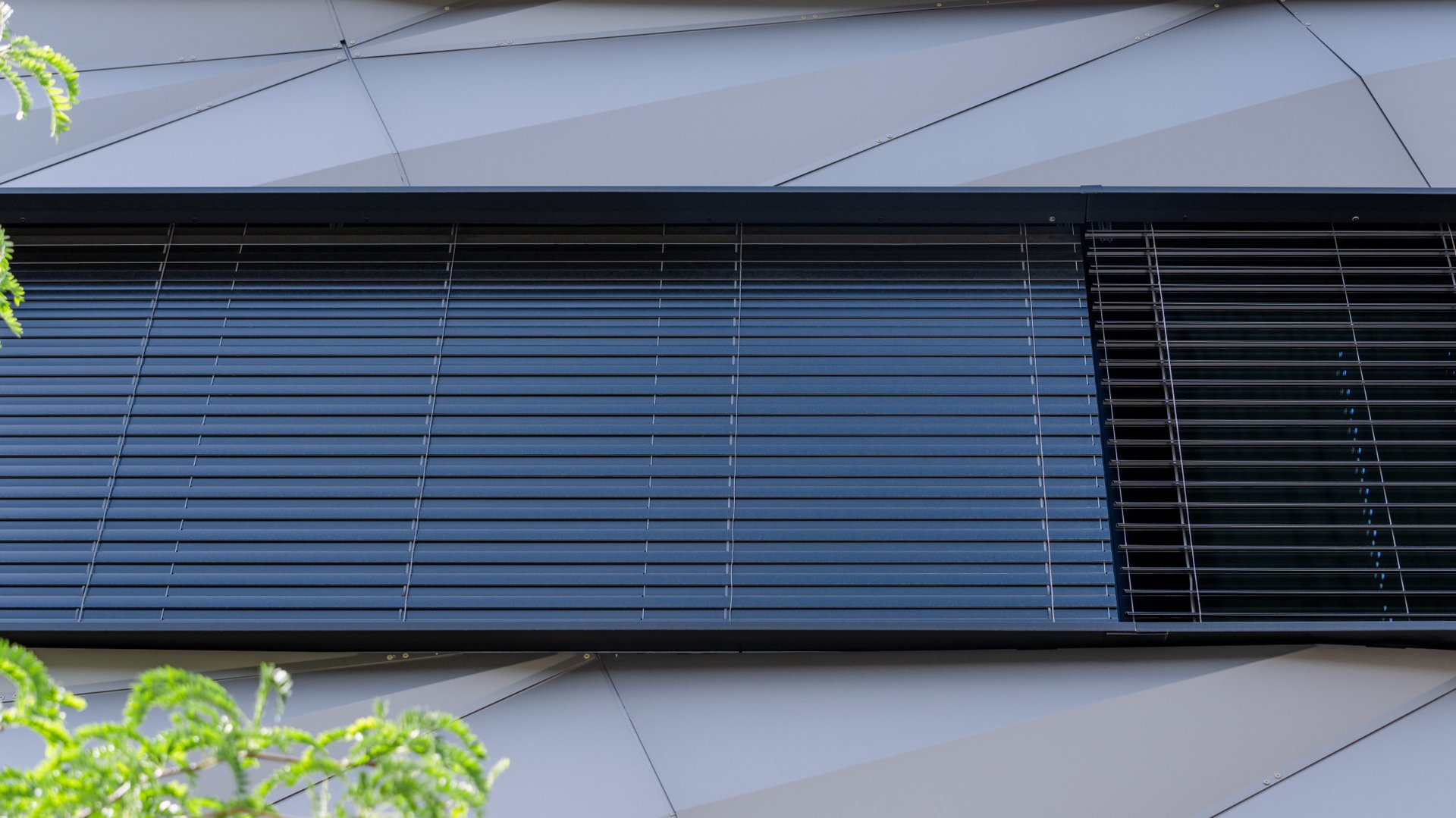 Une exigence particulièrement élevée en matière d’esthétique générale qui s’est notamment manifestée, conformément à la planification, sous forme de solution de fenêtre Skyframe sans cadre avec des surfaces vitrées hautes et larges a posé aux spécialistes de Schenker Storen un défi peu ordinaire. La solution la plus résistante au vent avec guidage sur rail n’est en effet pas entrée en ligne de compte en raison de la construction à montants et traverses. Un guidage par câble aurait quant à lui impliqué, en raison des vastes paquets de lamelles, l’utilisation de câbles supplémentaires pour pouvoir stabiliser aussi ces derniers en cas de vent fort.