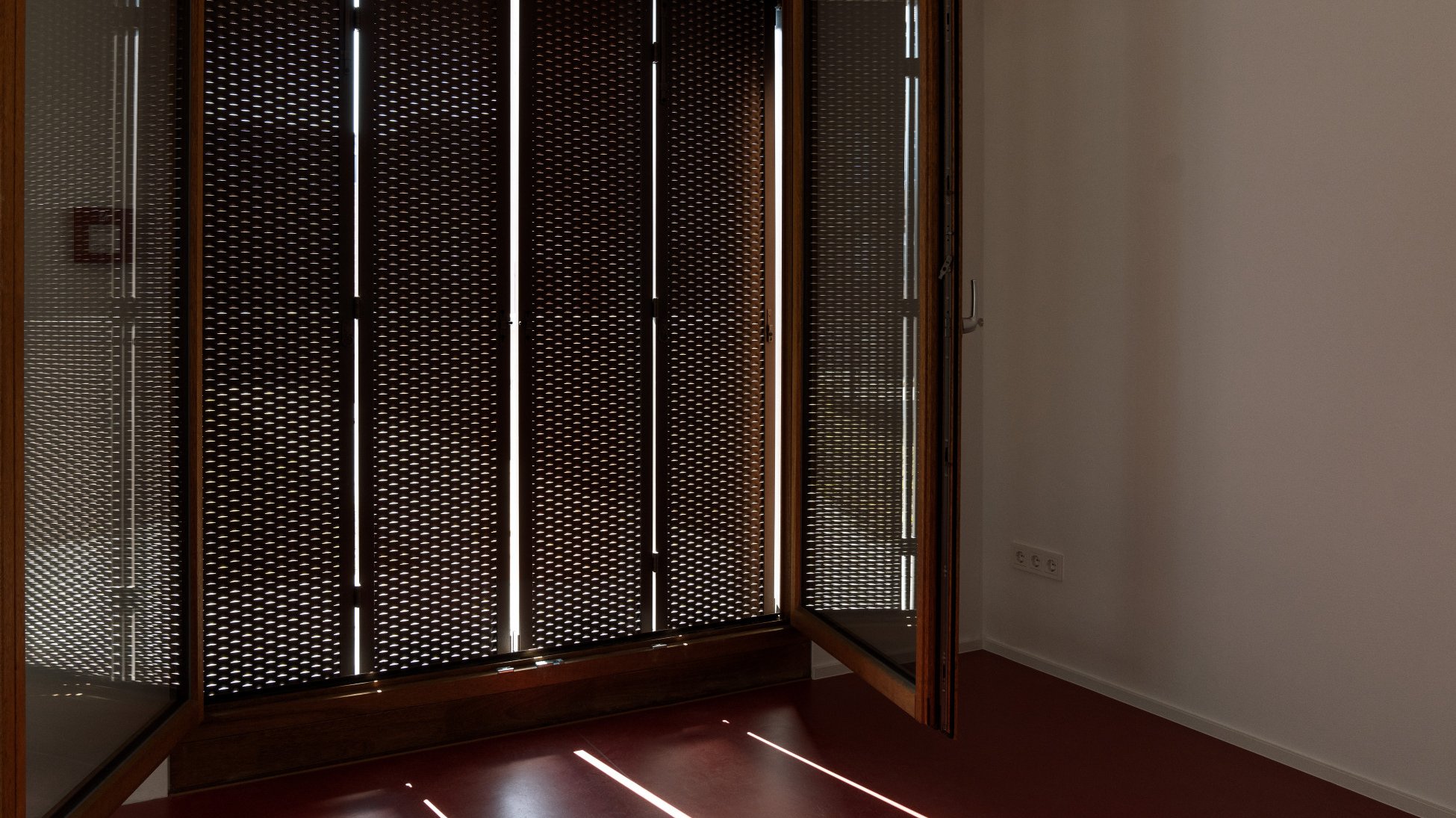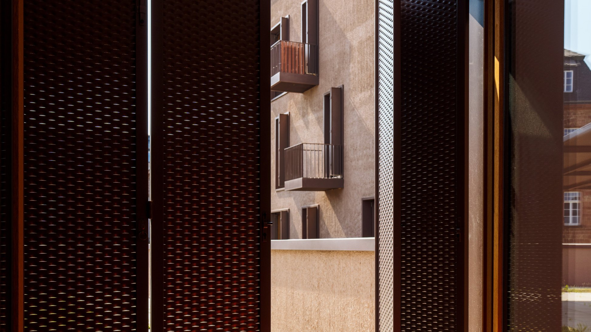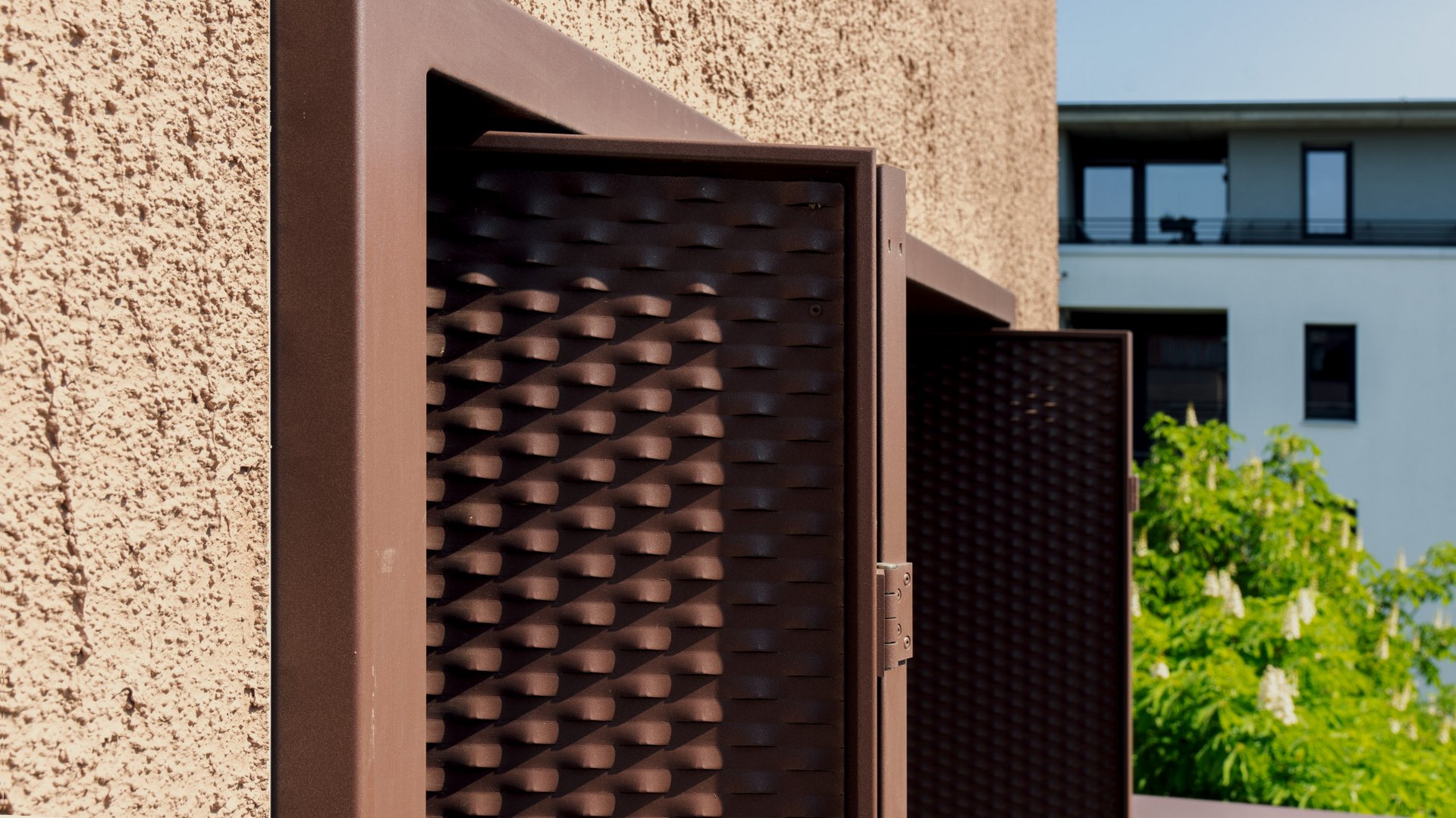 La solution moderne de protection contre le vent, les intempéries et le soleil en aluminium dans la couleur spéciale IGP-classic 591T (ton cuivre) s’ouvre et se ferme aisément comme un accordéon avec un faible rayon d’ouverture et permet un pliage extrêmement peu encombrant dans l’embrasure. Au total, 502 volets coulissants pliables ont été installés, avec un mélange réussi de deux modèles: d’une part un treillis agréablement transparent et d’autre part une panneau en tôle lisse qui assure un obscurcissement complet, spécialement pour les chambres à coucher. Les fines mailles du grillage en métal déployé de 62x25x9,0x2,0 mm répondent non seulement à des exigences esthétiques très élevées, mais assurent aussi un climat intérieur optimal et créent en outre des conditions d’éclairage d’ambiance qui soulignent avec raffinement l’atmosphère des pièces intérieures.