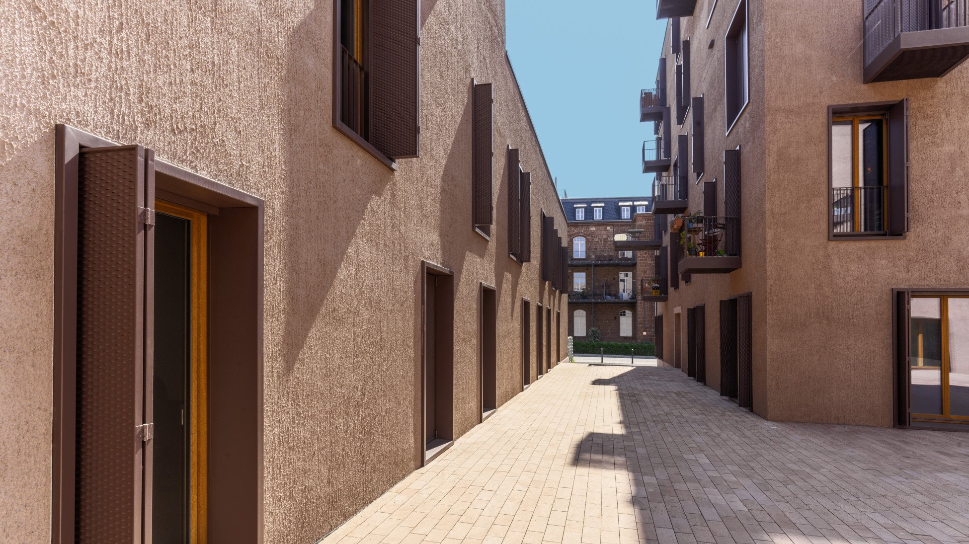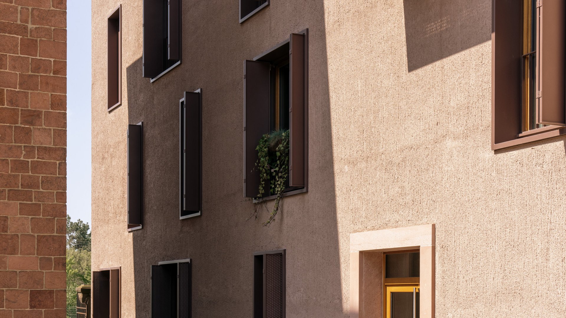 Deux immeubles résidentiels, une crèche et un ouvrage déjà existant – le quartier fait partie de la transformation de l’ancien site de Turley Barracks à Mannheim, une superbe caserne de l’époque impériale classée monument historique. Les bâtiments imposants reliés par des allées s'articulent autour d’une place centrale pour donner à cette nouvelle zone le caractère d’une ville fonctionnant en autarcie. Le résultat est un ensemble fascinant d’architecture ancienne et nouvelle. Les matériaux choisis sont simples et peu nombreux: briques crépies, béton armé porteur, bois et acier, et renforcent l’architecture monolithique qui, en renonçant à des matériaux isolants, s’inscrit pleinement dans un mode de construction à la fois porteur d'avenir et traditionnel et s’avère aussi judicieuse sur le plan énergétique.