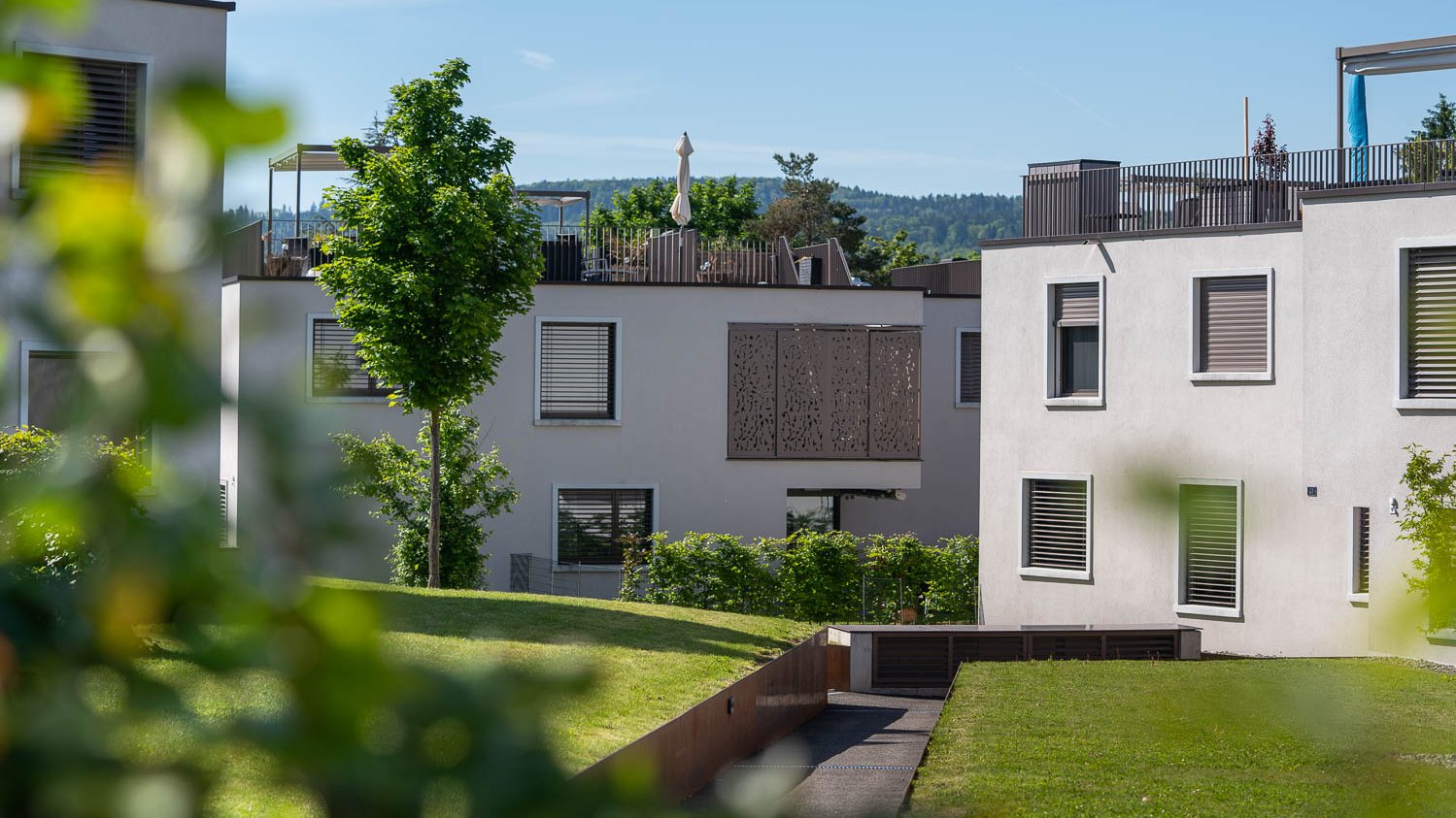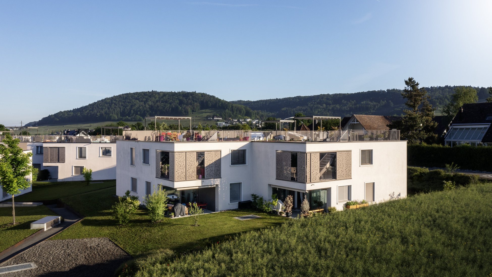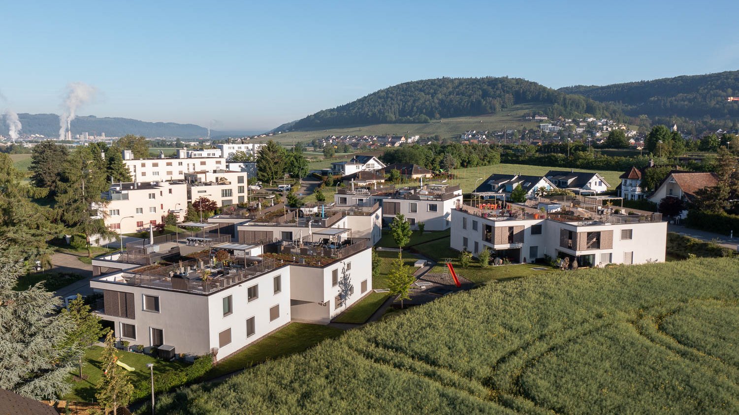 Comment intégrer au mieux un lotissement à une communes de 3900 âmes? En créant un nouvel élément comme sur ce projet, mais en l’empêchant d’avoir un impact délétère. Des maisons individuelles sont implantées dans l’environnement. Les concepteurs ont construit les quatre nouveaux immeubles de 27 appartements au total dans la largeur plutôt que dans la hauteur pour en faire un hameau. Chaque bâtiment dispose de trois étages et chaque appartement est équipé d’une terrasse de toit, d’une loggia au rez-de chaussée ou d’une terrasse couverte. Il en résulte un ensemble harmonieux et apaisant.