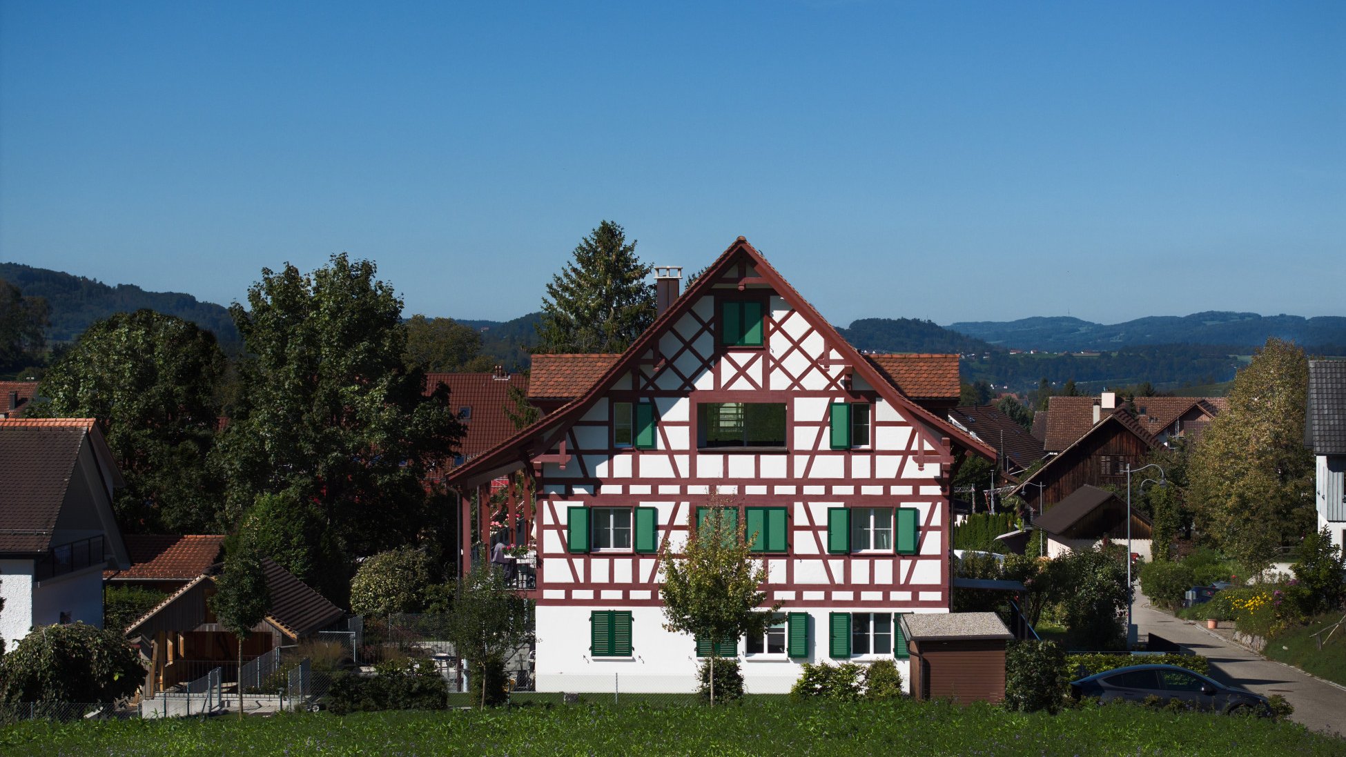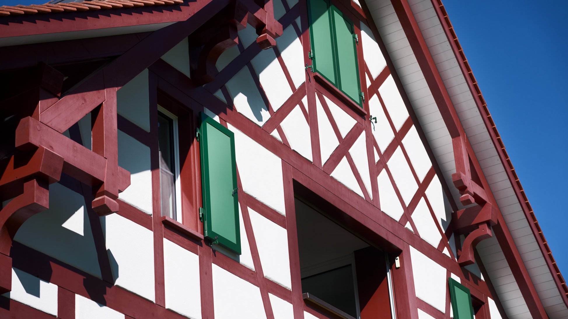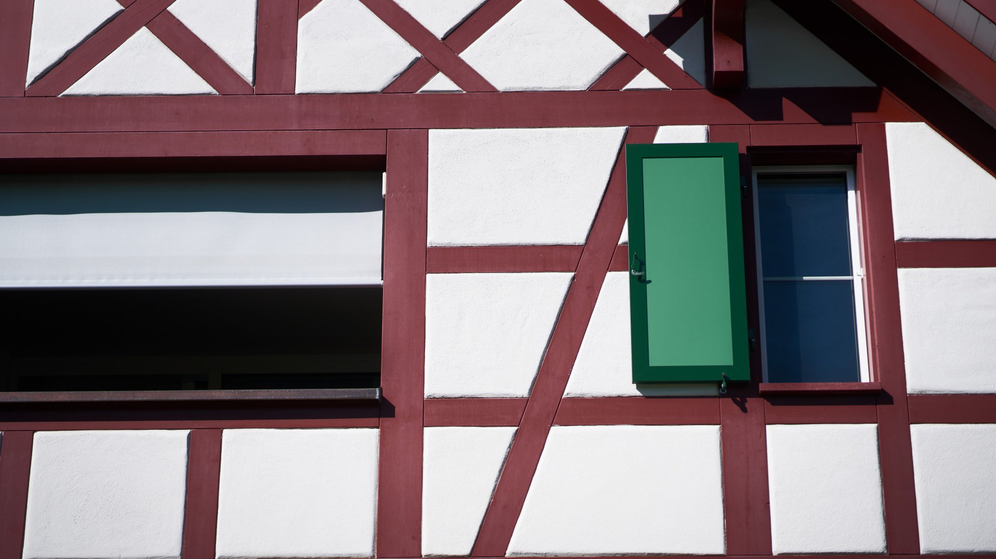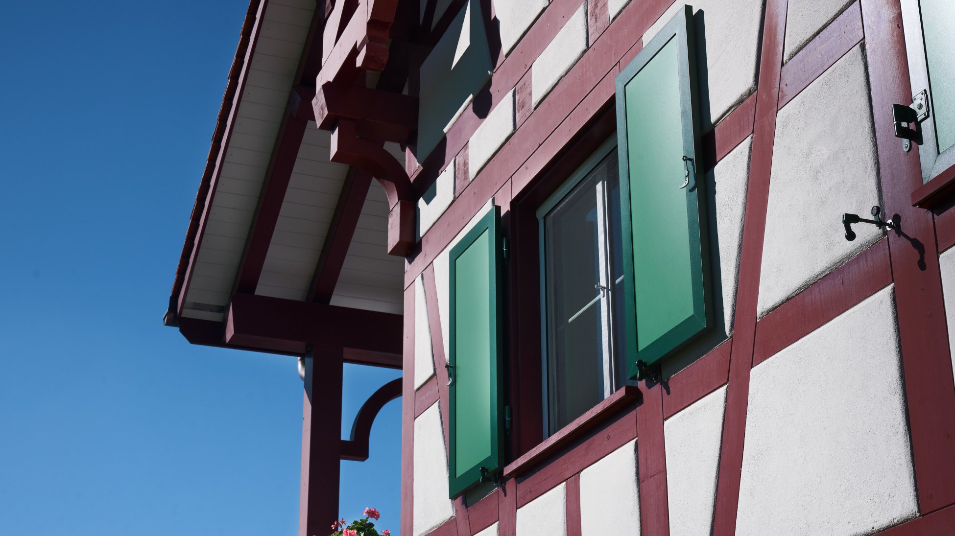 Cette maison à colombages très particulière se situe dans la commune idyllique de Dorf, entre Winterthour et Schaffhouse. À première vue, on dirait qu’elle est plusieurs fois centenaire, qu’elle a été mise sous protection du patrimoine culturel et qu’elle vient d’être rénovée. En y regardant de plus près, on se rend compte qu’il s'agit d’un bâtiment neuf. Pour la direction des travaux, ce n’était cependant pas une entreprise ordinaire, puisque l’édifice se situe dans la zone de protection des sites ruraux.Schenker Storen a été chargée de l’ombrage par le maître d’ouvrage, Landolt & Co Totalunternehmung RDN. Dans ce cas, la disponibilité de volets «à l’ancienne» a joué dans Ia passation de la commande un rôle important que Schenker Storen a pu assumer grâce à son entreprise partenaire au sein du groupe. Les défis à surmonter pour cette commande concernaient surtout la précision, tant au niveau du montage que du timing.