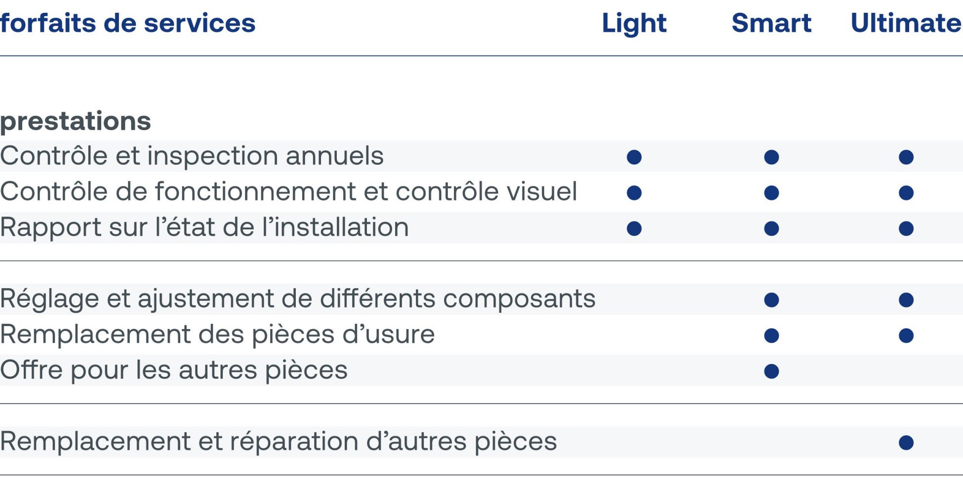Le forfait de services Light vous permet, grâce à un contrôle et à une inspection annuels par nos techniciens de service qualifiés, de planifier de manière fiable et de prolonger la durée de vie de votre installation.