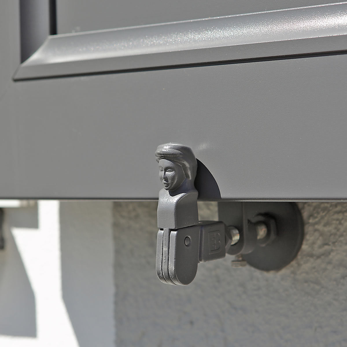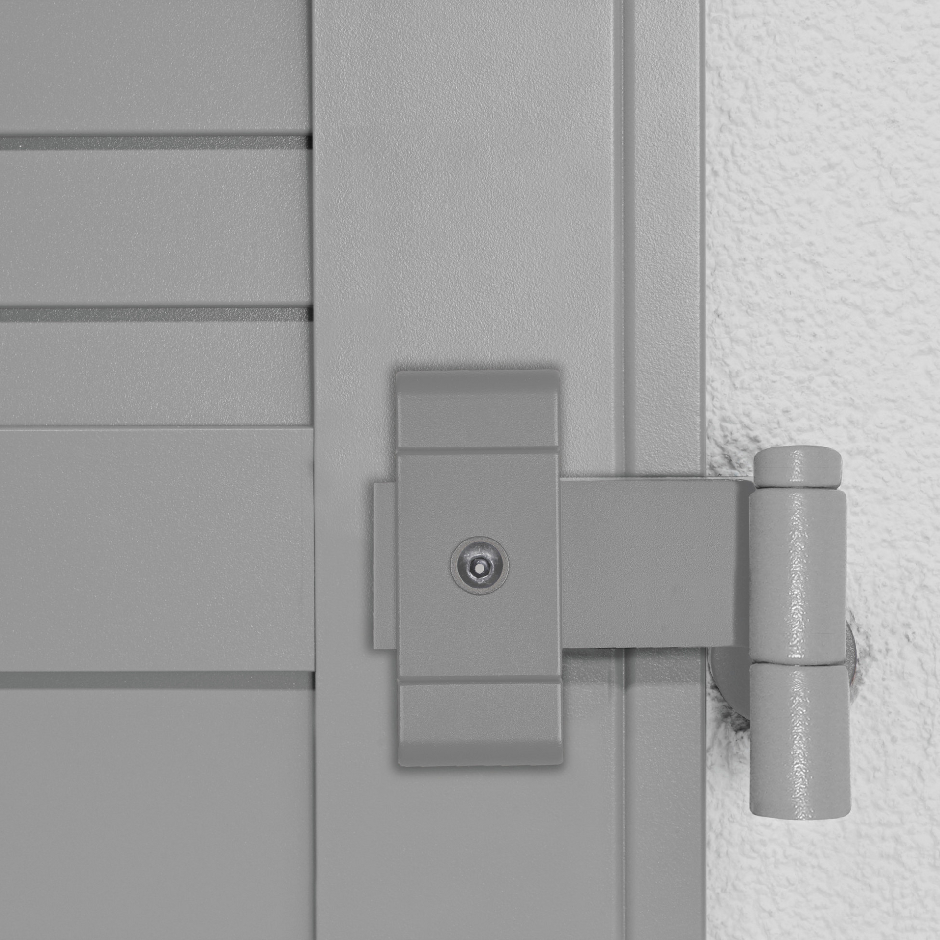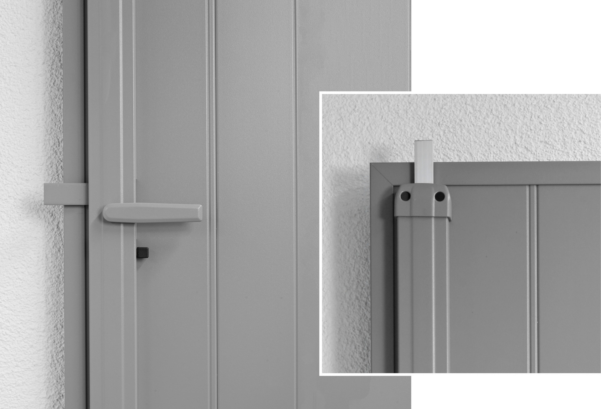 Des volets battants formés de lamelles fixes contiennent au moins un champ assorti de lamelles fixes. Indépendamment de celui-ci, d’autres champs peuvent être fermés à l’aide de plaques d’aluminium (lisses ou rainurées dans la longueur ou en travers). Deux champs ou plus sont séparés par une frise longitudinale ou transversale.