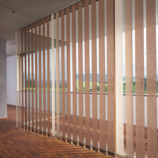 En version «diviseurs d’espace», les jalousies verticales sont guidées dans une barre supérieure ou inférieure et sont tendues de manière fixe. La tenture du store peut être orientée et décalée individuellement. Le profil continu assure un fonctionnement silencieux et sûr. Le client peut le commander anodisée ou thermopoudrée. Le paquet de tenture peut être positionné et ouvert à gauche ou à droite, en une ou en plusieurs parties.