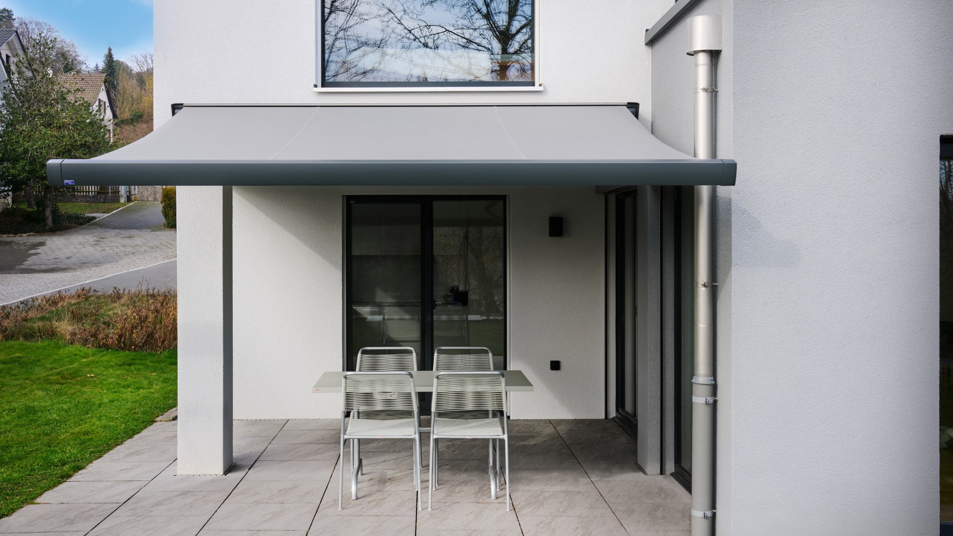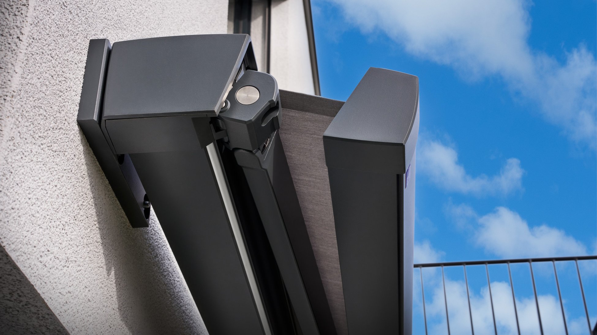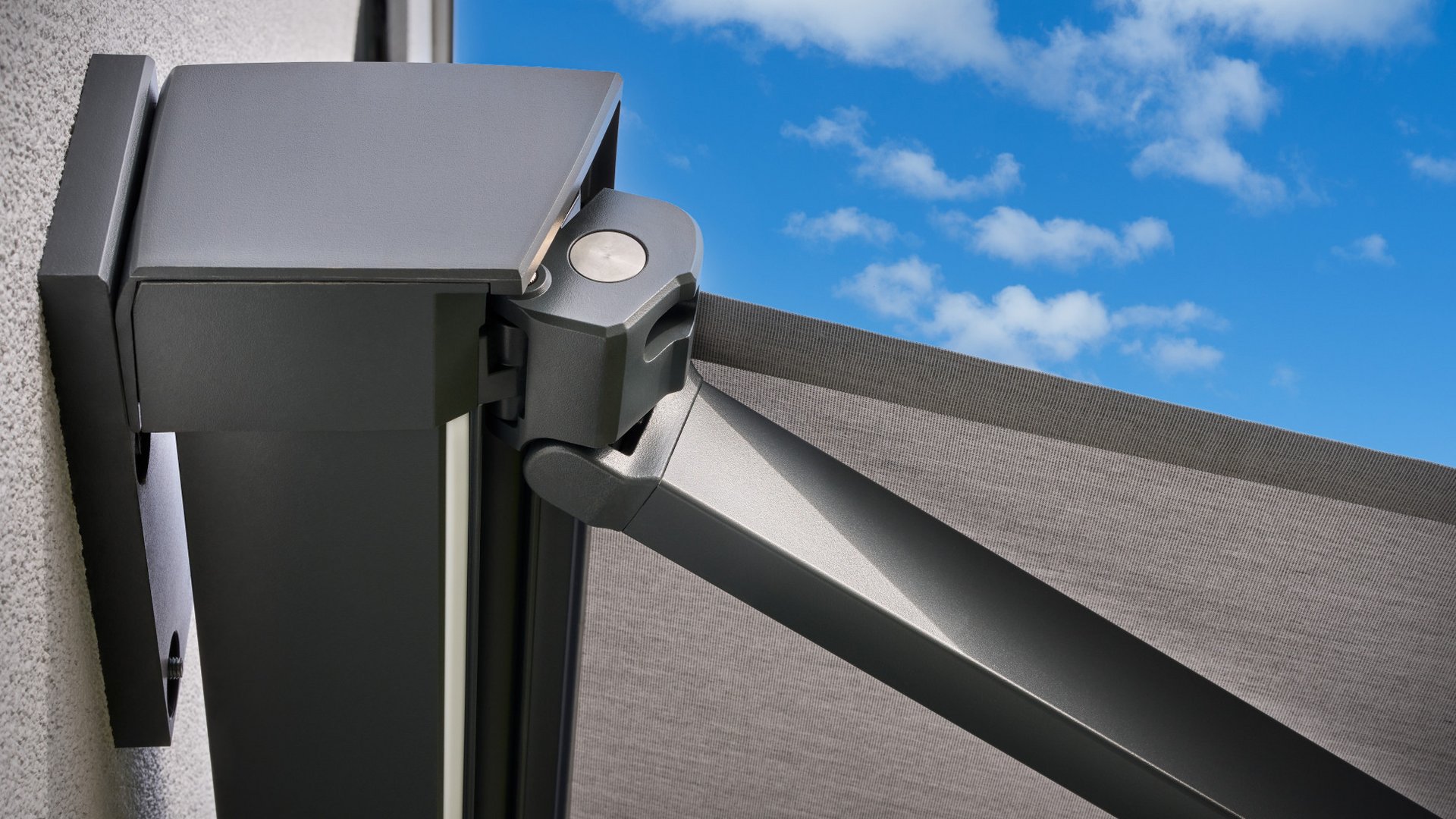 La KKM 7, le modèle destiné aux grandes terrasses. Sous forme d’installation individuelle, elle permet de couvrir une surface d’ombrage impressionnante de 28 m2 avec une largeur maximale de 7 m et une projection pouvant atteindre 4 m. Elle peut également être couplée à un autre système, si bien que la largeur peut atteindre 14 m. Lorsqu’elle est fermée, la KKM 7 affiche des dimensions de cassette de 16,5 cm de haut et de 26,1 cm de profondeur, console incluse. La console de fixation s’adapte de manière optimale aux dimensions de la cassette pour qu’elle disparaisse entièrement derrière la cassette élégante.