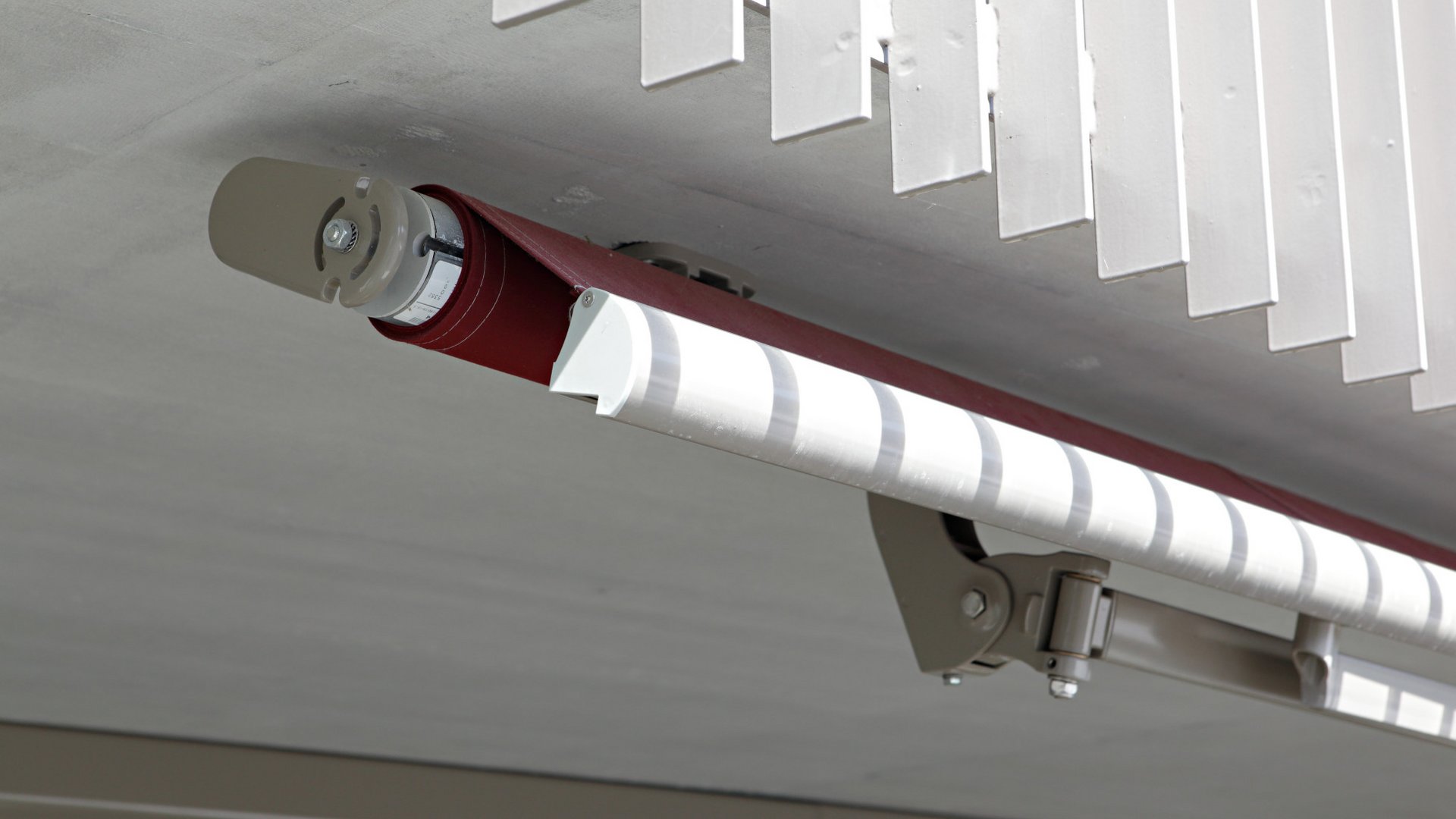 La marquise normalisée ouverte se fixe grâce à la console robuste. Celle-ci peut être fixée frontalement (montage en façade) ou tournée de 90° pour être installée au plafond. Les dimensions extérieures de la marquise normalisée varient en fonction du type de montage. Lorsqu’elle est fermée, la marquise normalisée affiche une profondeur d’environ 285 mm et une hauteur de 250 mm dans le cas de la variante du montage en façade. Si elle est montée au plafond, la profondeur est d’environ 320 mm et la hauteur atteint 270 mm. Les dimensions indiquées s’appliquent à la variante à actionnement motorisé.