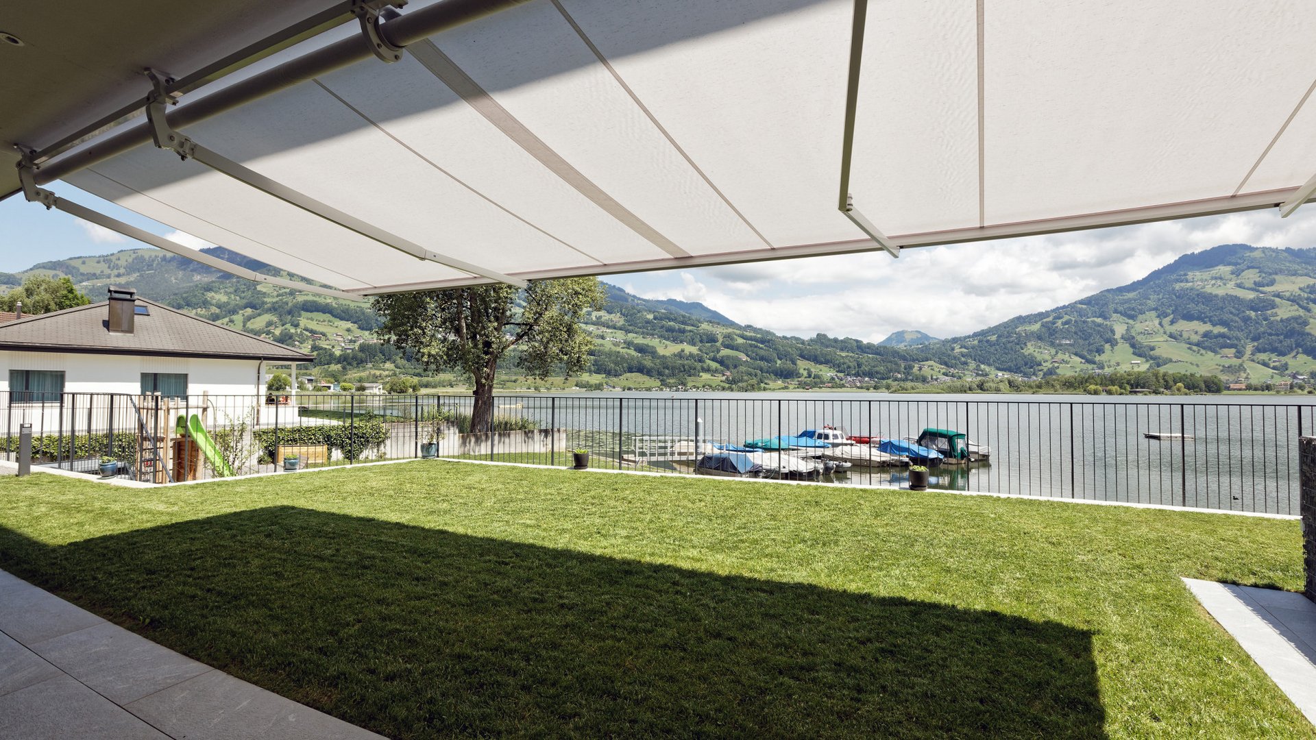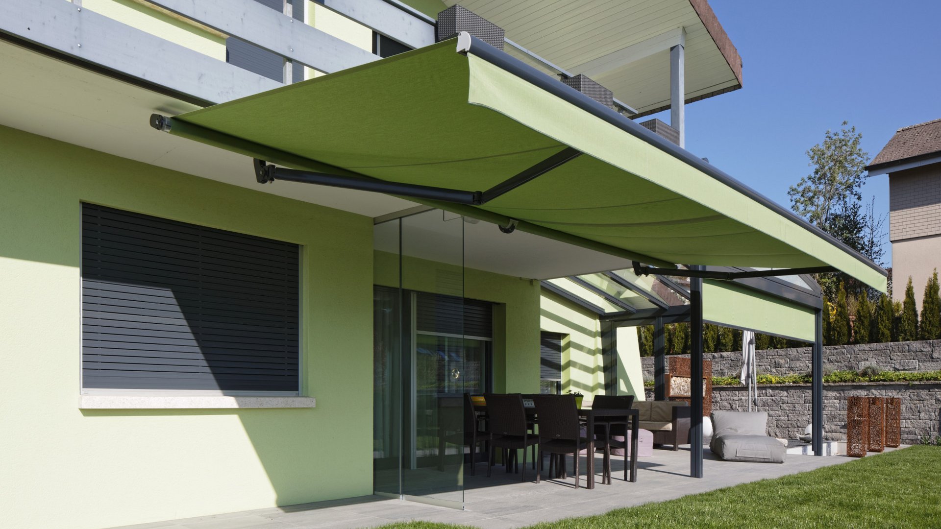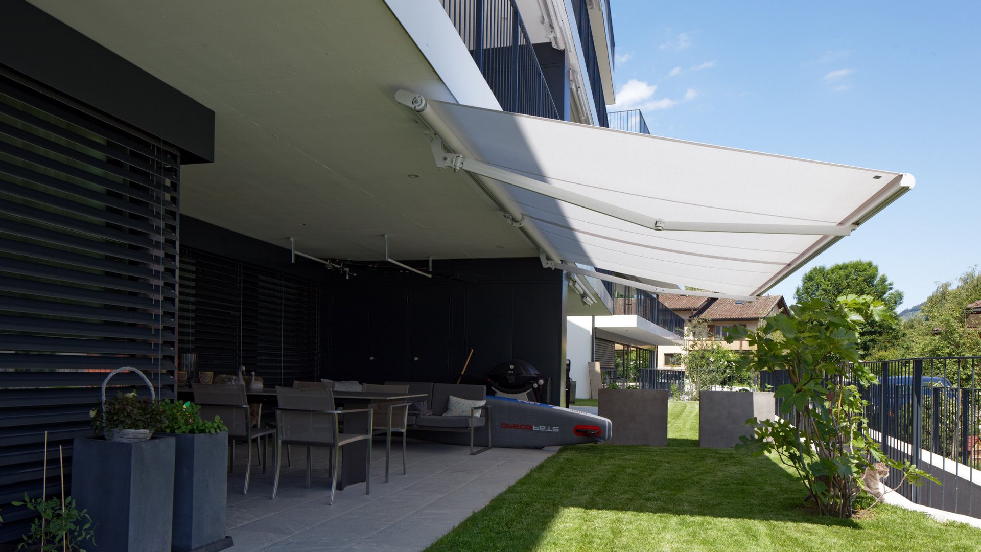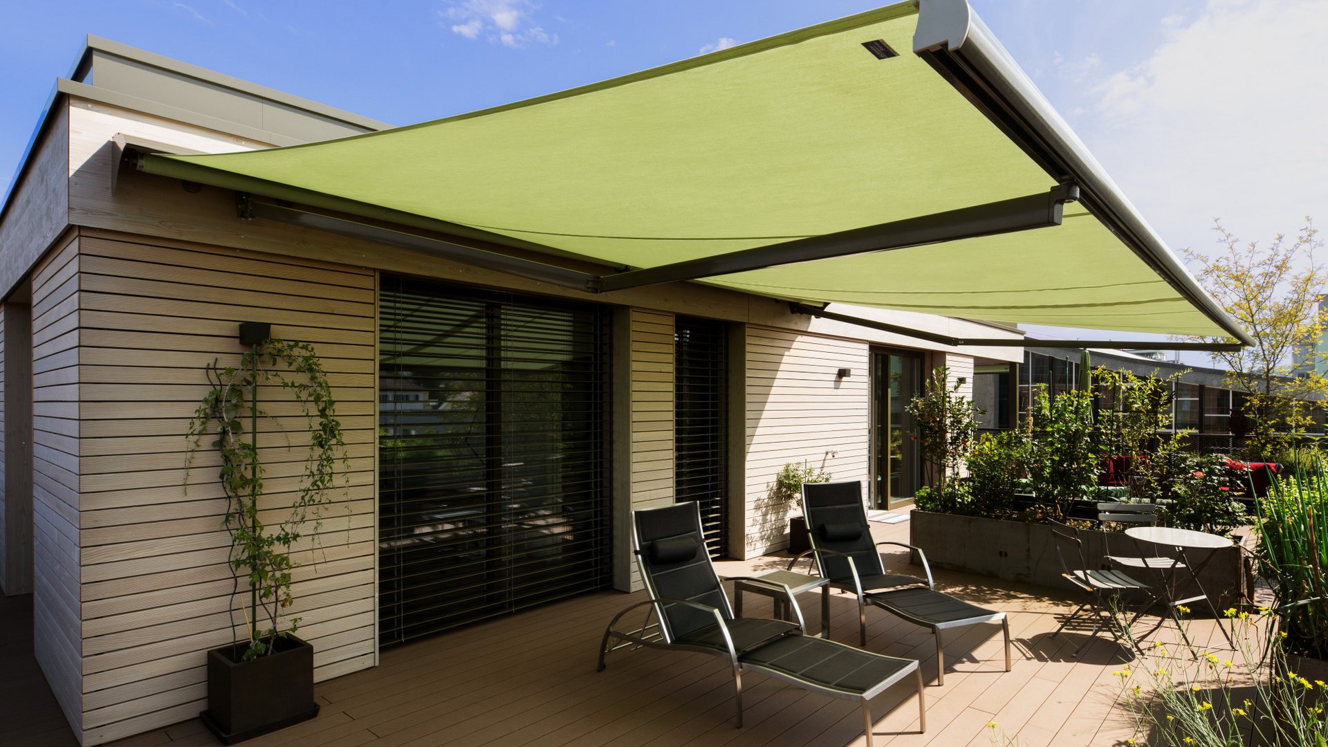 Aucune terrasse ni aucune situation de construction n’est trop grande ou trop exigeante pour notre NGM 20. Elle constitue en effet une protection contre le soleil fiable et une rareté pour cette taille grâce à l’impression surface d’ombrage couverte pouvant atteindre 80 m². La marquise normalisée ouverte convient particulièrement bien sur des maisons individuelles ou des immeubles ainsi que sur des locaux commerciaux et des restaurants. Le tube porteur qui permet de grandes dimensions tout en garantissant une stabilité et une répartition des efforts maximales distingue le produit. La NGM 20 s’adapte par ailleurs merveilleusement à des besoins individuels grâce à des extensions telles qu’un volant abaissable ou un auvent approprié.