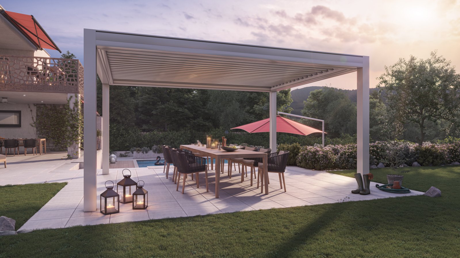 Notre pergola bioclimatique allie esthétique et climat intérieur à une technologie raffinée. De l’air chaud s’écoule vers le haut au travers des lamelles tandis que l’air refroidissant s’achemine automatiquement jusqu’aux places assises en bas. Notre pergola bioclimatique assure ainsi en permanence des conditions idéales de ventilation et d’éclairage ainsi qu’un équilibrage naturel de la chaleur. La pergola bioclimatique constitue la solutions adaptée de protection contre toutes les conditions météorologiques dans les jardins et sur les terrasses de grande superficie. Il peut être complété par de nombreuses options de confort telles qu’un éclairage LED intégré et des stores en toile verticaux latéraux pour former une oasis tranquille. Il s’intègre au mieux à n’importe quel environnement, il est imperméable à l’eau et il crée une expérience magique de plein air à tout moment et en tout lieu grâce à ses lamelles à rotation progressive.