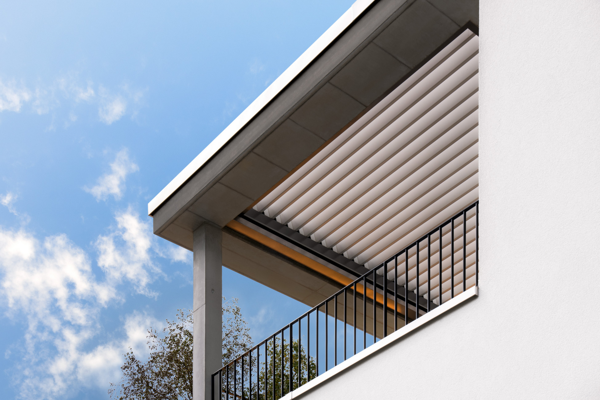 Dans cette variante, le toit à lamelles se monte sur la façade dans la longueur et ne repose que sur deux poteaux. Sur cette variante, la rotation des lamelles s’effectue parallèlement au mur de la maison, si bien que la régulation de la lumière et l’ombrage peuvent être ciblés à tout moment à l’intérieur.