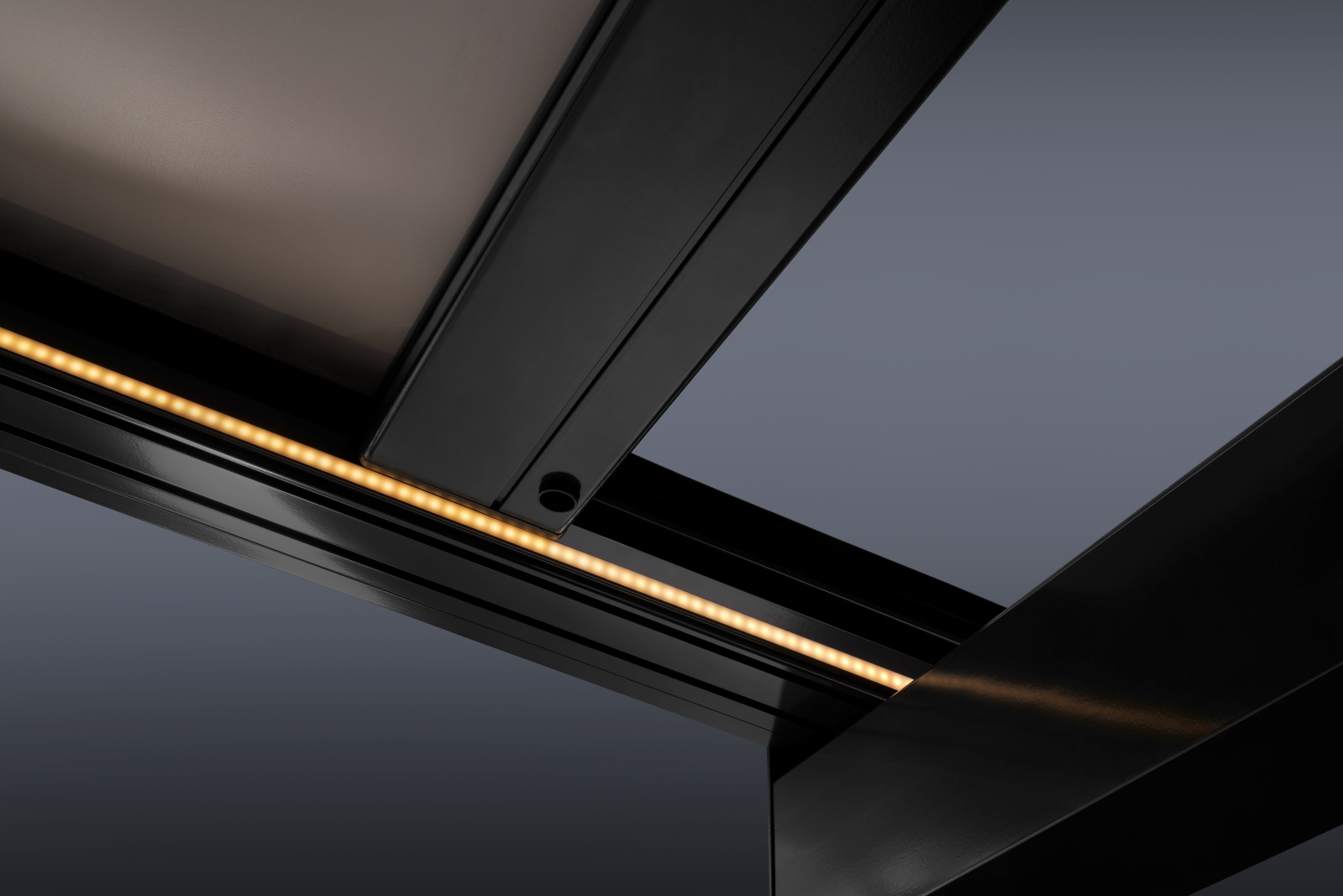 La toile de marquise parfaitement tendue procure une ombre agréable et crée une atmosphère protégée et douillette en plein air. Cette pergola toile enroulable s’intègre harmonieusement dans différentes configurations de façades et de jardins grâce à sa forme élancée et intemporelle. Des options sont disponibles pour en améliorer le confort.
