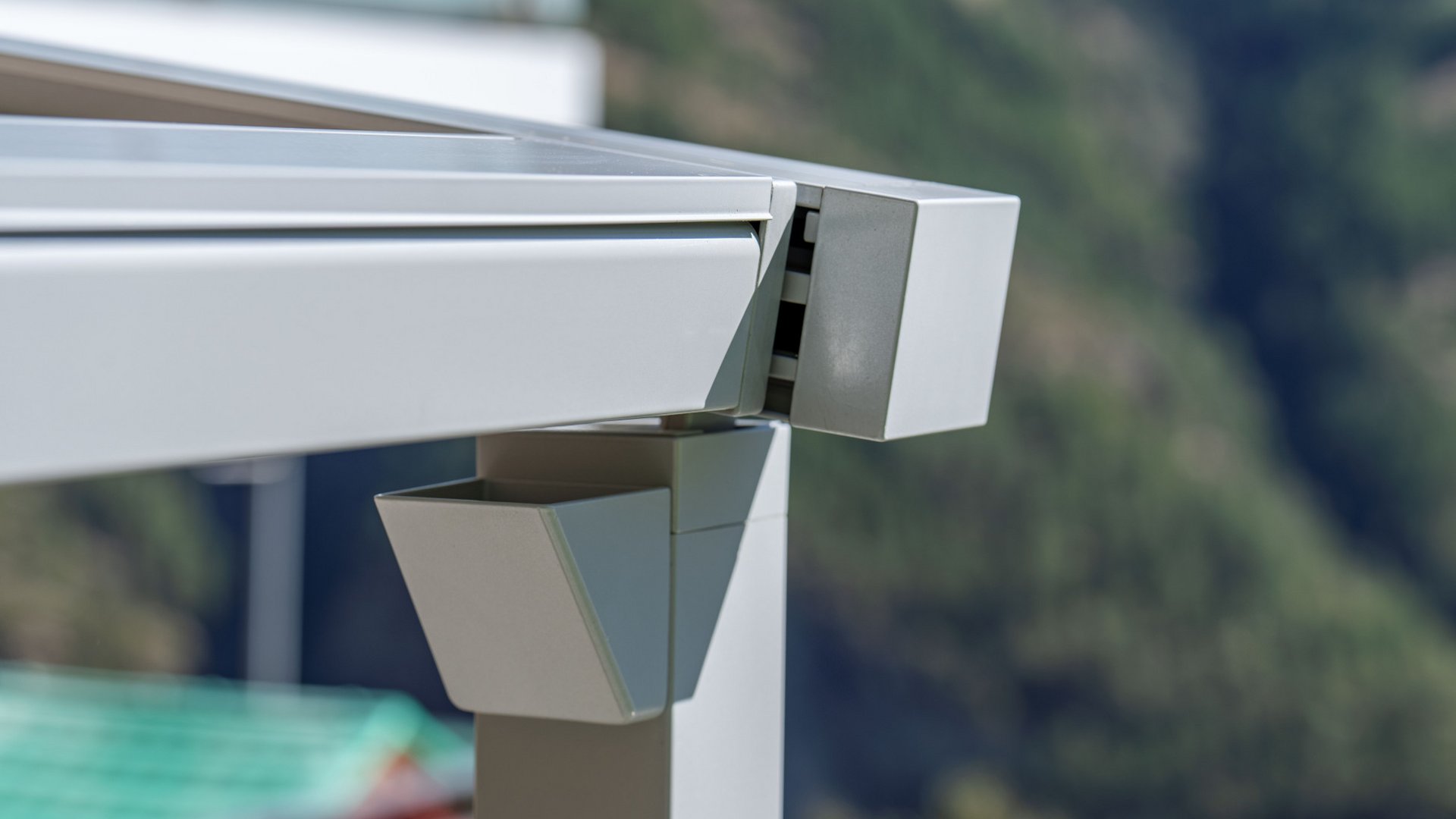 La pergola toile enroulable Hydra est montée de série en affleurement sur la façade. Deux équerres sont fixées pour chaque installation. Les dimensions minimales des profilés contribuent à une esthétique harmonieuse.