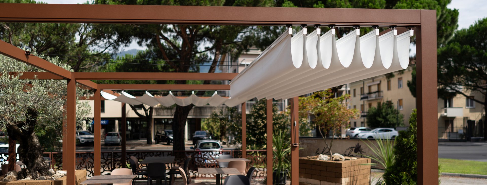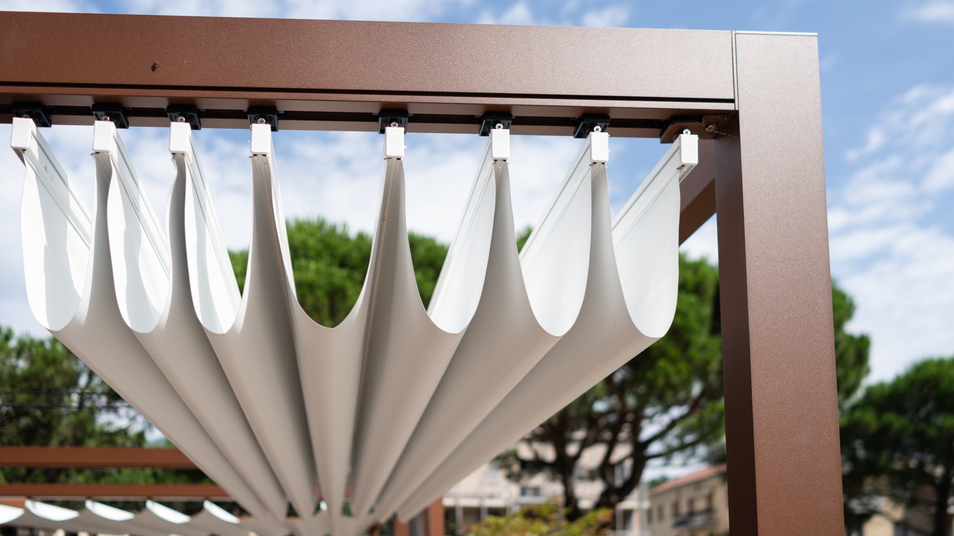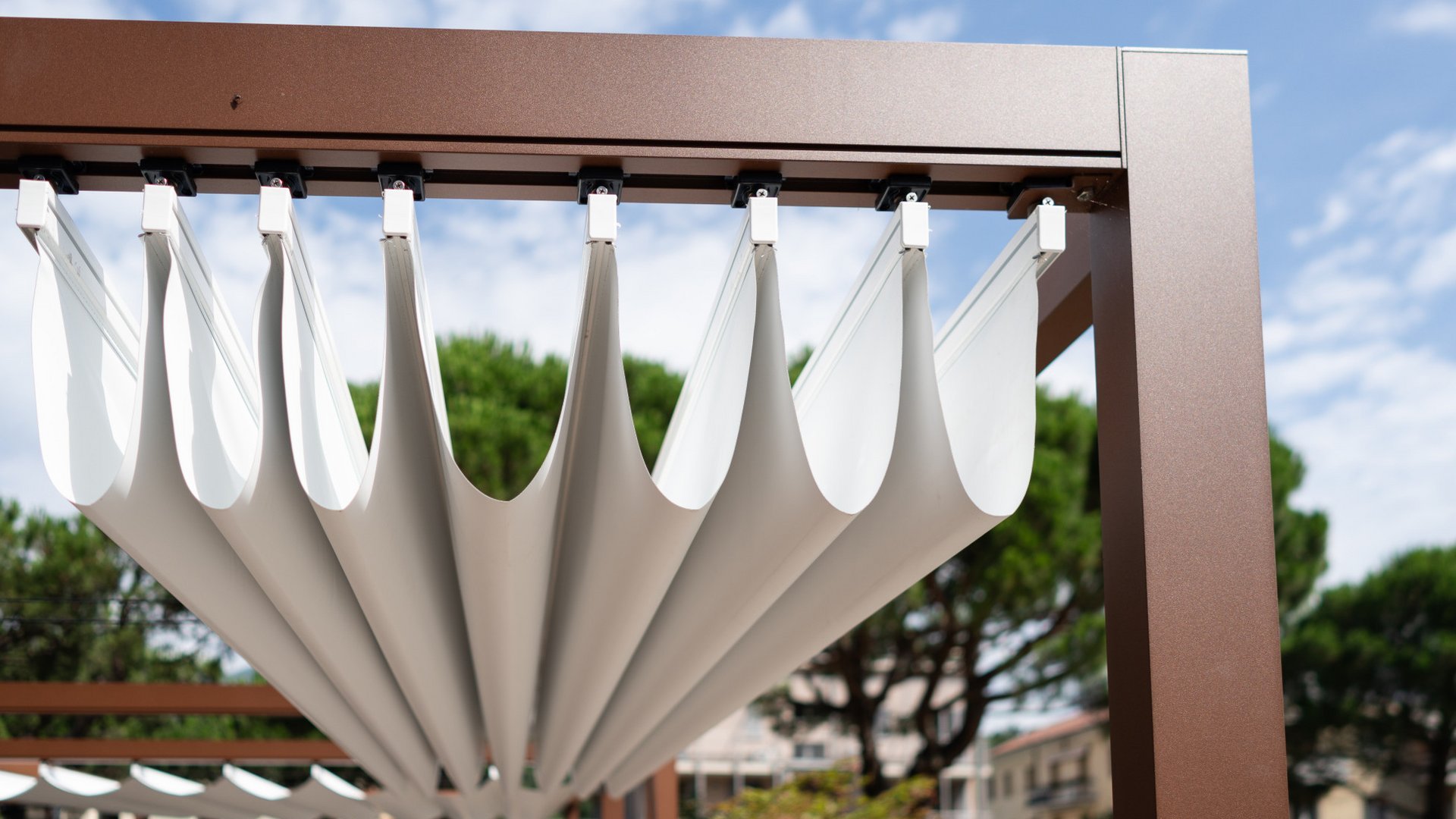 Le toit rétractable en toile fournit une ombre agréable et crée une atmosphère accueillante exactement là où l’on recherche un ombrage flexible et pratique.