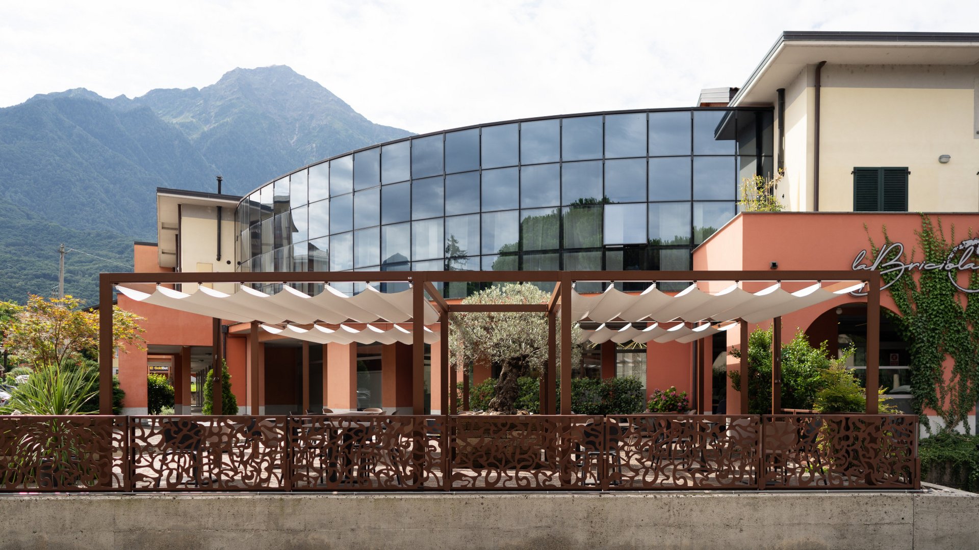 La pergola toile rétractable est montée de série en affleurement sur le mur de la maison et s’intègre harmonieusement à l'architecture de la terrasse et de la façade.