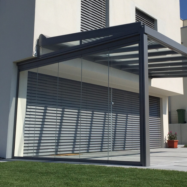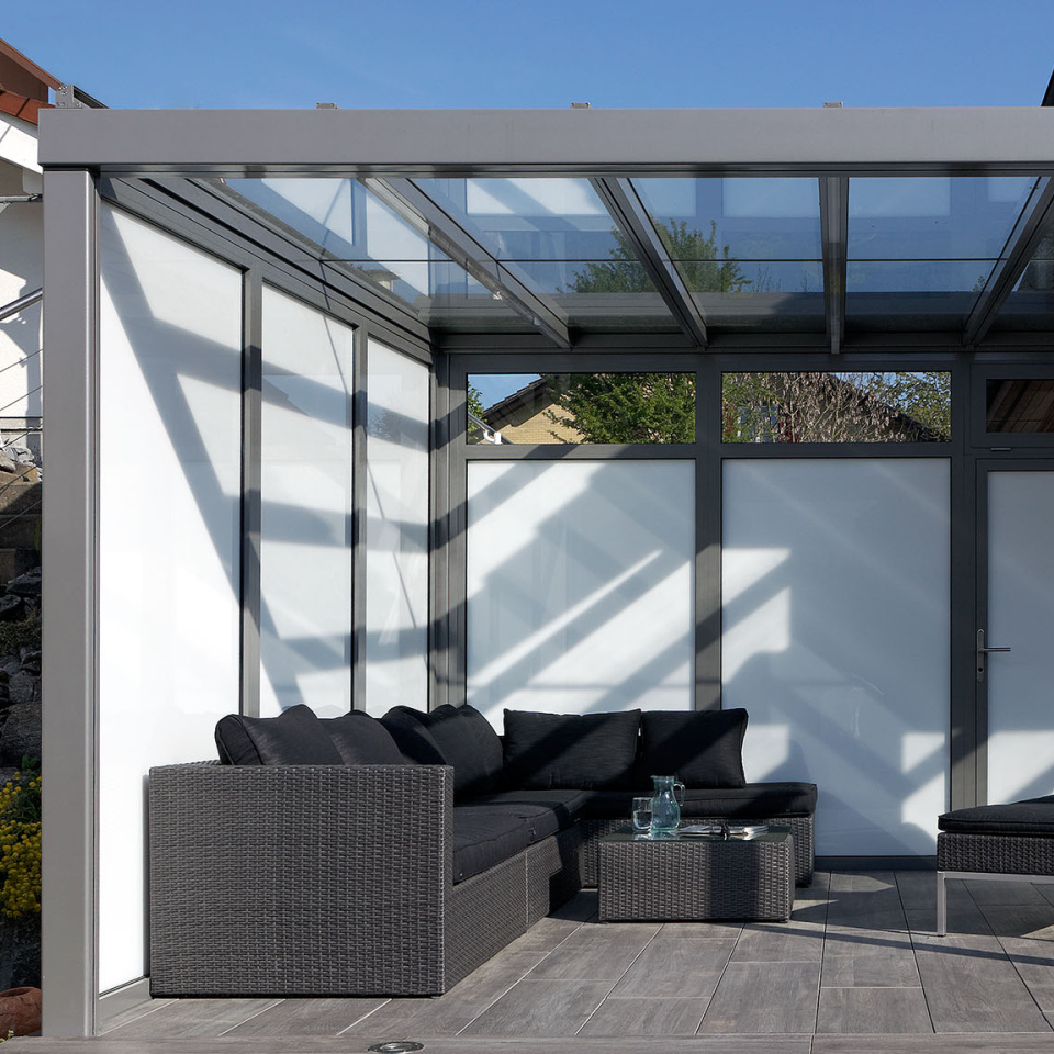Note toit de terrasse est un toit vitré exemplaire. Le toit vitré transparent se fixe directement au mur de la maison et permet aux utilisateur de profiter d’une vue dégagée du ciel sans interrompre la pénétration de lumière dans la pièce à vivre. Il convient à merveille en tant que protection permanente contre toutes les conditions météorologiques. Il peut être rangé toute l’année sous un meuble ou sous le barbecue. Lors de chaudes journées estivales, la marquise de toit garantit un refroidissement et un ombrage efficaces. Le toit de terrasse filigrane, mais robuste s’intègre harmonieusement aux architectures les plus diverses . Il convient donc parfaitement pour les terrasses couvertes de petite à moyenne taille ainsi que pour les terrasses de toit. Grâce à un éclairage LED à puissance variable et à des stores verticaux latéraux, il crée une impression de lounge parfaite.