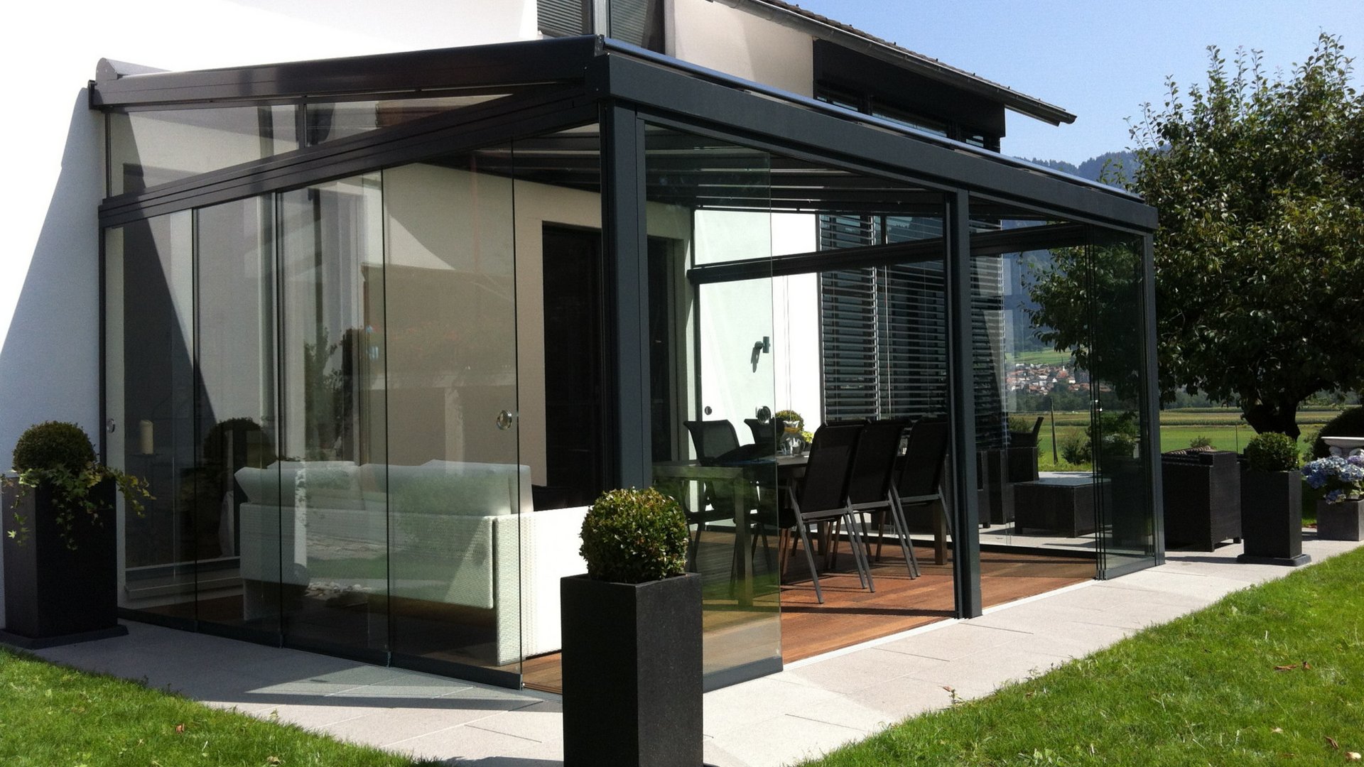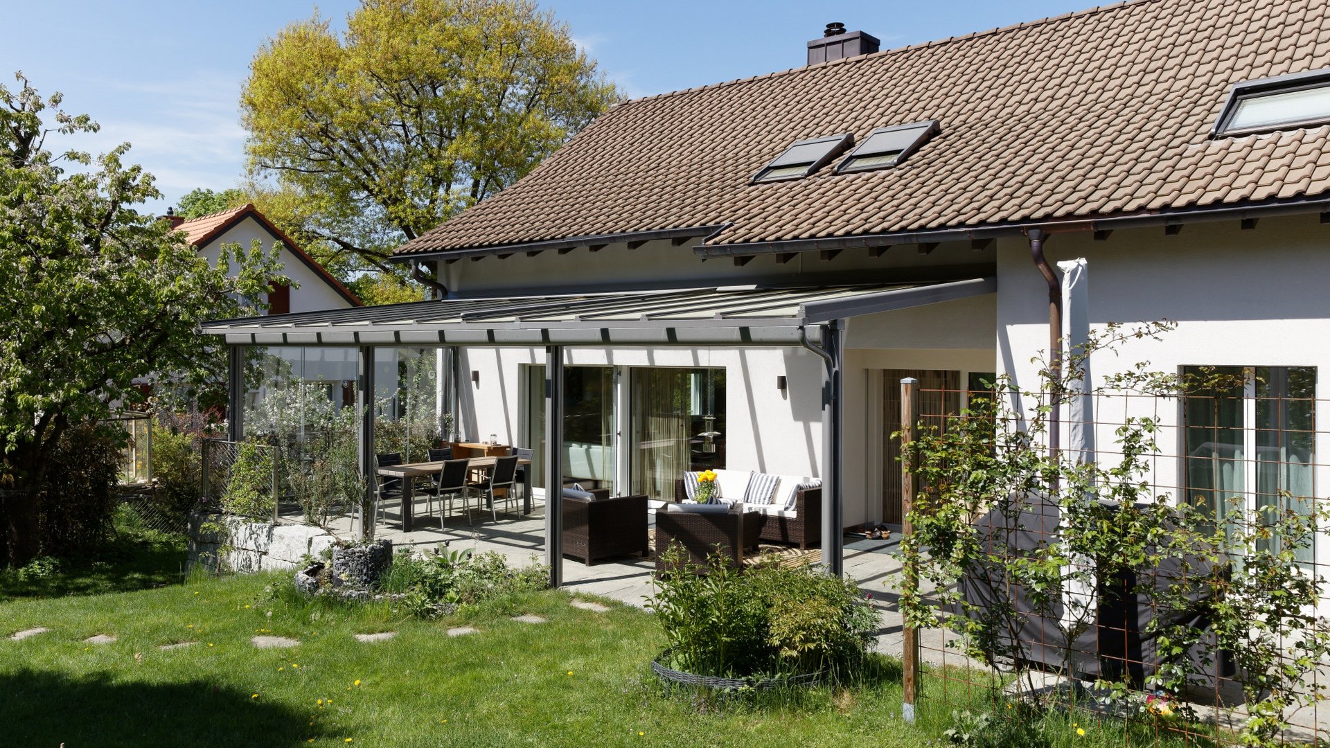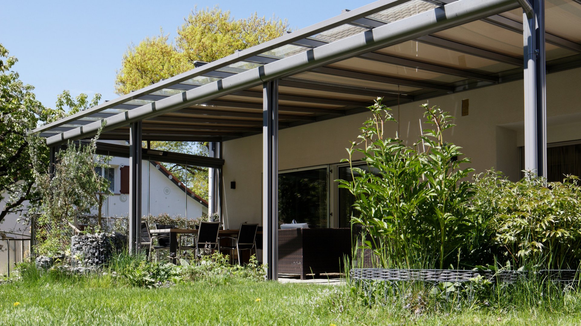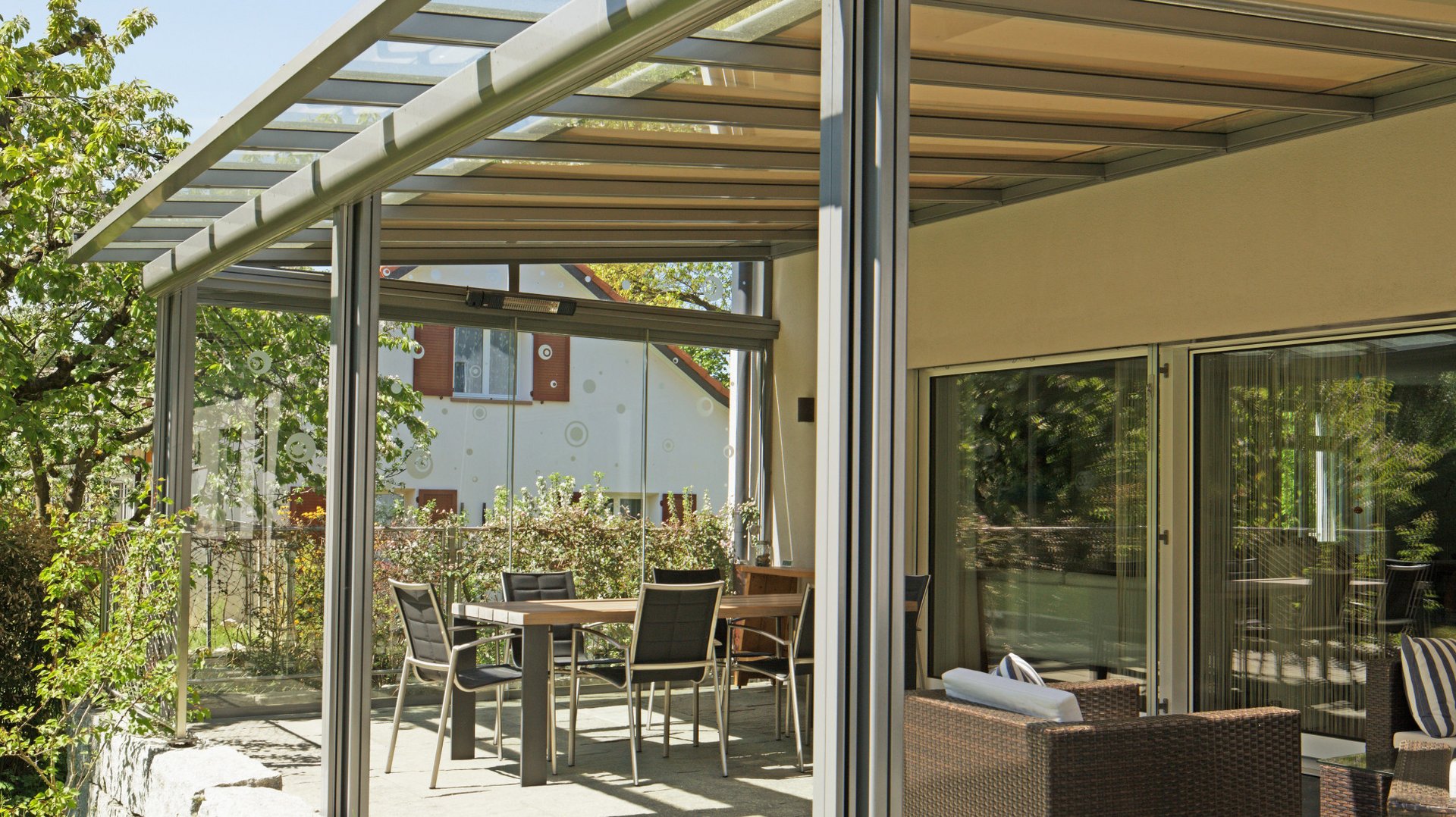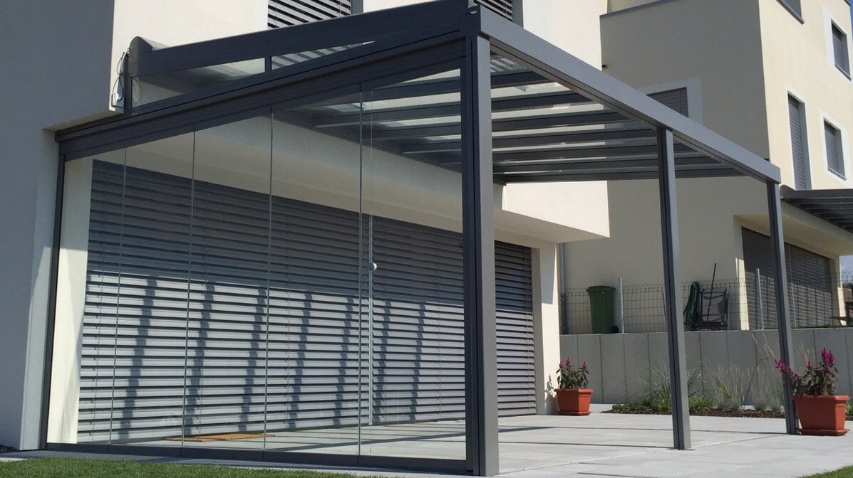 Note toit de terrasse est un toit vitré exemplaire. Le toit vitré transparent se fixe directement au mur de la maison et permet aux utilisateur de profiter d’une vue dégagée du ciel sans interrompre la pénétration de lumière dans la pièce à vivre. Il convient à merveille en tant que protection permanente contre toutes les conditions météorologiques. Il peut être rangé toute l’année sous un meuble ou sous le barbecue. Lors de chaudes journées estivales, la marquise de toit garantit un refroidissement et un ombrage efficaces. Le toit de terrasse filigrane, mais robuste s’intègre harmonieusement aux architectures les plus diverses . Il convient donc parfaitement pour les terrasses couvertes de petite à moyenne taille ainsi que pour les terrasses de toit. Grâce à un éclairage LED à puissance variable et à des stores verticaux latéraux, il crée une impression de lounge parfaite.