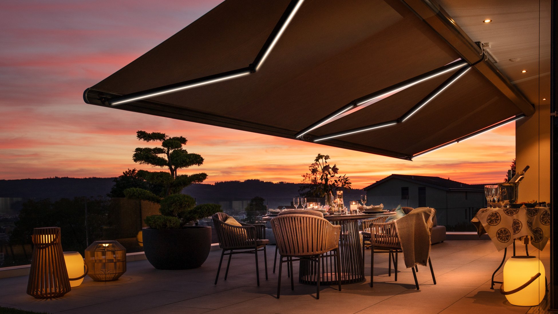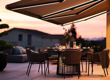 È proprio per questo che abbiamo realizzato la tenda da sole KGM 6+ con illuminazione a LED dimmerabile: per poter prolungare il piacere di stare all’aperto – dalle prime ore del mattino fino a tarda notte grazie agli speciali effetti luminosi.
